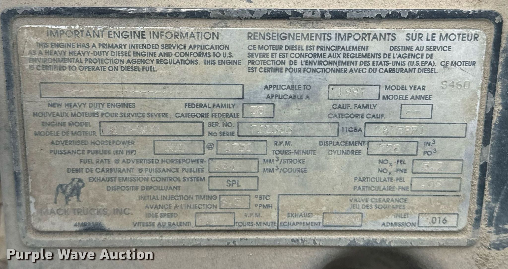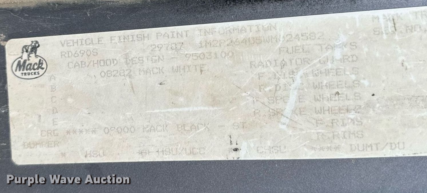 1998 Mack RD690S dump truck. Miles: 726 on odometer Actual mileage unknown, Hours: 39,413 on meter, VIN: 1M2P264C5WM024582. Engine Mack BM7-300, Displacement: 12.0L, Cylinders: 6, Fuel type: Diesel, HP: 300. Transmission Maxitorque T2080, Manual, Speed: 8. Chassis Axles: Triple, Pusher axle Steerable, Differential lock: Inter-axle, Suspension: Camelback, Brakes: Air, PTO. Interior AC, Heat. Features Dump bed Reed Co, 16' L x 101" W, Side height: 48", Bed type: Steel, Barrel, Roll tarp, Ram: Single, End gate: Air operated. Tires Front: 315/80R22.5, Rear: 11R22.5, Lift axle: 255/70R22.5. Notes Odometer replaced at 828,829 miles. Kansas title. Mileage has not been verified. Exempt will be written in the odometer disclosure on the title. Title distribution may be delayed up to 14 days from verification of funds. Bayer Construction Company. Manhattan, KS 66502