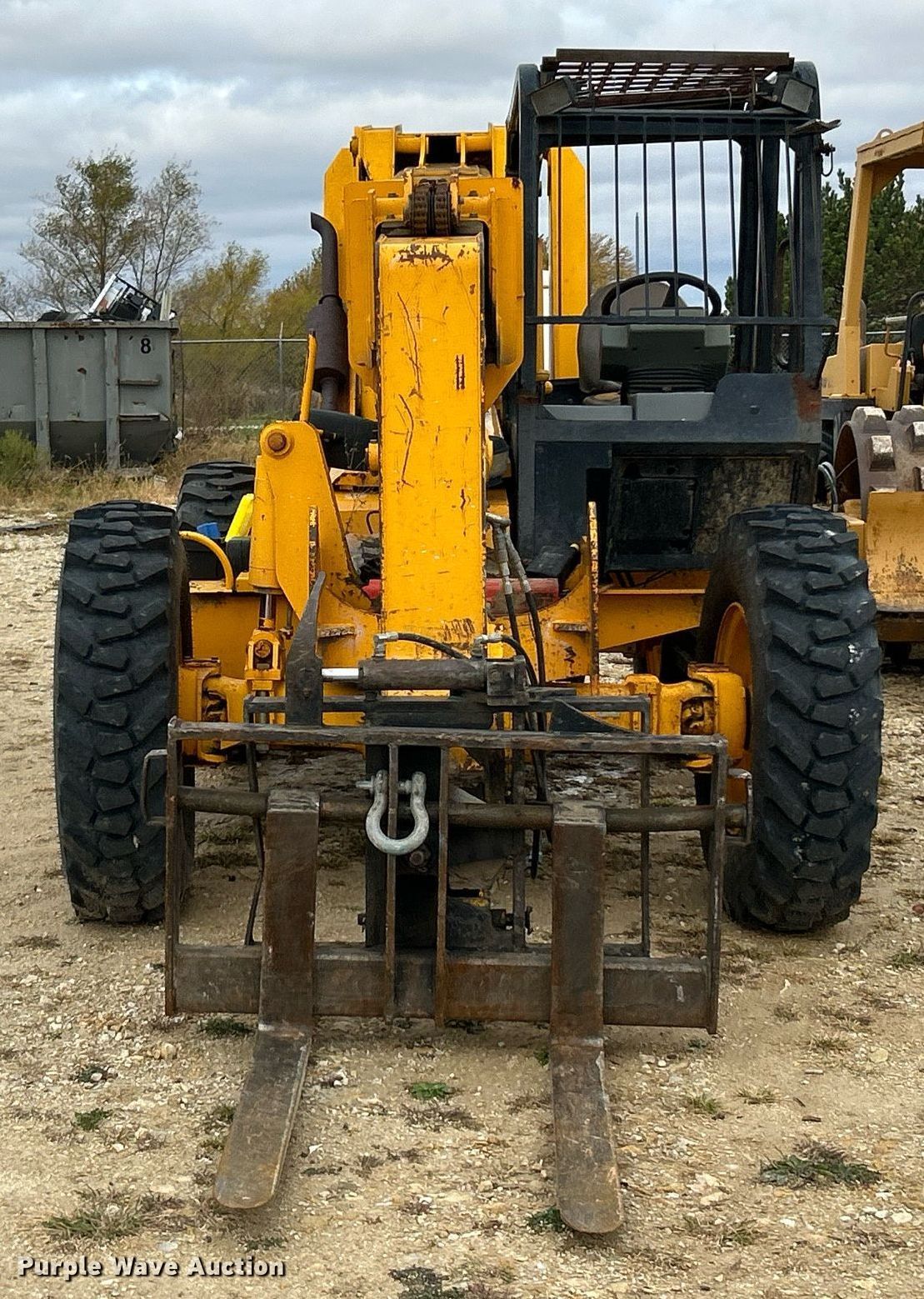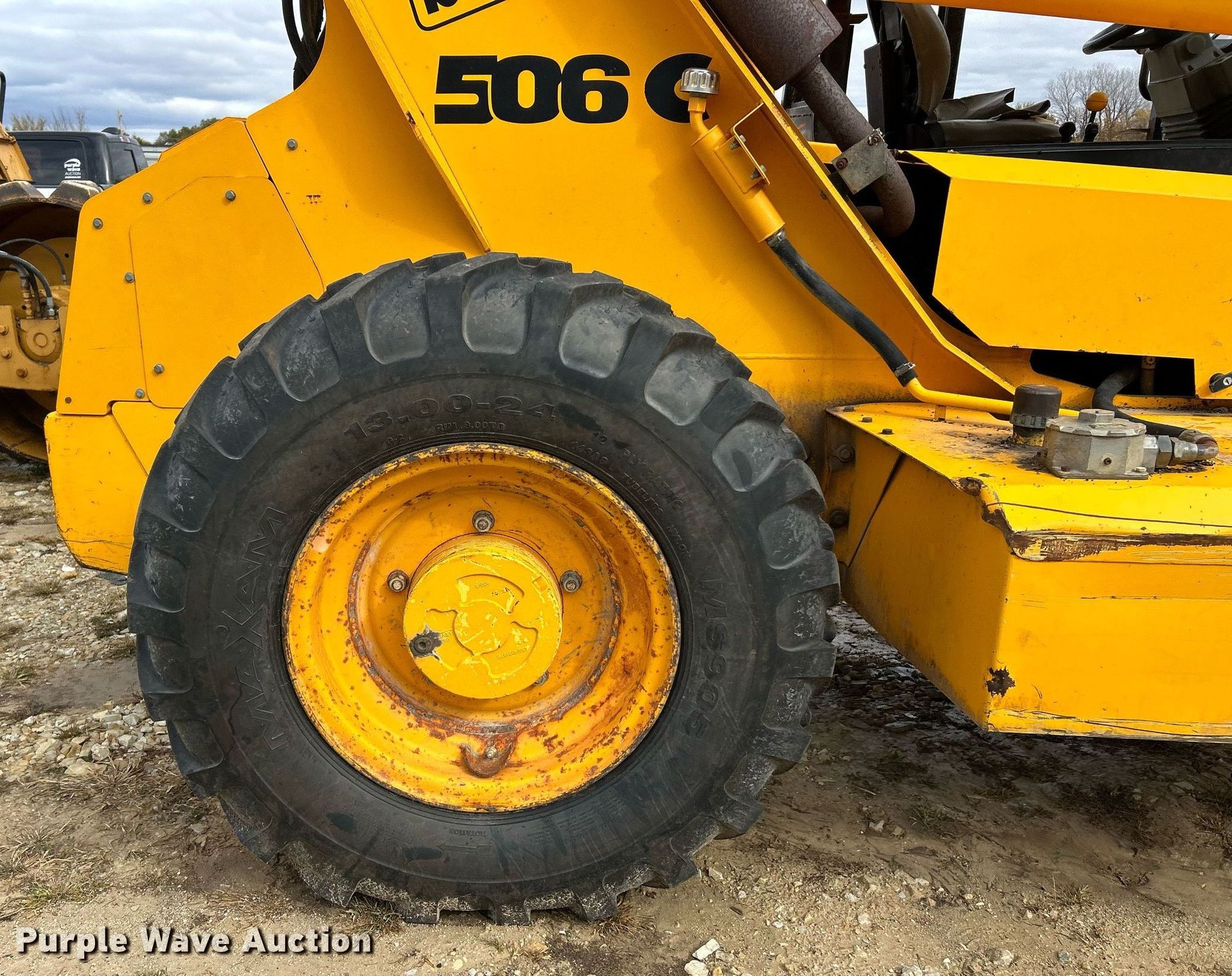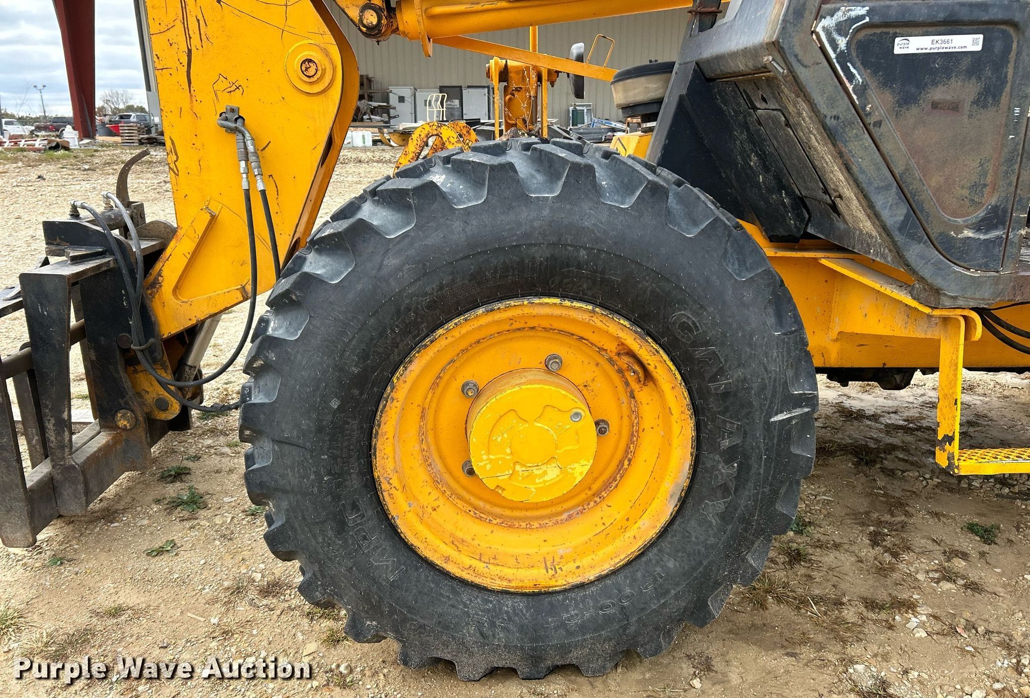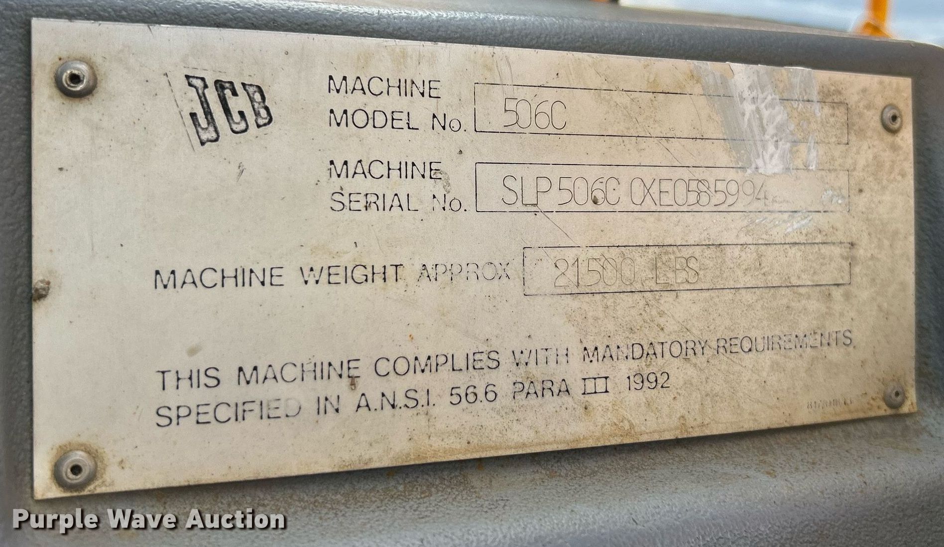1999 JCB 506C telehandler. Hours: 5,159 on meter, Serial: SLP506C0XE0585994. Engine JCB, Cylinders: 4, Fuel type: Diesel. Transmission Shuttle shift, Four wheel drive. Operators station OROPS, Steering: Crab, Four wheel. Features Maximum lift capacity: 6,000 lbs, Boom stages: 3, Fork length: 47", Auxiliary hydraulics, Tilt carriage, Hydraulic leveling. Tires Size: 13.00-24. Notes Engine issues. Hunter Modular Construction. Jonesburg, MO 63351