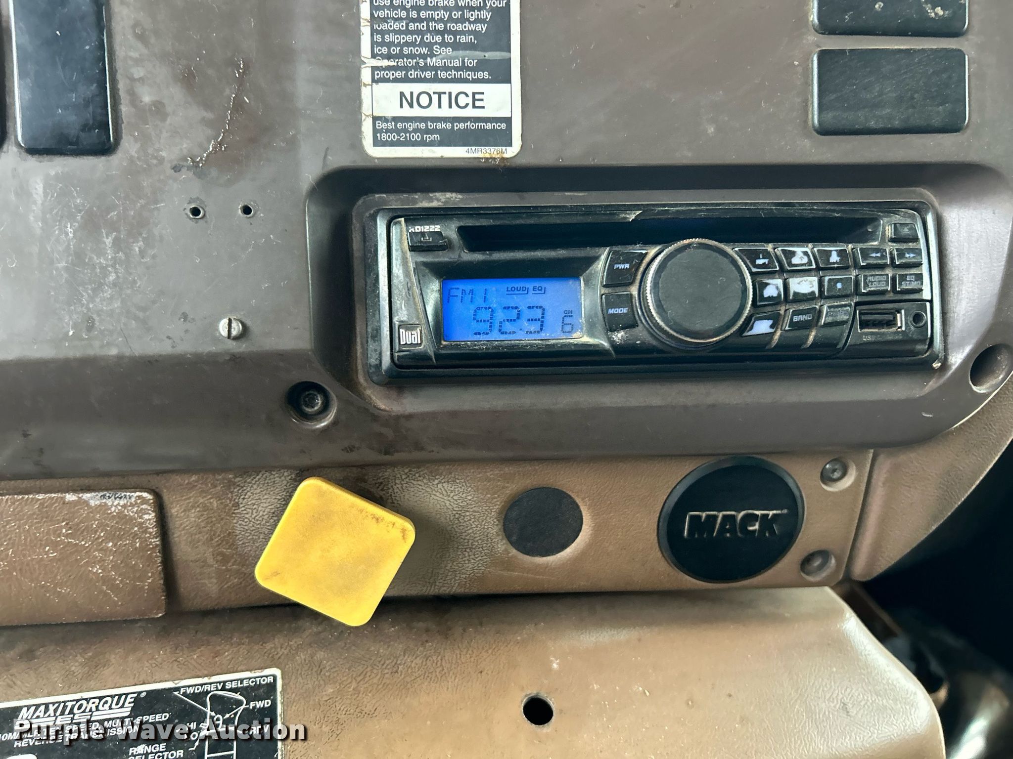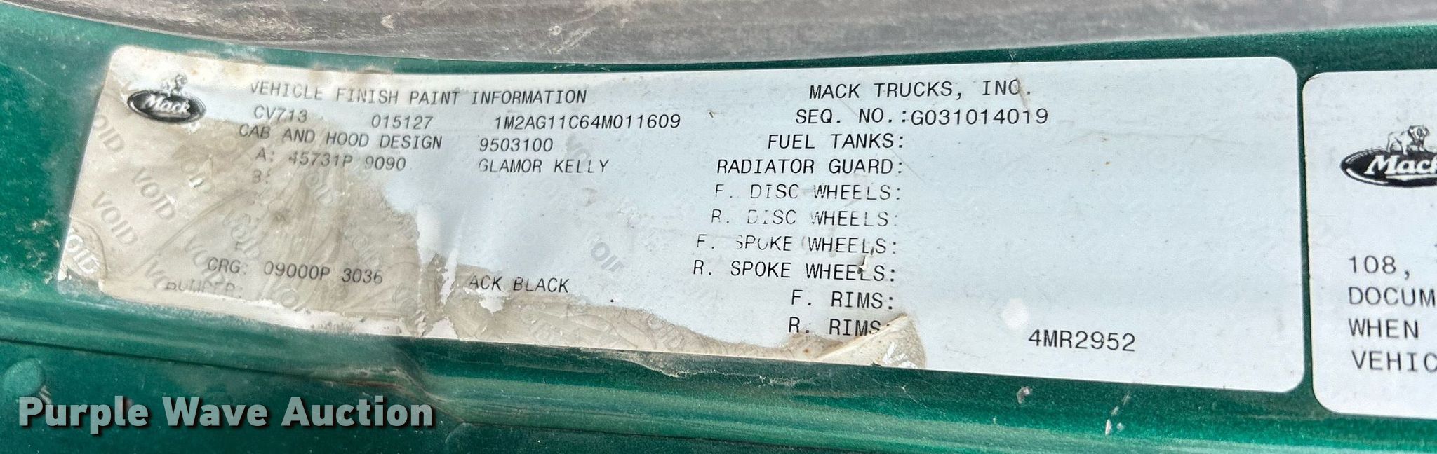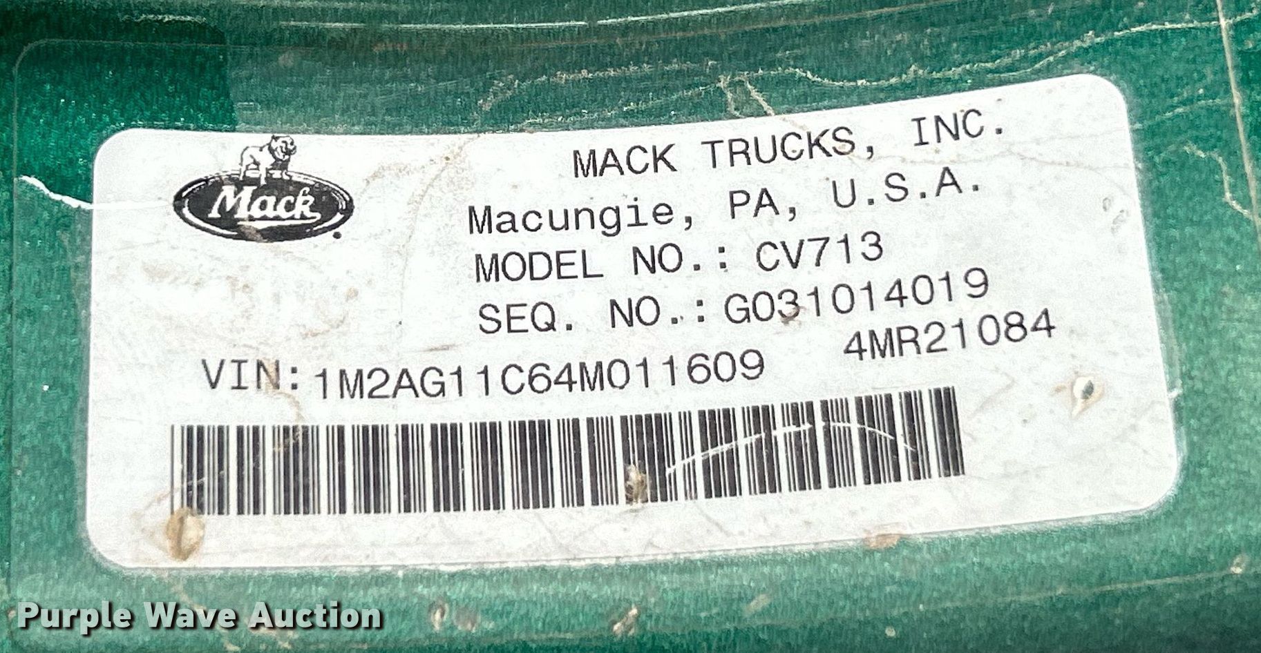 2004 Mack CV713 dump truck. Miles: 582,509 on odometer, Hours: 28,656 on meter, VIN: 1M2AG11C64M011609. Engine Mack, Displacement: 12.0L, Cylinders: 6, Fuel type: Diesel, HP: 370, Engine brake. Transmission Mack Maxitorque ES, Manual, Speed: 10. Chassis Double frame, Axles: Tandem, Differential lock: Inter-axle, Suspension: Camelback, Brakes: Air, PTO. Interior AC, Heat, Heated mirrors, Cruise control. Features Dump bed 16' L x 94" W, Side height: 45", Side board height: 10", Bed type: Steel, Roll tarp, Ram: Single, End gate: Air operated. Tires Front: 315/80R22.5, Rear: 11R22.5. Notes Decals will be removed prior to auction, Windshield chipped or cracked, Dash warning indicator: Fault code. Missouri title. Title distribution may be delayed up to 14 days from verification of funds. M&H Concrete Contractors Inc.. St. Peters, MO 63376