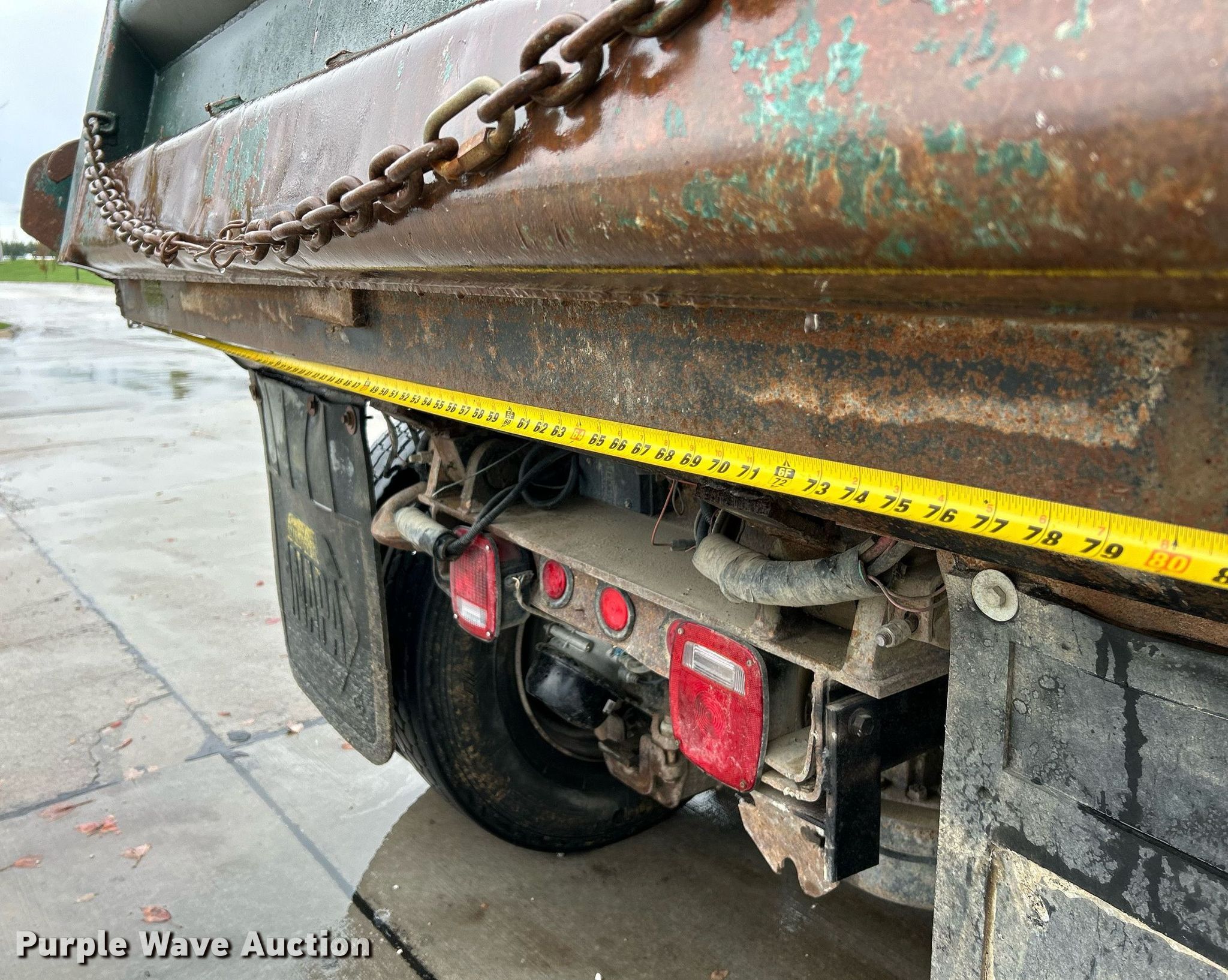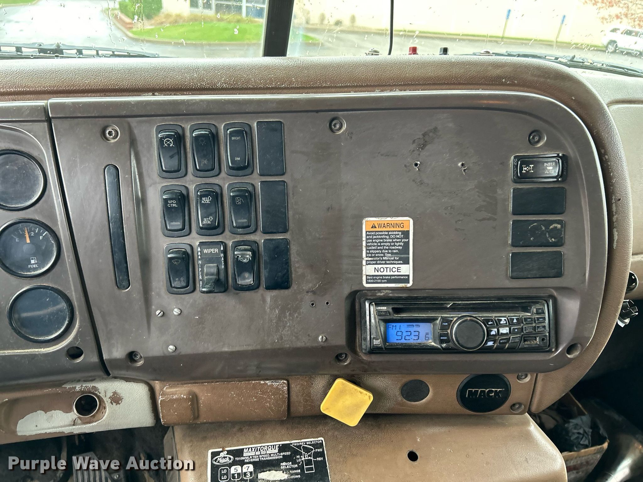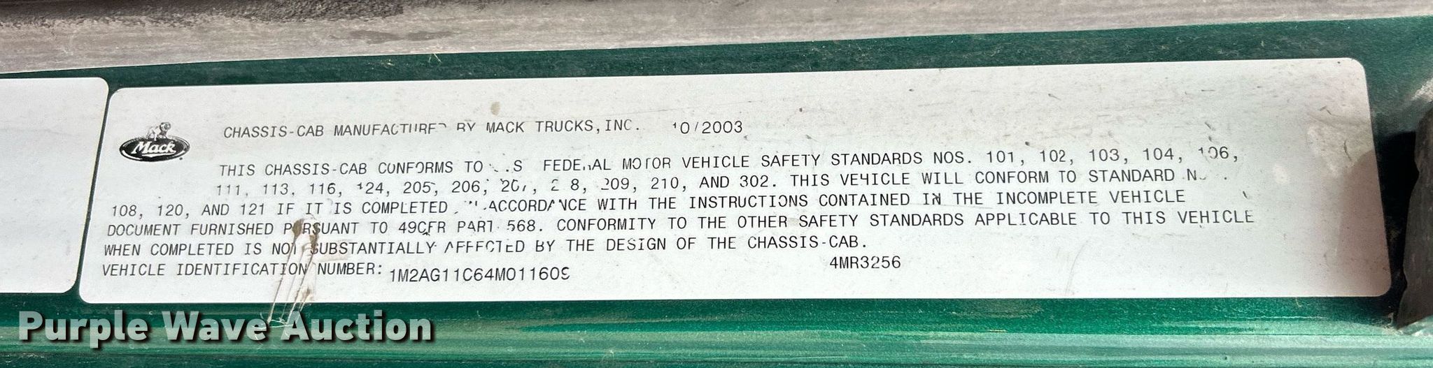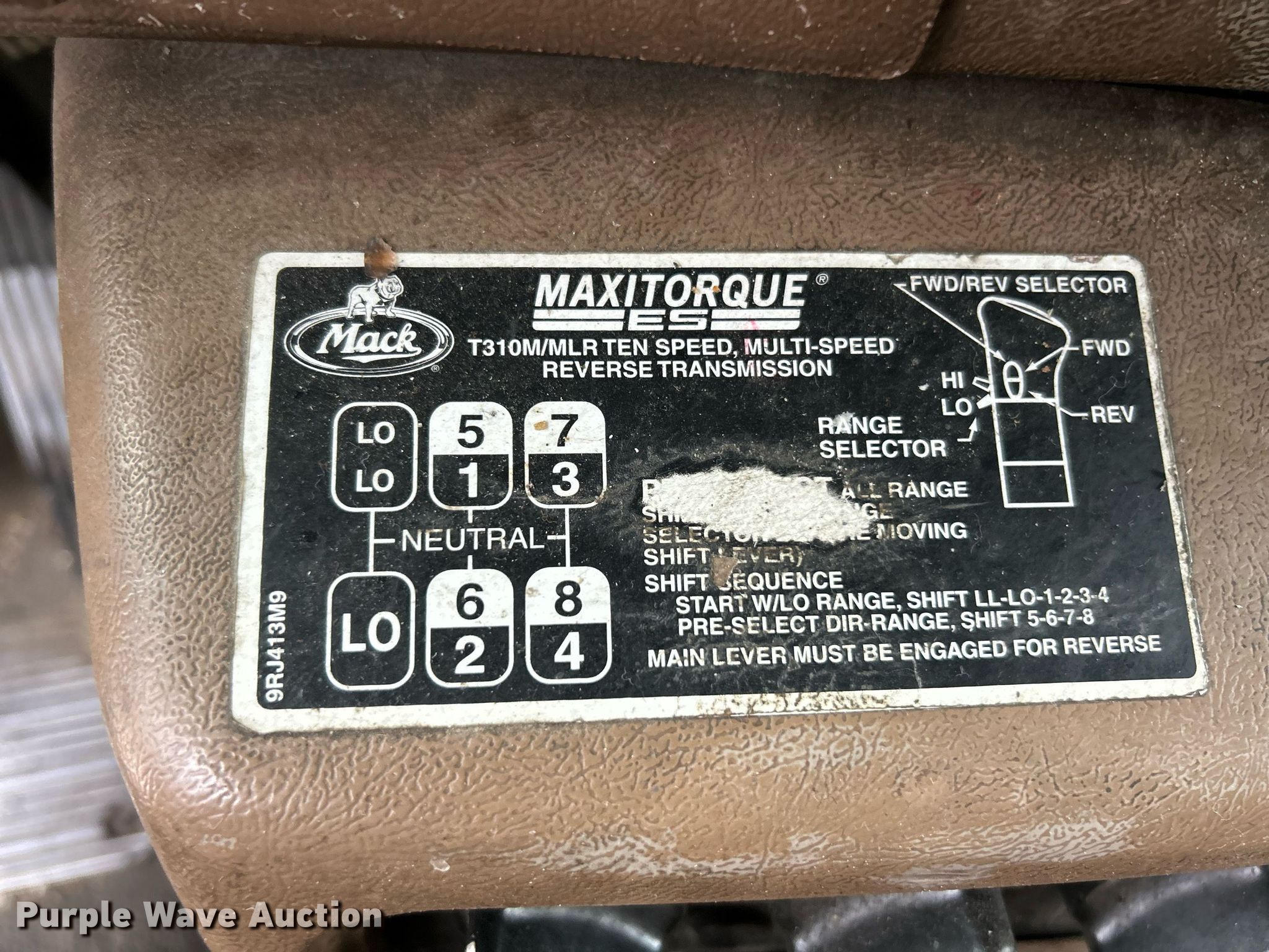 2004 Mack CV713 dump truck. Miles: 582,509 on odometer, Hours: 28,656 on meter, VIN: 1M2AG11C64M011609. Engine Mack, Displacement: 12.0L, Cylinders: 6, Fuel type: Diesel, HP: 370, Engine brake. Transmission Mack Maxitorque ES, Manual, Speed: 10. Chassis Double frame, Axles: Tandem, Differential lock: Inter-axle, Suspension: Camelback, Brakes: Air, PTO. Interior AC, Heat, Heated mirrors, Cruise control. Features Dump bed 16' L x 94" W, Side height: 45", Side board height: 10", Bed type: Steel, Roll tarp, Ram: Single, End gate: Air operated. Tires Front: 315/80R22.5, Rear: 11R22.5. Notes Decals will be removed prior to auction, Windshield chipped or cracked, Dash warning indicator: Fault code. Missouri title. Title distribution may be delayed up to 14 days from verification of funds. M&H Concrete Contractors Inc.. St. Peters, MO 63376