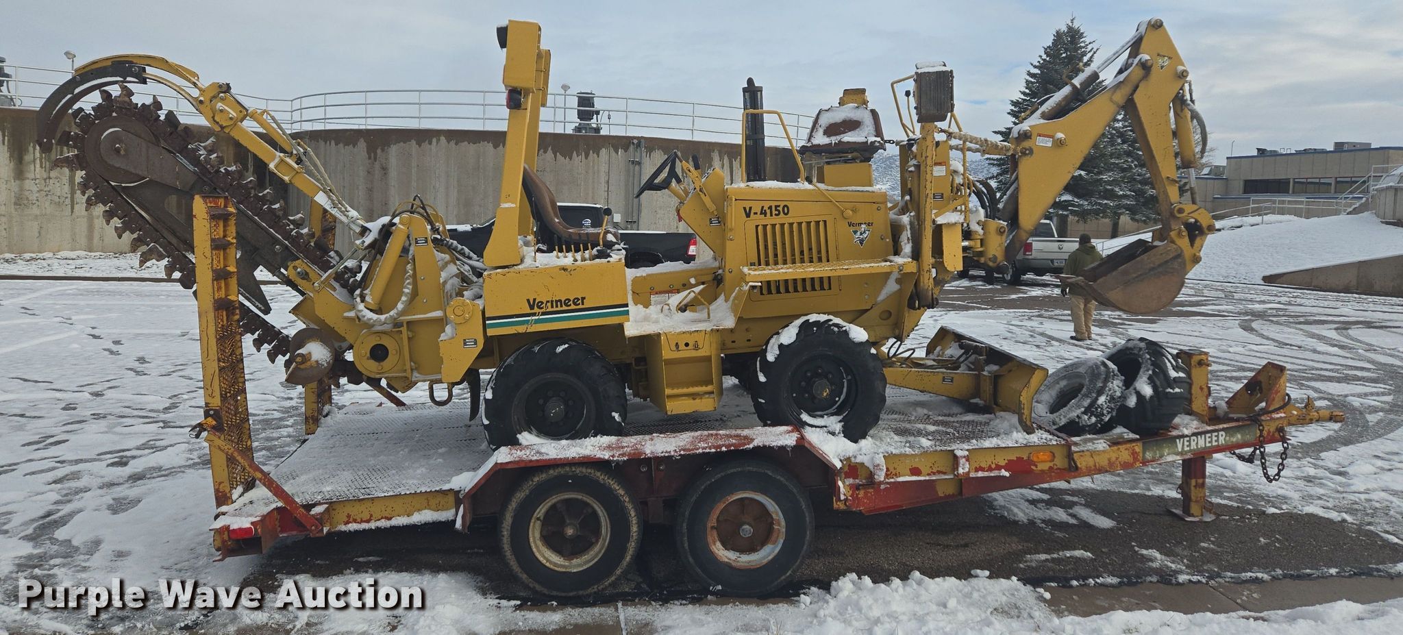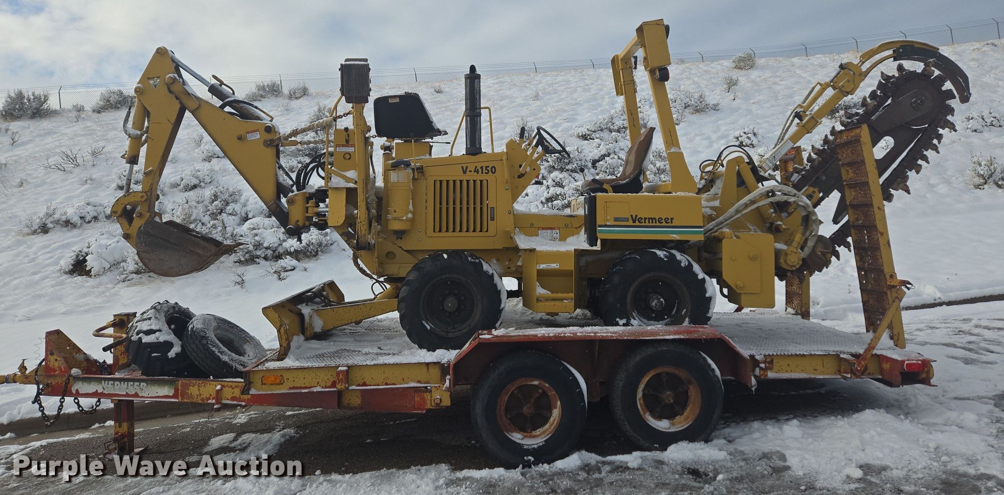1993 Vermeer V4150 trencher. Hours: 883 on meter, Serial: 1VRF08206P1000305. Engine KHD Deutz F3I 1011, Serial: 8325757, Cylinders: 4, Fuel type: Diesel. Transmission Hydrostatic, Two speed travel, Four wheel drive, Four wheel steer. Operators station OROPS. Features Trencher Model: V1650, Serial: 1VRL070R5P1000424, Estimated dig depth: 79", Wheel diameter: 15", Cutting width: 7", Side shift, Teeth: Rock, Dirt, Hydraulic crumber, Backhoe Model: V730A, Serial: 1VRJ080T3P1000382, Bucket width: 12", Backfill blade Width: 64". Tires Size: 29x12.50-15. Notes Additional parts included. 1979 Vermeer tilt deck trailer VIN: 3205. Dimensions Overall: 21' 8" L x 96" W, Deck: 14' L x 76" W, Ramps: Manual Length: 5'. Features Deck type: Steel, Wood. Chassis Ball hitch: 2 5/16", Landing gear: Single, Suspension: Spring, Brakes: Electric, Axles: Tandem, GVWR: 12,500 lbs. Tires Steel wheels, Size: 8-14.5. Wyoming title. Cordaki Construction LLC. Evanston, WY 82930