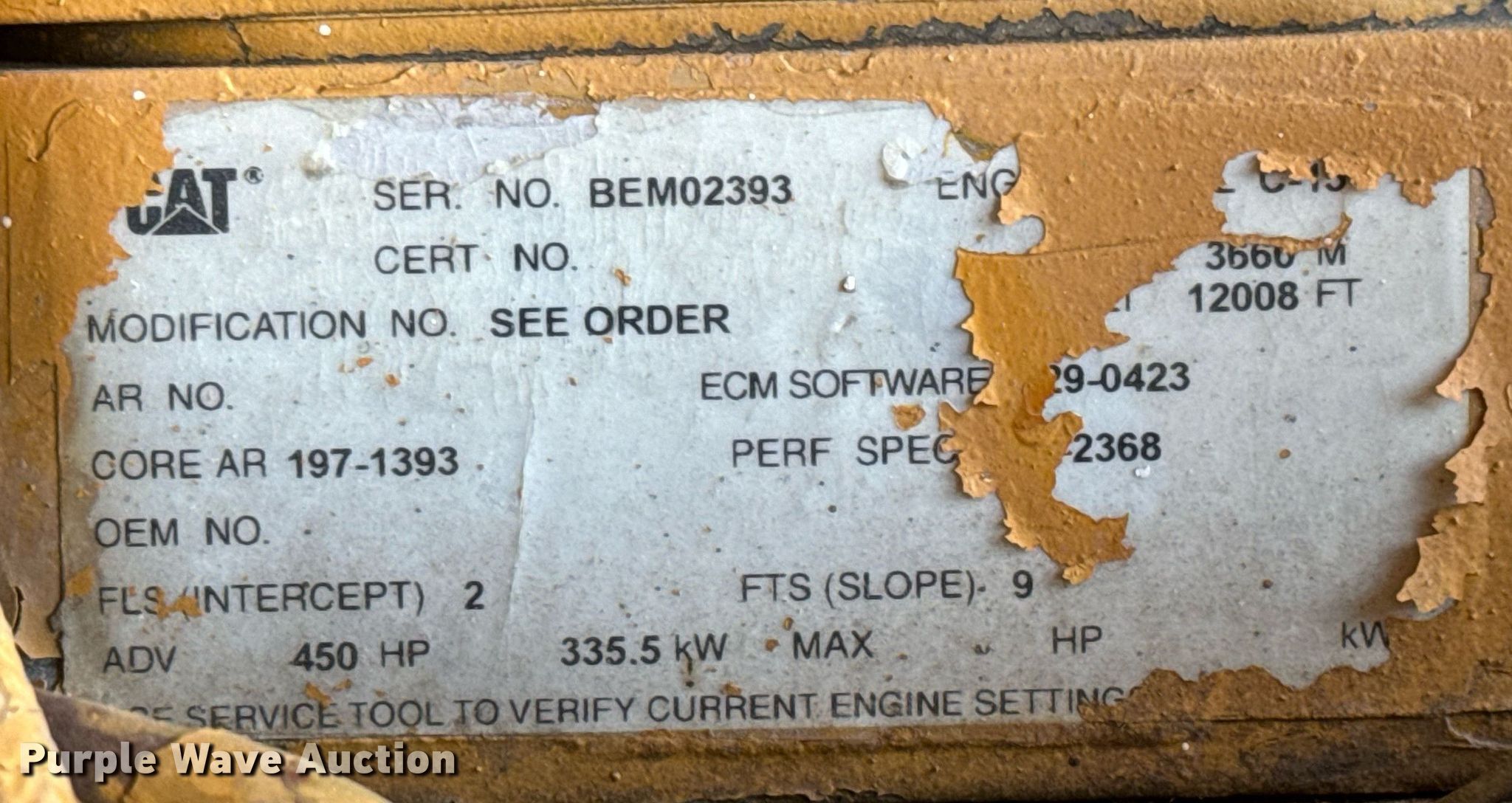 Purple Wave is selling a used Power Unit in Kansas. This item is a Caterpillar C15 power unit with the following: Hours: 67,293 on meter, Serial: BEM02393, Cylinders: 6, Fuel type: Diesel, HP: 450