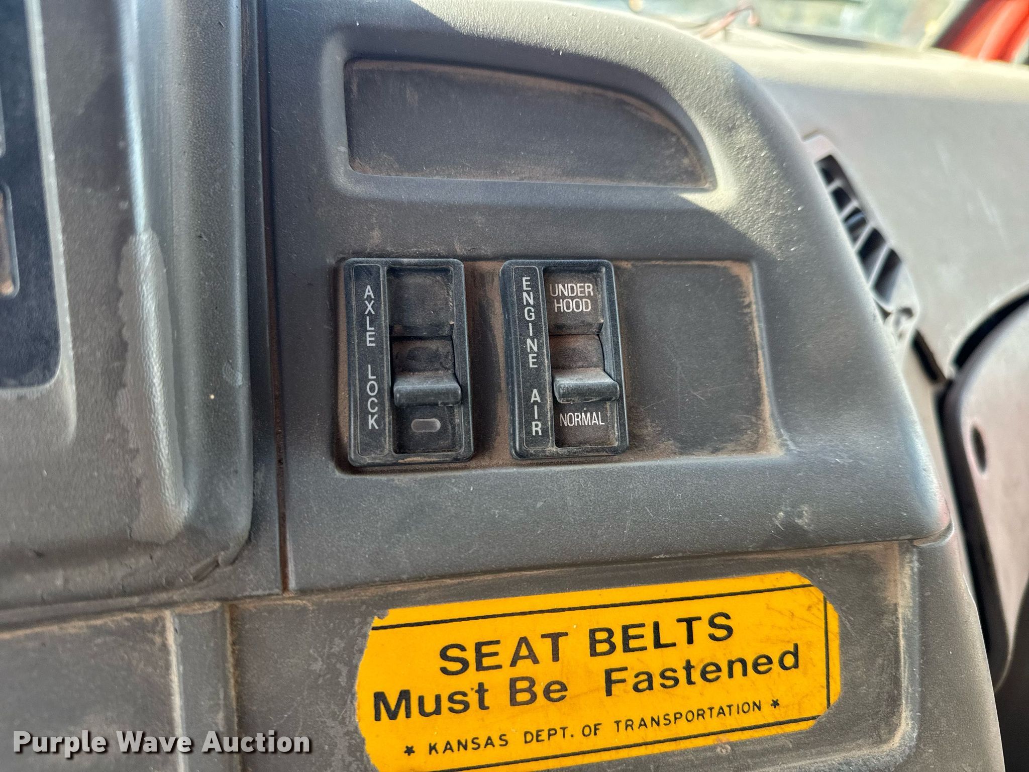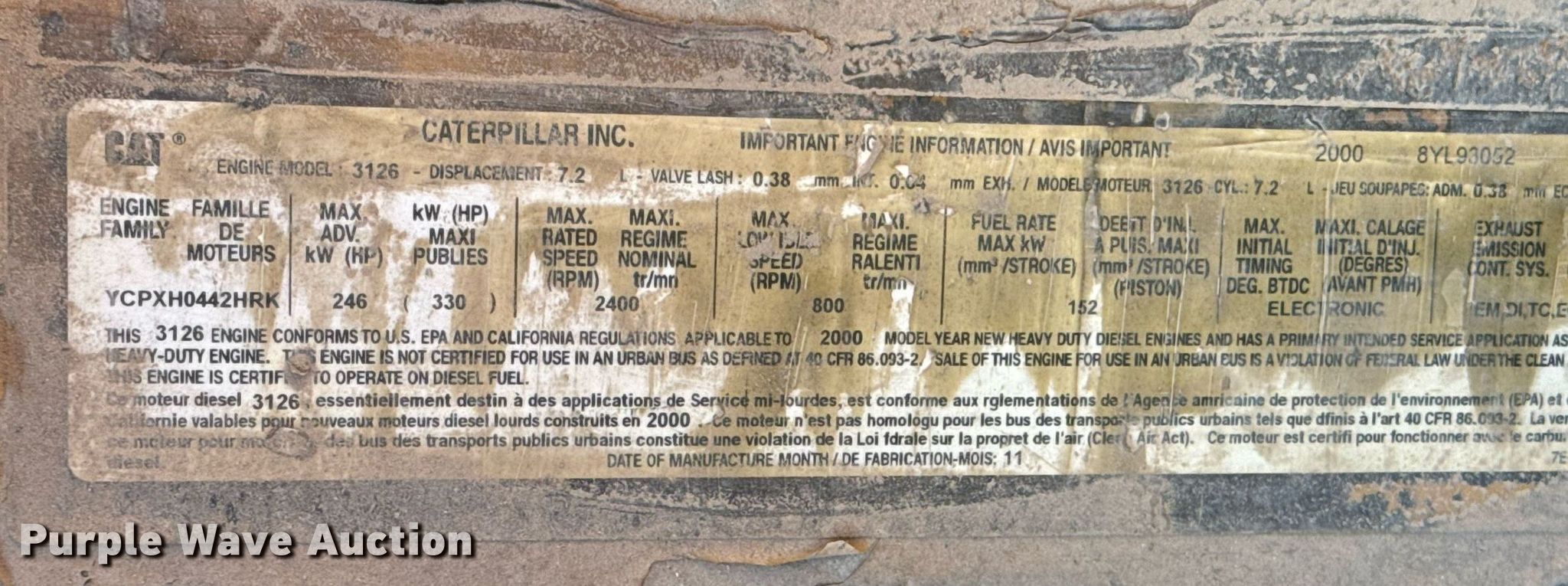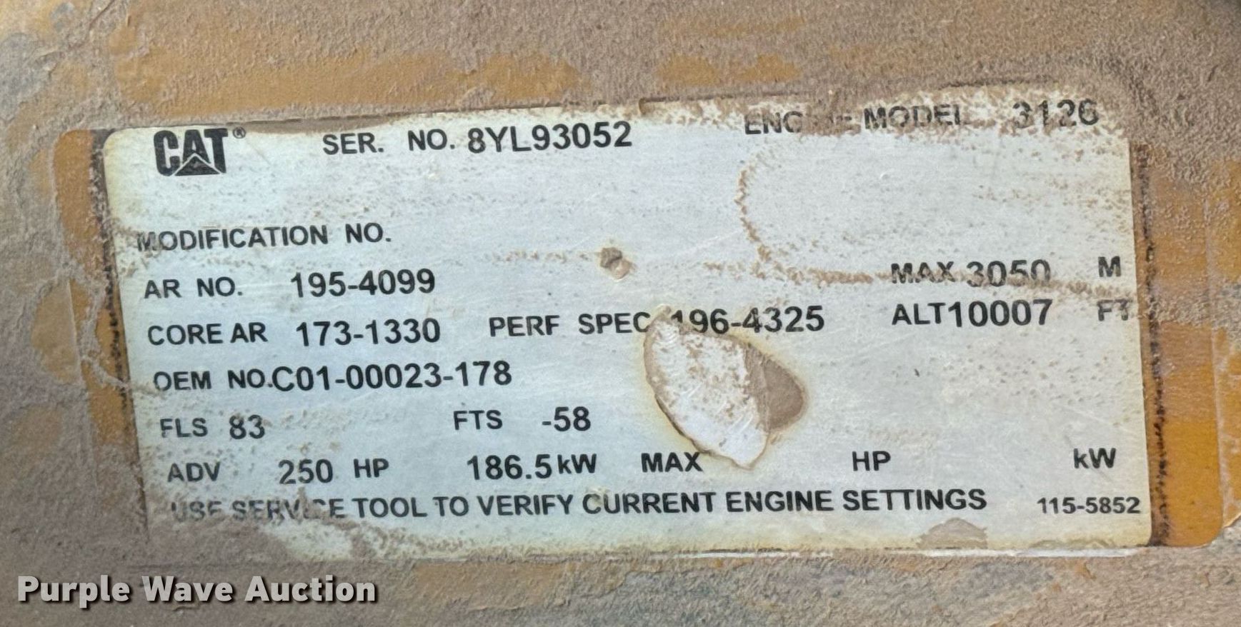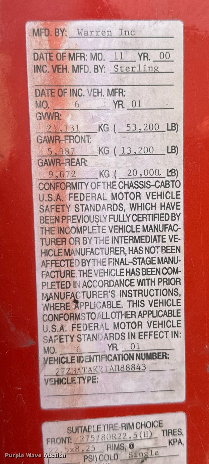 2001 Sterling LT7500 dump truck. Miles: 249,027 on odometer, Hours: 13,060 on meter, VIN: 2FZHATAK21AH88843, Unit #: NT74. Engine Caterpillar 3126, Serial: 8YL93052, Displacement: 7.2L, Cylinders: 6, Fuel type: Diesel, HP: 250. Transmission Automatic. Chassis Axles: Tandem, Differential lock: Inter-axle, Suspension: Spring, Brakes: Air, Front mount PTO, GVWR: 53,200 lbs FAWR: 13,200 lbs, IAWR: 20,000 lbs, RAWR: 20,000 lbs. Interior AC, Heat, Heated mirrors, Cruise control, Brake controller. Features Dump bed 13' L x 95" W, Side height: 45", Bed type: Steel, Roll tarp, Ram: Single, End gate: Air operated. Tires Size: 295/75R22.5. Notes Dash warning indicator: Engine warning, Unknown operating condition of climate control blower motor. Kansas title. Title distribution may be delayed up to 14 days from verification of funds. Nowak Construction. Goddard, KS 67052
