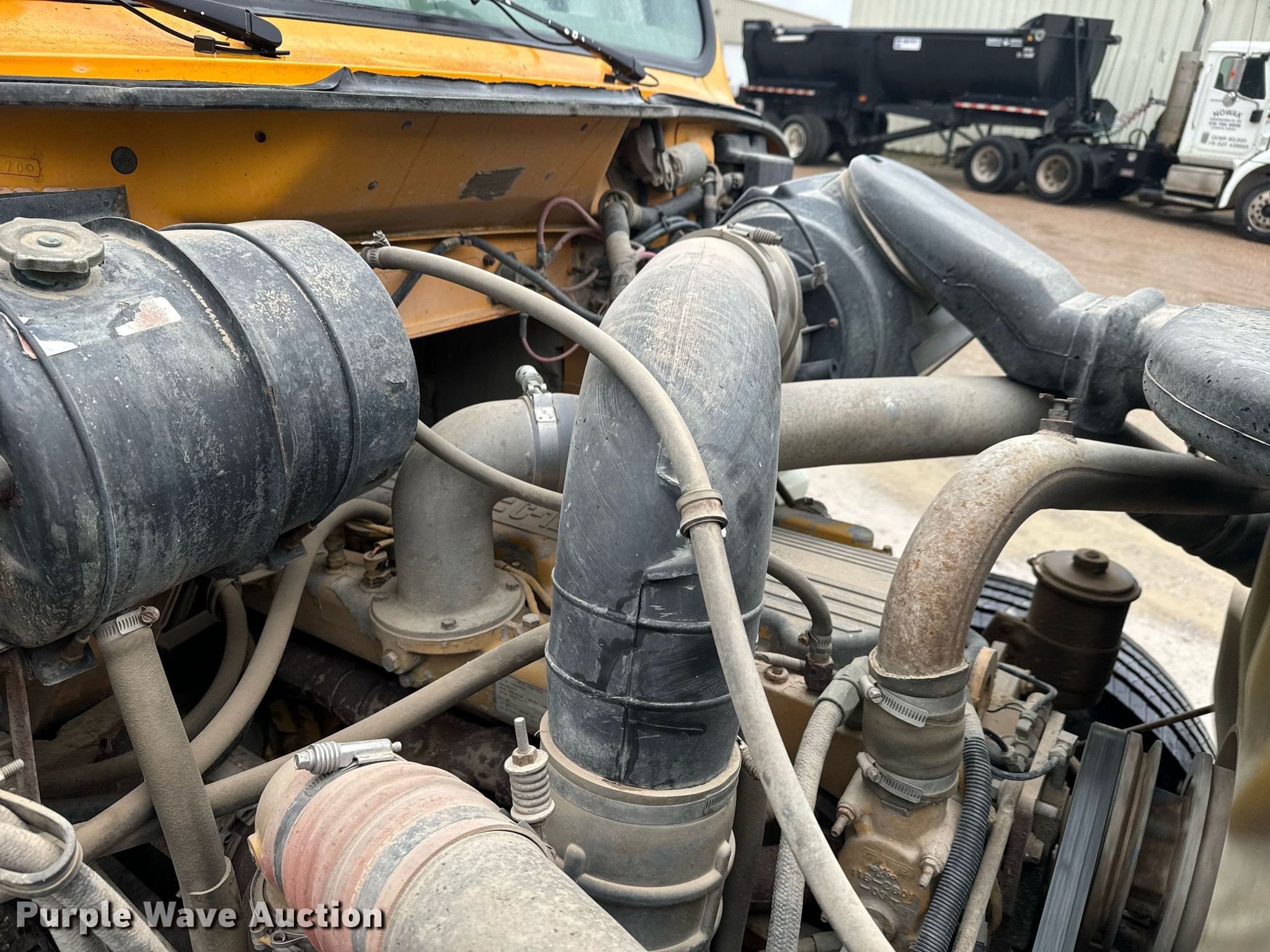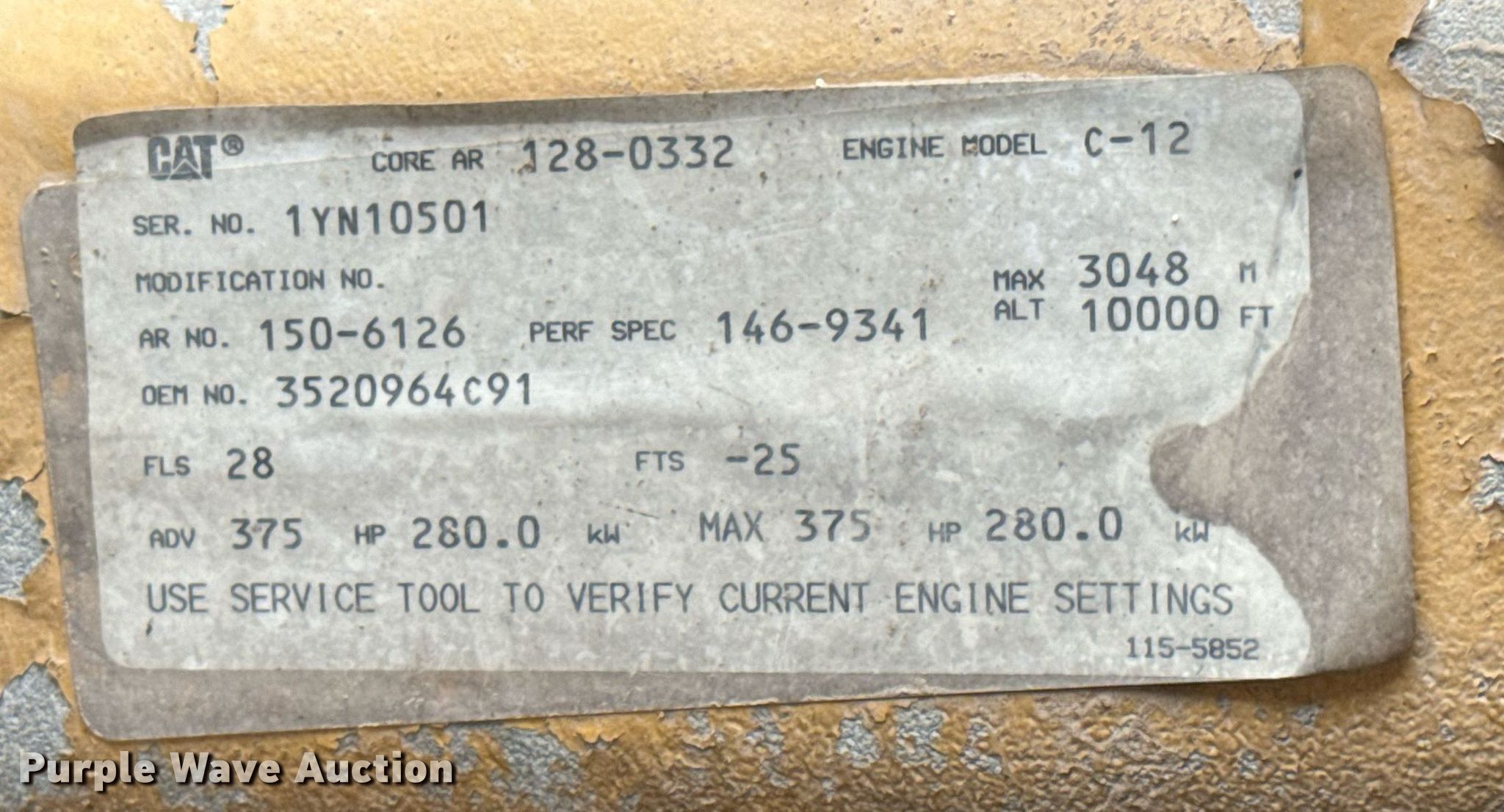 1998 International 2574 tank truck. Miles: 216,725 on odometer, Hours: 12,772 on meter, VIN: 1HTGGAXR9WH518898, Unit #: NT94. Engine Caterpillar C12, Serial: 1YN10501, Displacement: 12.0L, Cylinders: 6, Fuel type: Diesel, HP: 375. Transmission Eaton Fuller, Manual, Speed: 13. Chassis Axles: Tandem, Differential lock: Inter-axle, Suspension: Spring over walking beam, Brakes: Air. Interior Heat, Heated mirrors, Cruise control. Features Bed / tank Capacity: 4,000 gallons, 17' 8" L x 96" W, Top fill, Sight tube, Rear outlet: 3". Tires Front: 315/80R22.5, Rear: 11R22.5. Notes Dash warning indicator: Warn engine, Windshield chipped or cracked. Kansas title. Title distribution may be delayed up to 14 days from verification of funds. Nowak Construction. Goddard, KS 67052