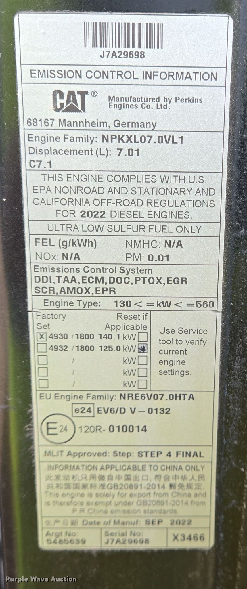 2023 Caterpillar 930M wheel loader. Hours: 501 on meter, Serial: F5K02852, Unit #: 72911304. Engine Caterpillar C7.1, Serial: J7A29698, Displacement: 7.01L, Cylinders: 6, Fuel type: Diesel. Transmission Powershift, 4F - 4R. Chassis Differential lock, Limited slip differential. Operators station Enclosed cab, AC, Heat, Bucket controls: Joystick, Ride control. Features Auxiliary hydraulics: Front, Quick coupler: Hydraulic, Bucket Caterpillar, Capacity: 3 cu.yd., Width: 100", Self-leveling bucket, Cutting edge: Bolt-on. Tires Size: 20.5R25. Please review REQUIRED REMOVAL INSTRUCTIONS... Get A Free Shipping Estimate From:. Purple Wave Shipping, LLC.. Open Inspection Friday, November 22 and Wednesday, December 4 from 9:00 A.M. to 3:00 P.M. MST. 3333 Bozeman Avenue. Helena, MT 59601