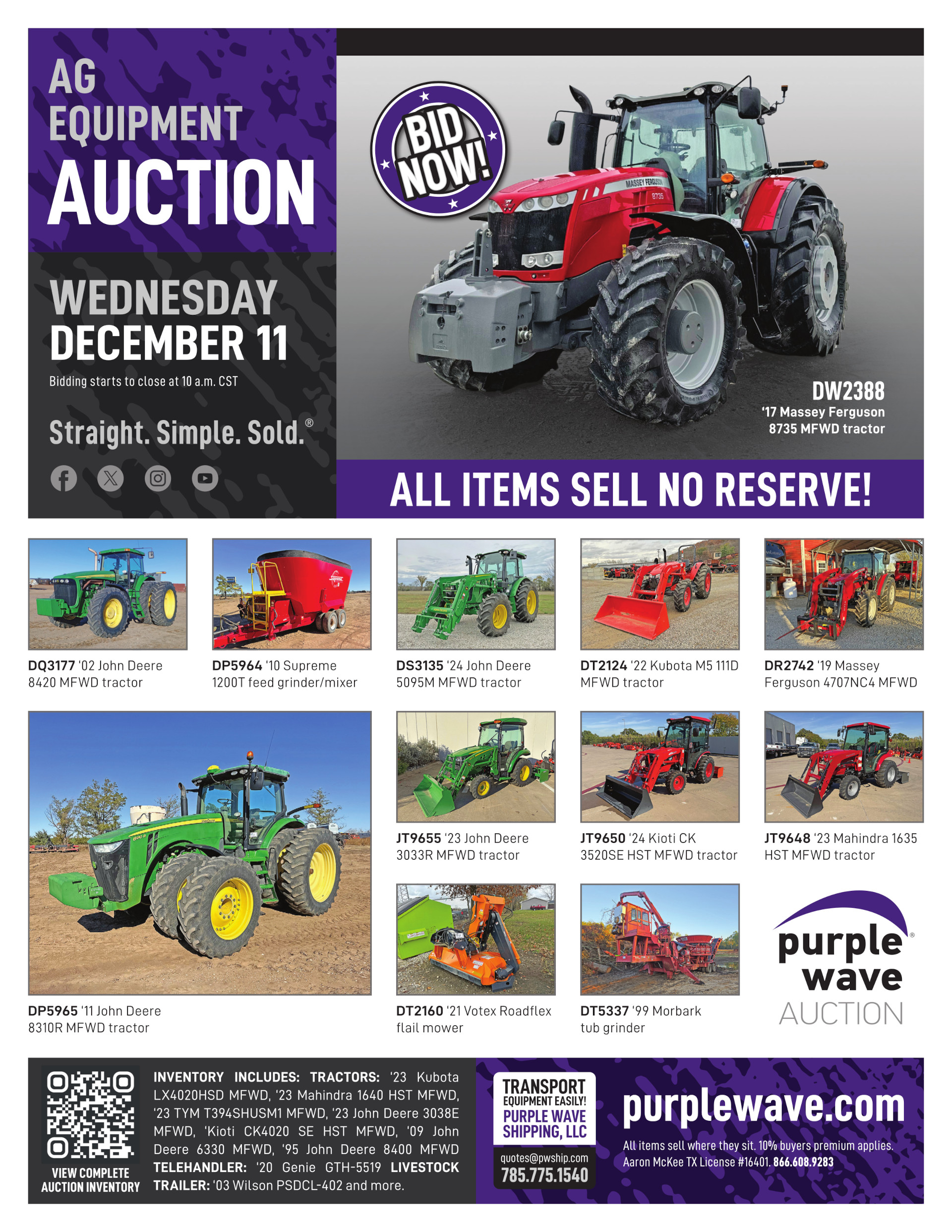 Purple Wave Shipping, LLC provides shipping and transportation services to winning bidders on ag, construction and fleet type assets. Purple Wave Shipping, LLC does not provide shipping on items weighing less than 1,000 pounds.