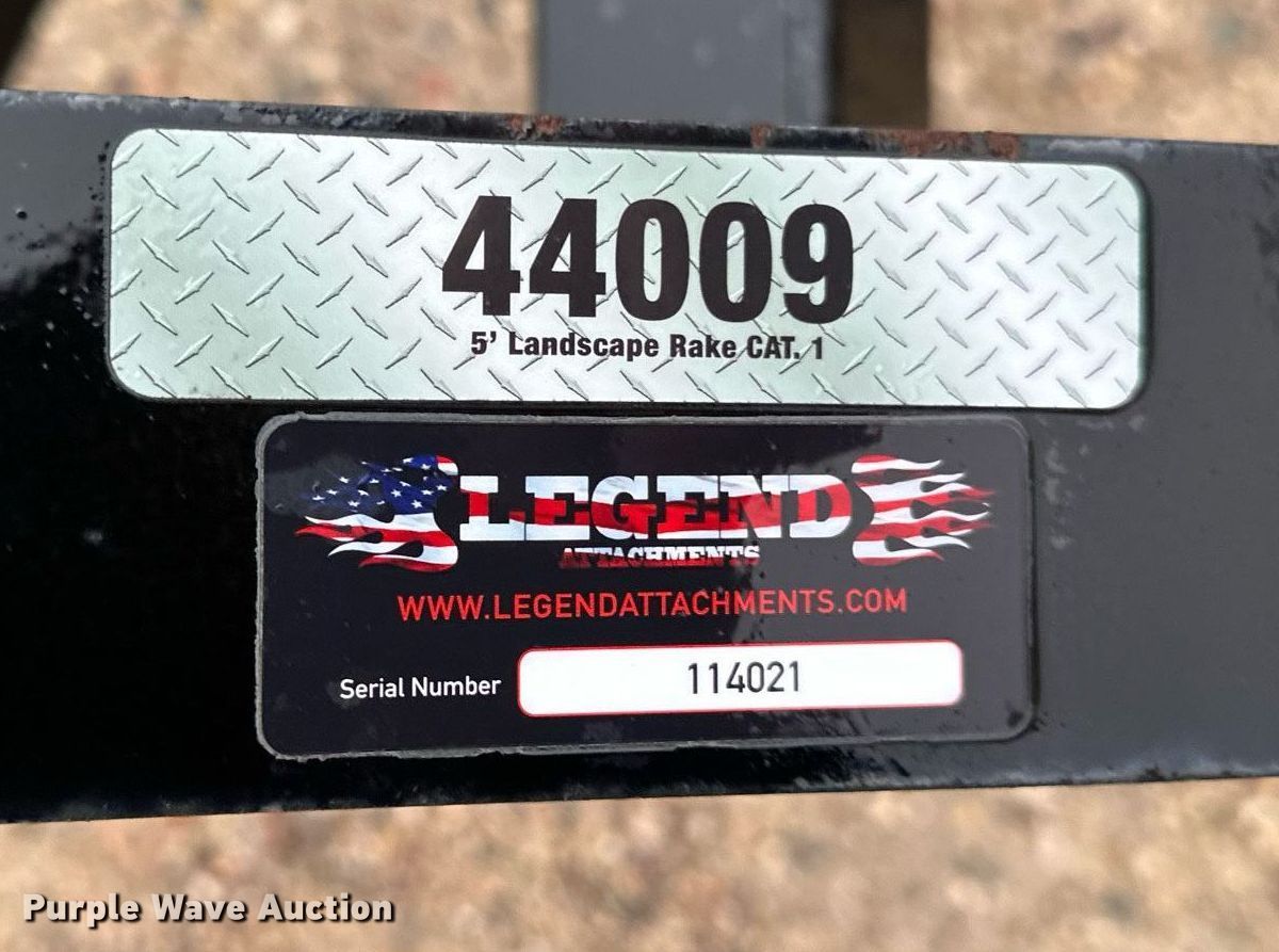 Purple Wave is selling a used Ag Equip. Other in Minnesota. This item is a Legend 44009 landscape rake with the following: Serial: 114021, Width: 60", Three point, Top link