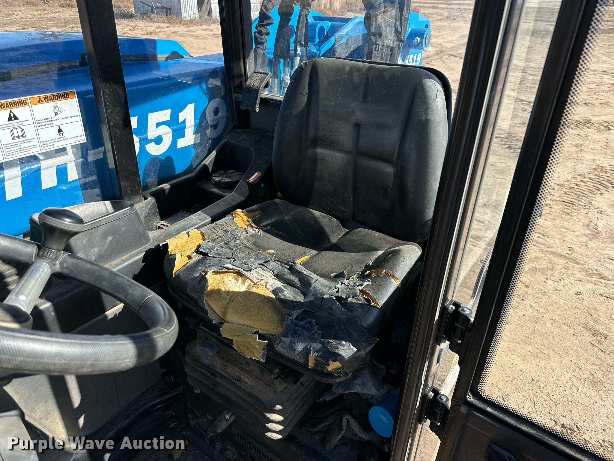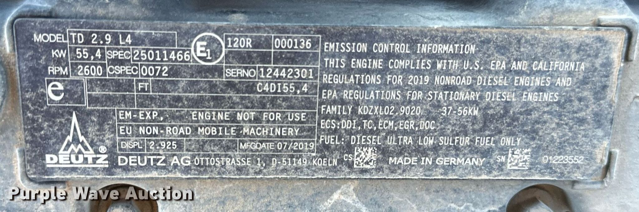 2020 Genie GTH-5519 telehandler. Hours: 285 on meter, Serial: GTH55M-11563. Engine Deutz, Displacement: 2.9L, Cylinders: 6, Fuel type: Diesel. Transmission Powershift, Four wheel drive. Operators station Enclosed cab, AC, Steering: Crab, Four wheel. Features Maximum lift capacity: 5,500 lbs, Maximum lift height: 20', Boom stages: 2, Fork length: 48". Tires Size: 12-16.5. Pyramid Cattle CO. Gruver, TX 79040