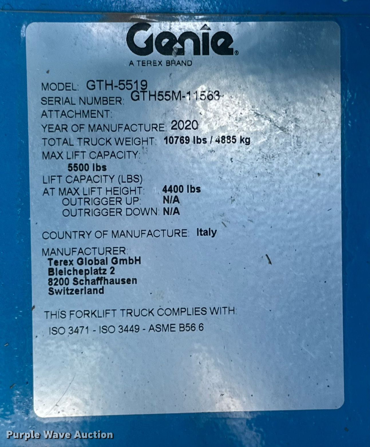 Purple Wave is selling a used Telehandler in Texas. This item is a 2020 Genie GTH-5519 telehandler with the following: Hours: 285 on meter, Serial: GTH55M-11563