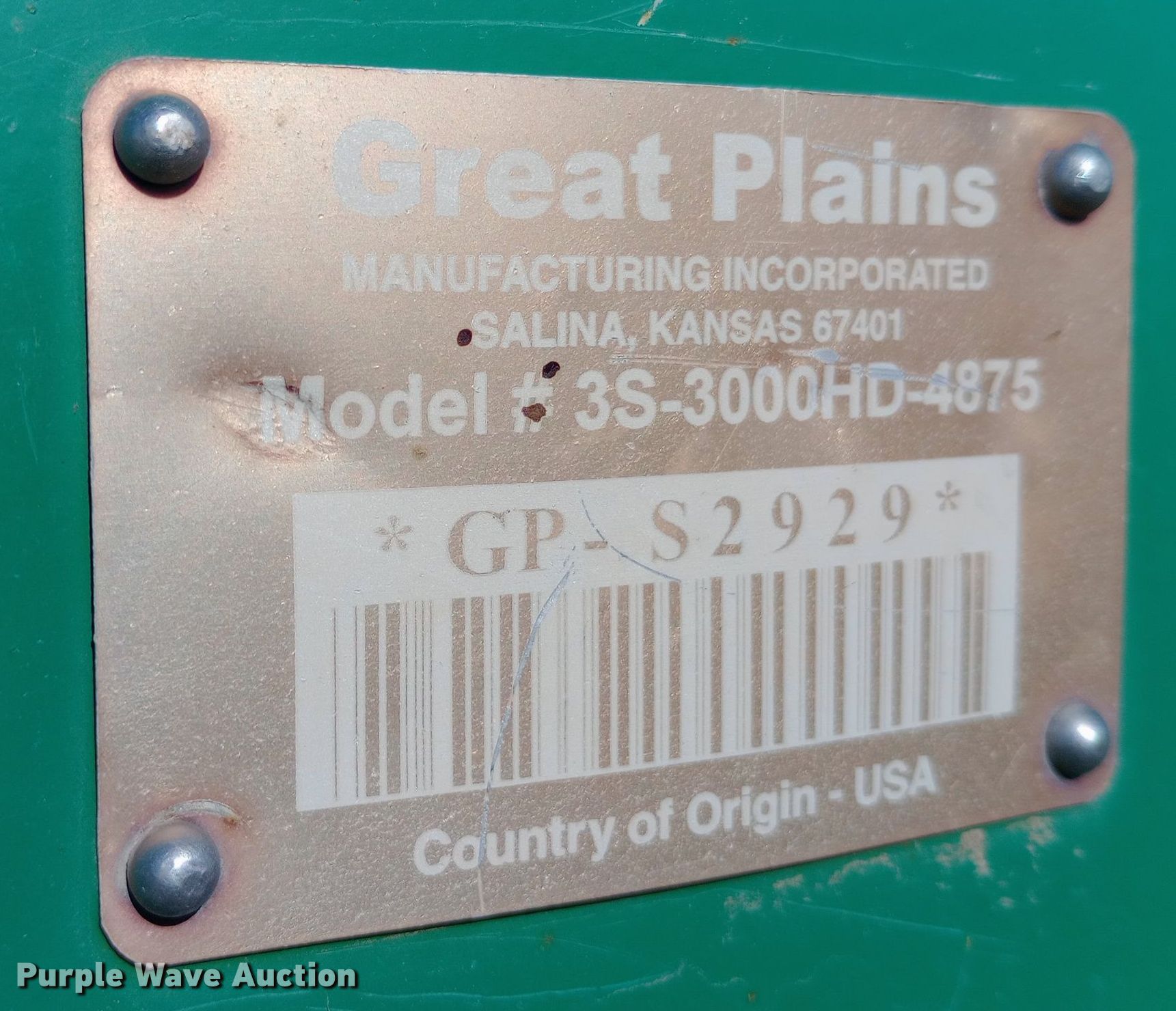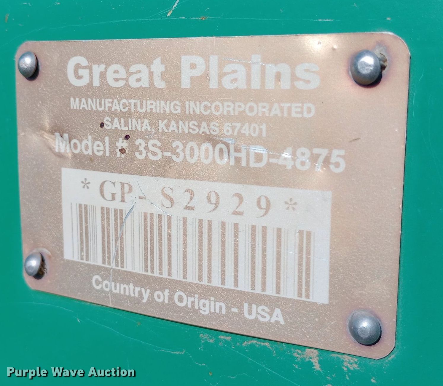 Purple Wave is selling a used Grain Drill or Seeder in Kansas. This item is a 2013 Great Plains 3S-3000HD-4875 grain drill with the following: Width: 30', Row units: 48, Row spacing: 7", Serial: GP-S2929
