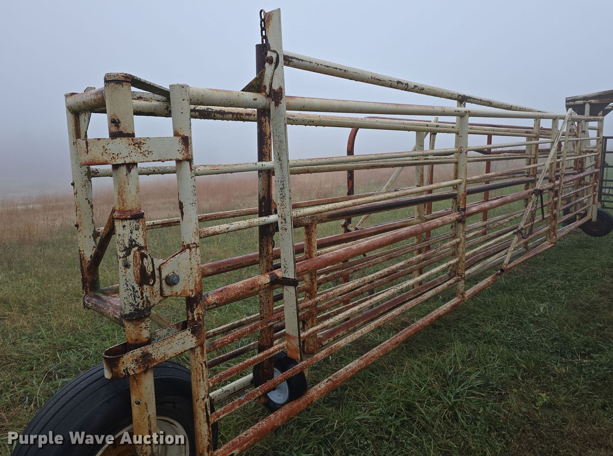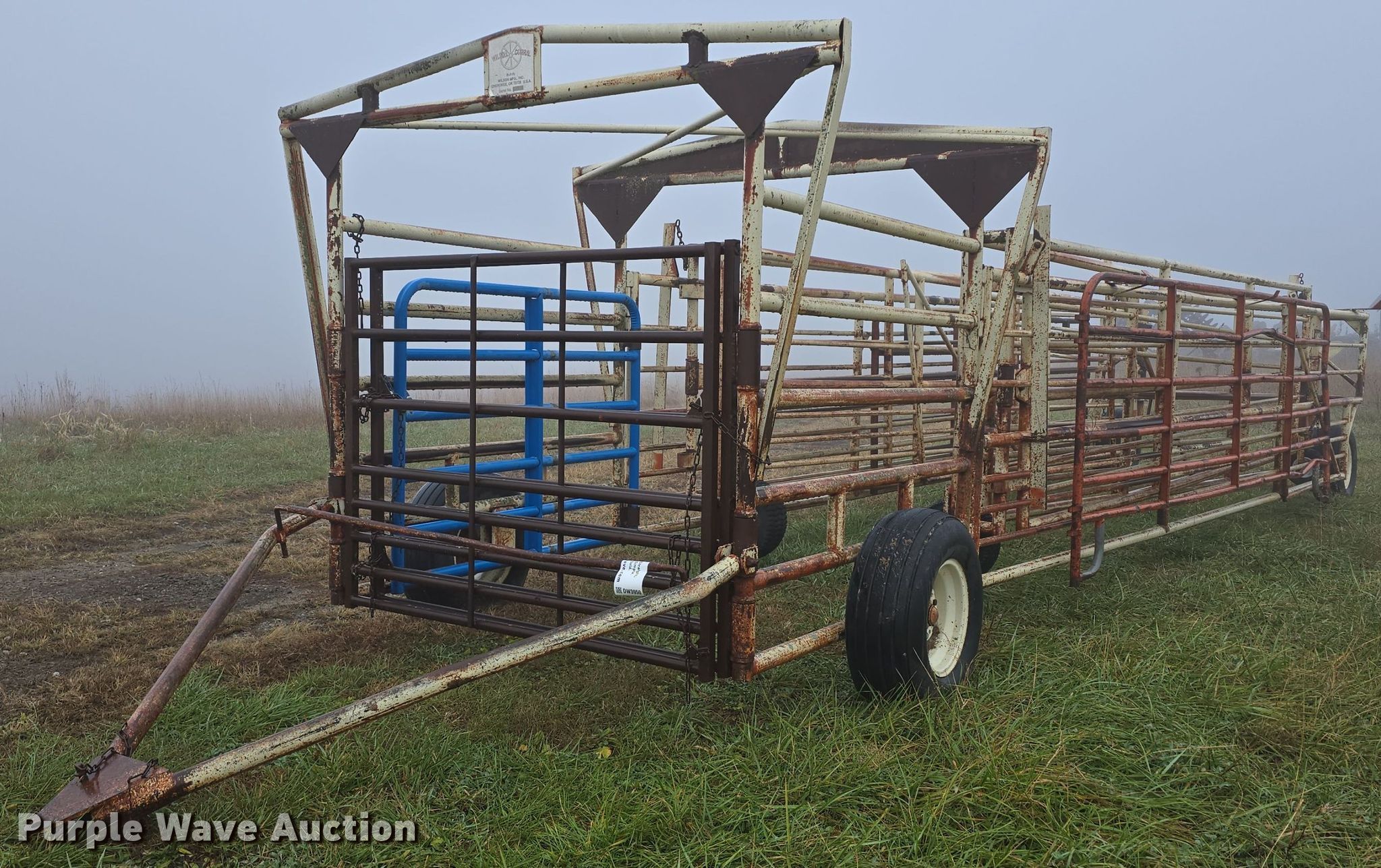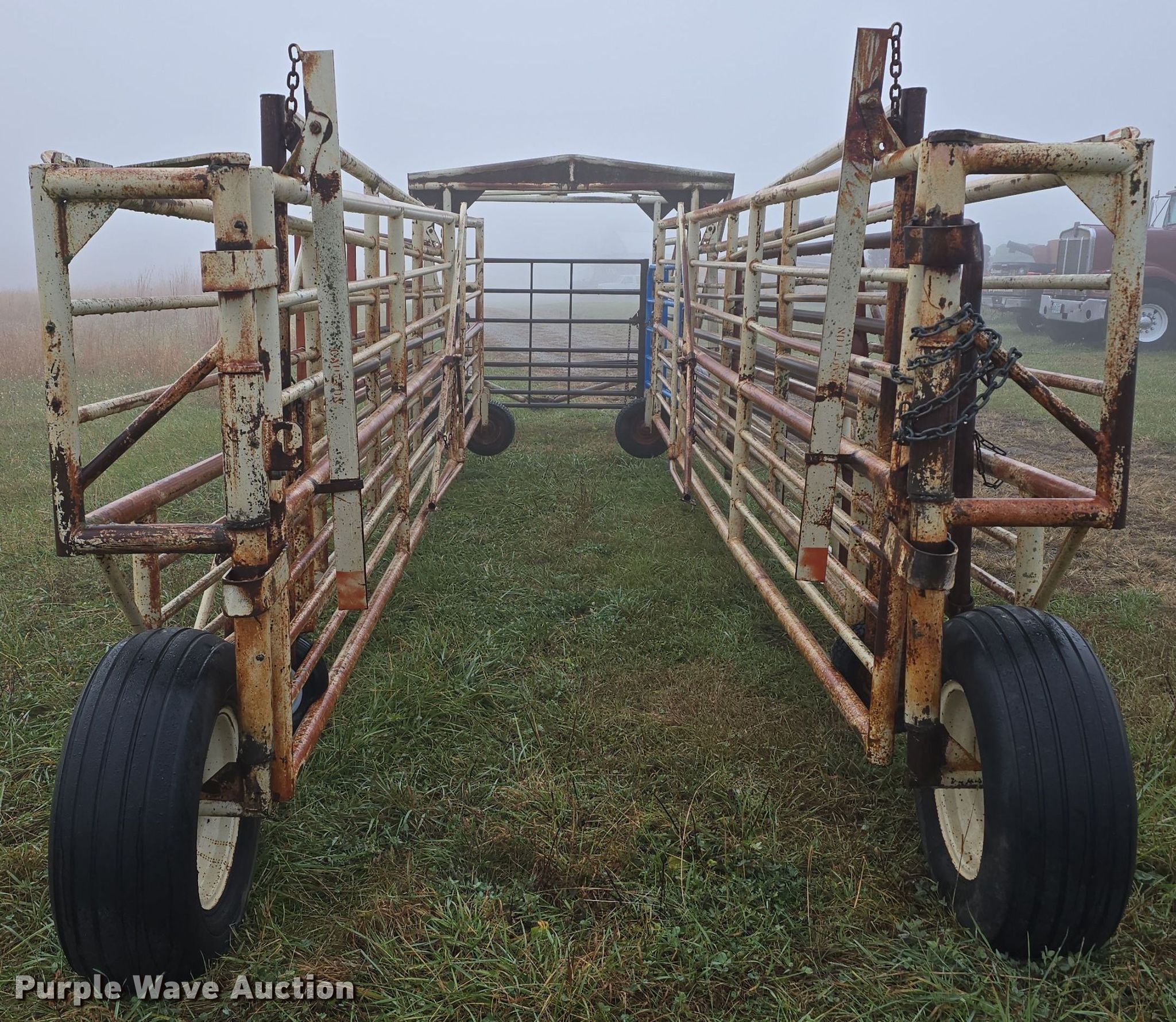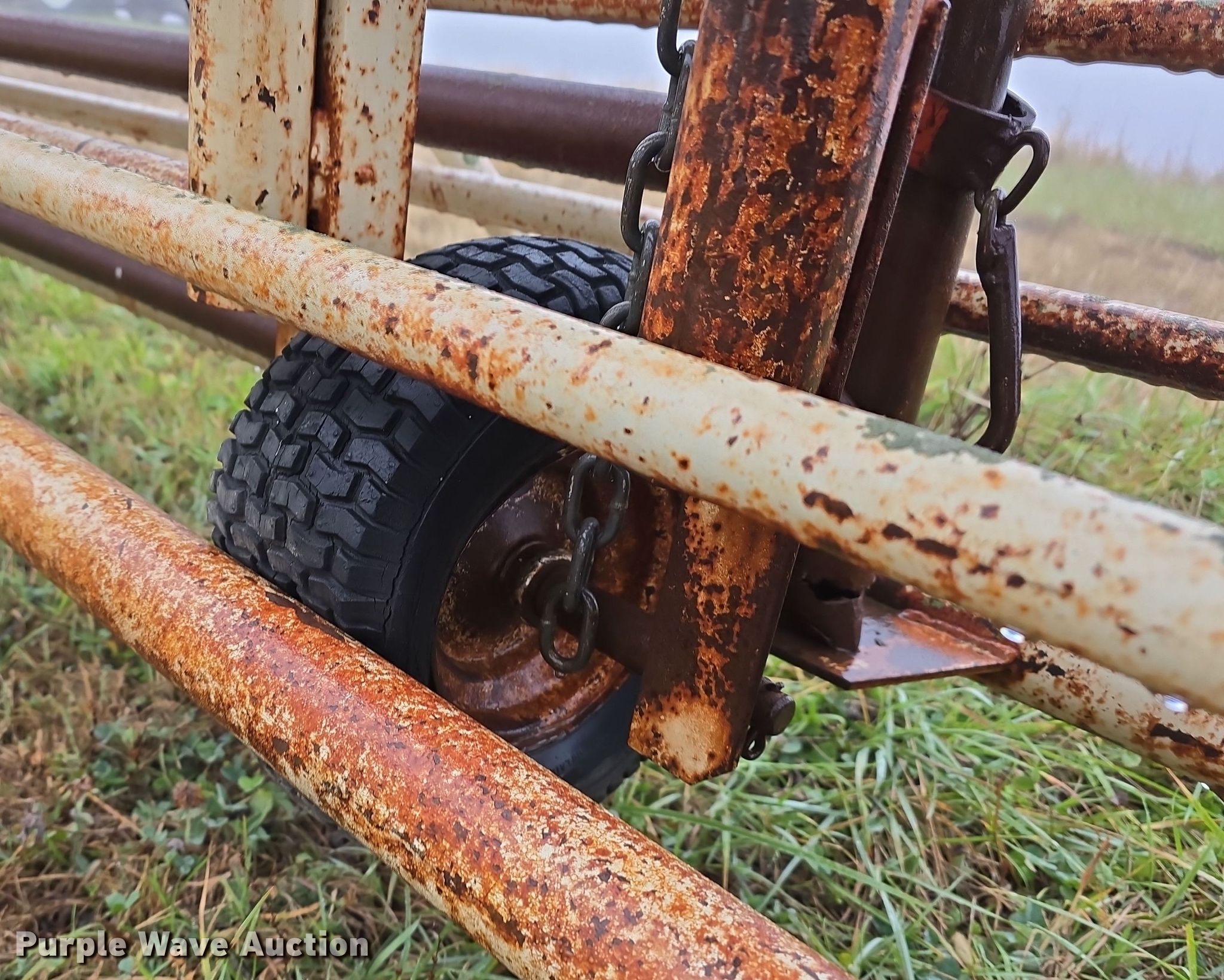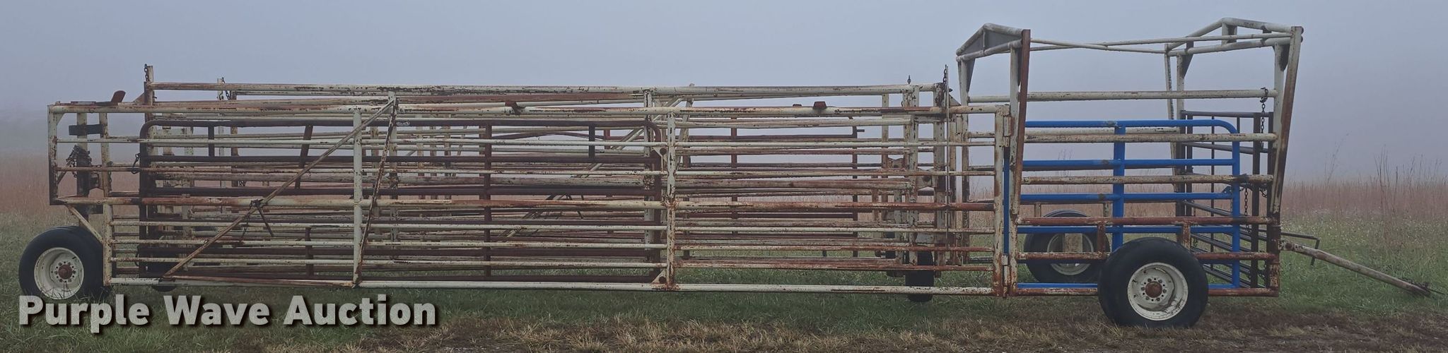 Wilson Corral livestock corral. Serial: 0098. Features Overall dimensions: 36' L x 96" W, (2) panels 24' 6" L x 56" H, (2) panels 20' L x 56" H, (2) 22' 6" L x 56" H, (3) gates: 68" W x 52" H, Gate: 16' L x 60" H, Gate: 14' L x 52" H. Tires Size: 11L-15, (2) gate tires: 16x6.50-8, (2) gate tires: 4.00-6. Bethany, MO 64424