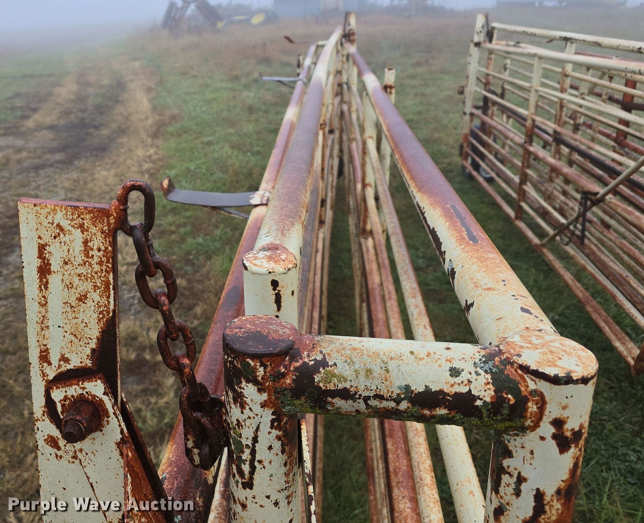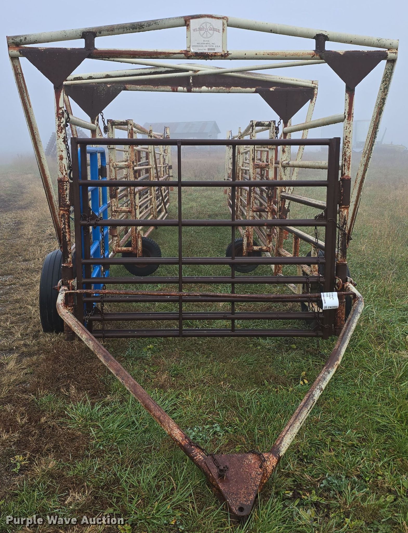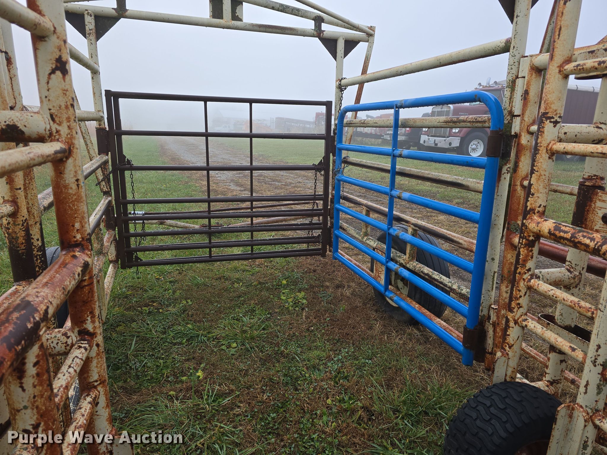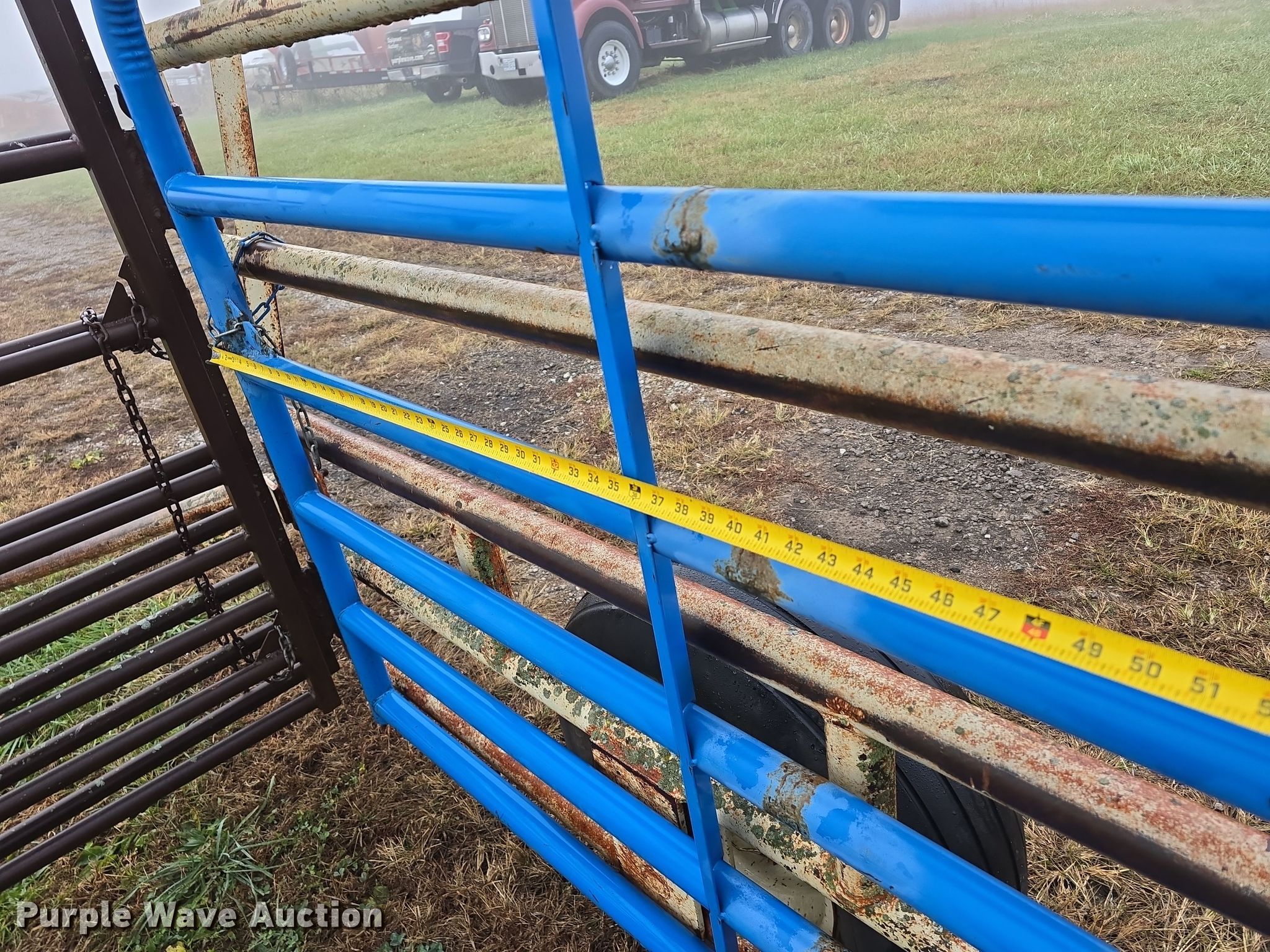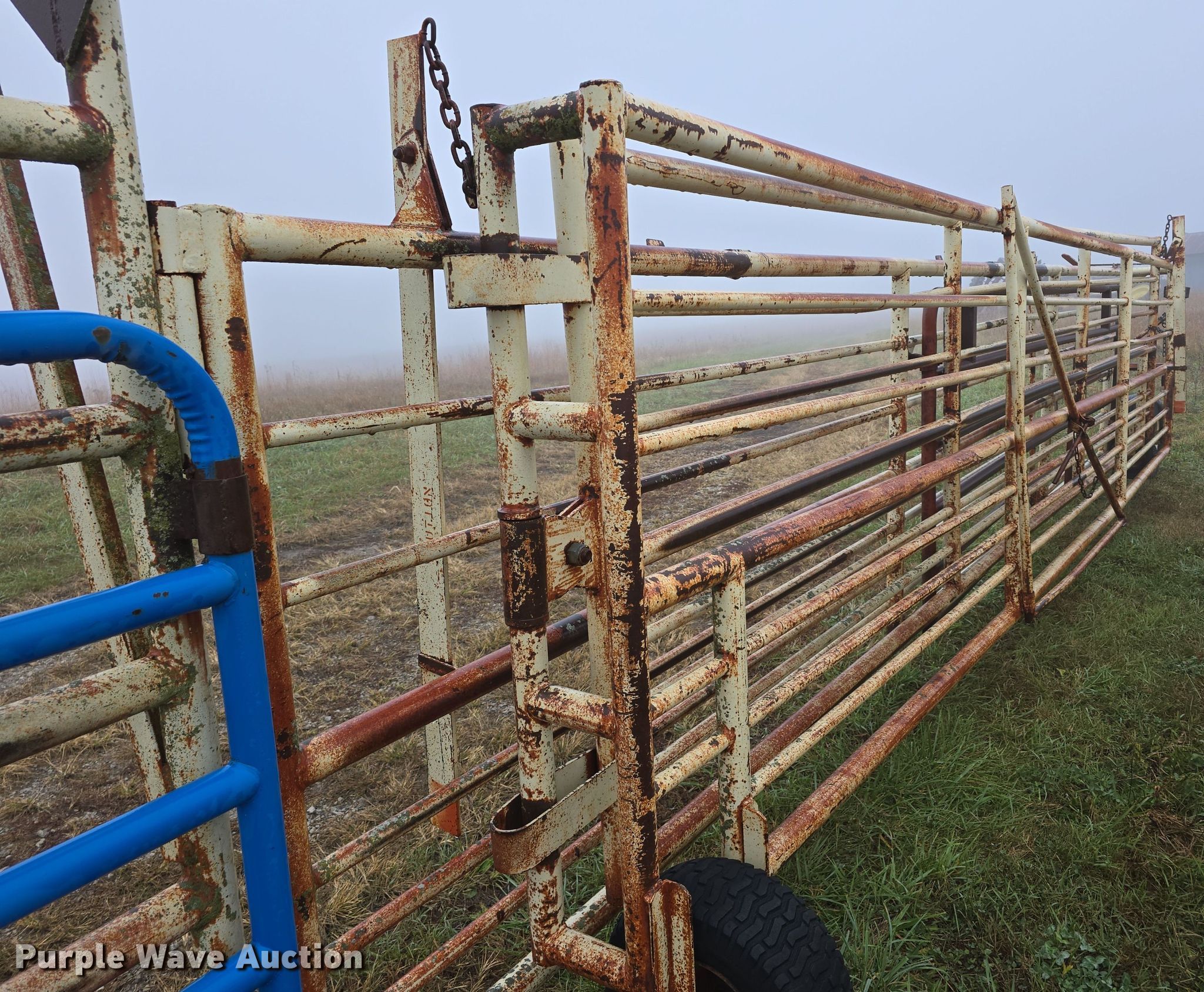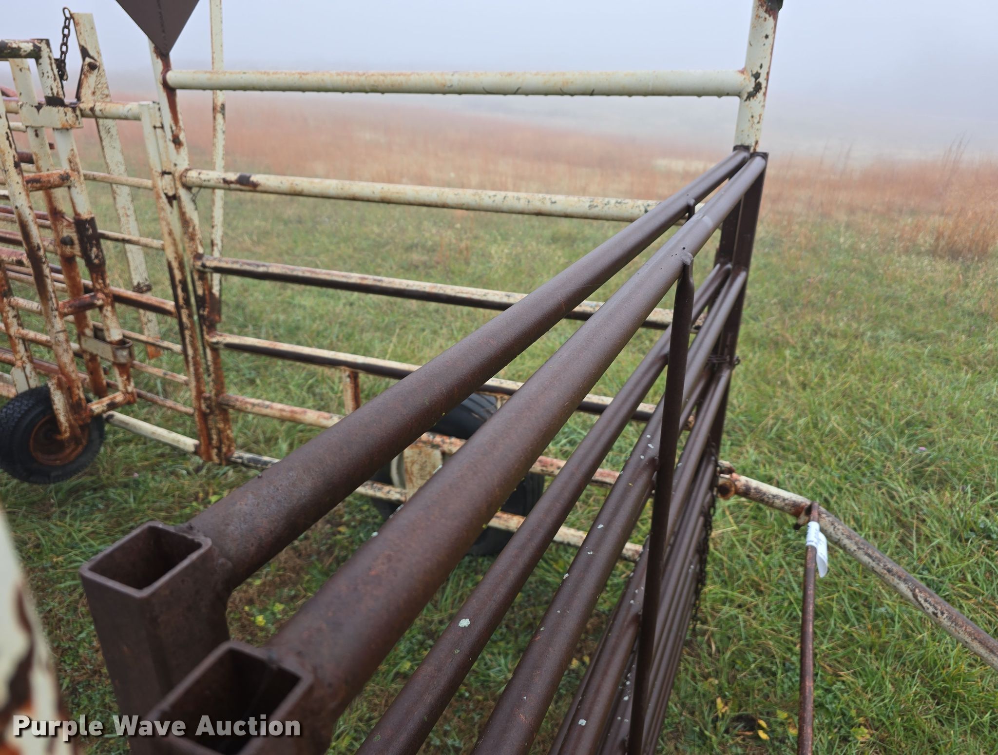 Wilson Corral livestock corral. Serial: 0098. Features Overall dimensions: 36' L x 96" W, (2) panels 24' 6" L x 56" H, (2) panels 20' L x 56" H, (2) 22' 6" L x 56" H, (3) gates: 68" W x 52" H, Gate: 16' L x 60" H, Gate: 14' L x 52" H. Tires Size: 11L-15, (2) gate tires: 16x6.50-8, (2) gate tires: 4.00-6. Bethany, MO 64424