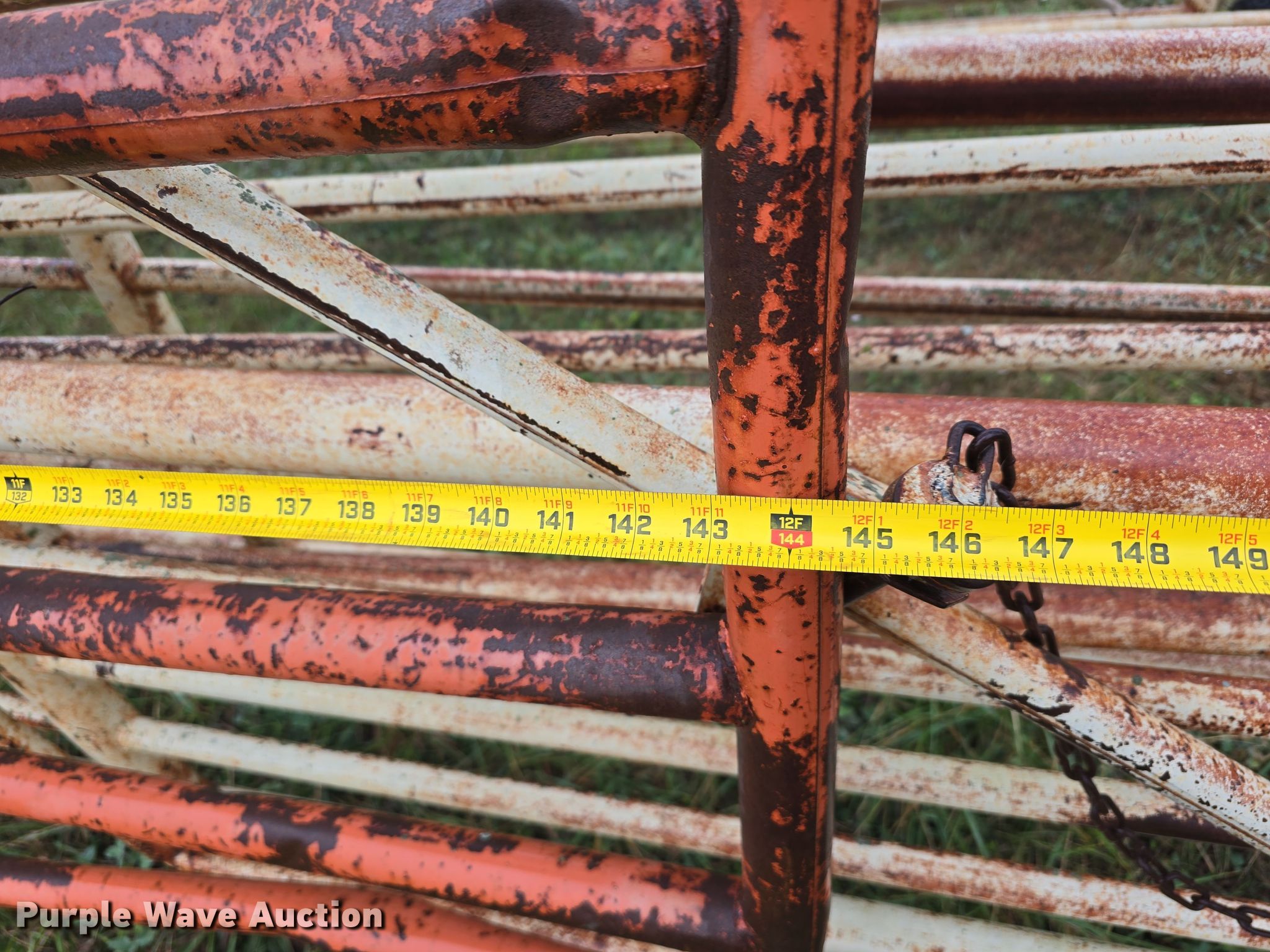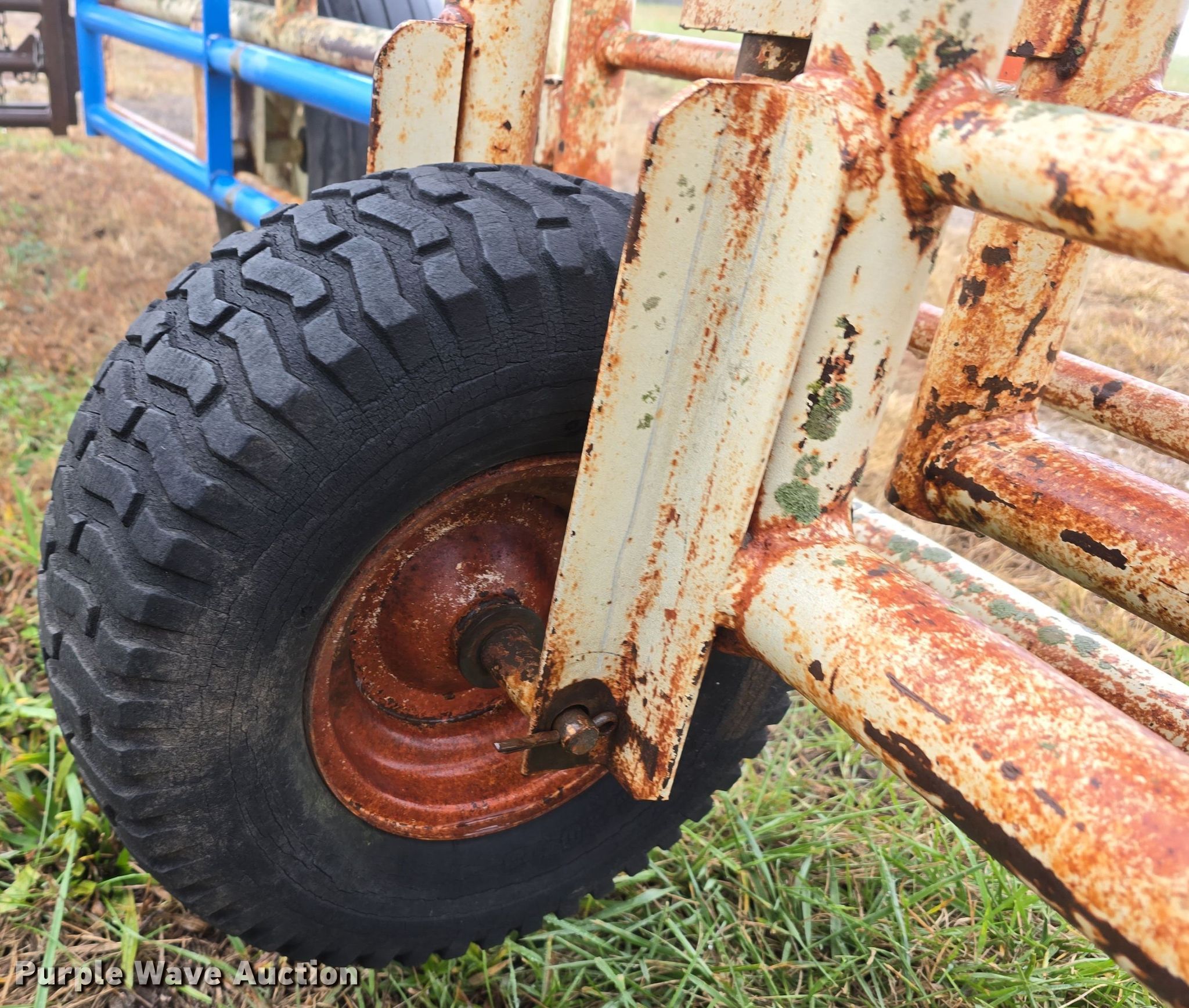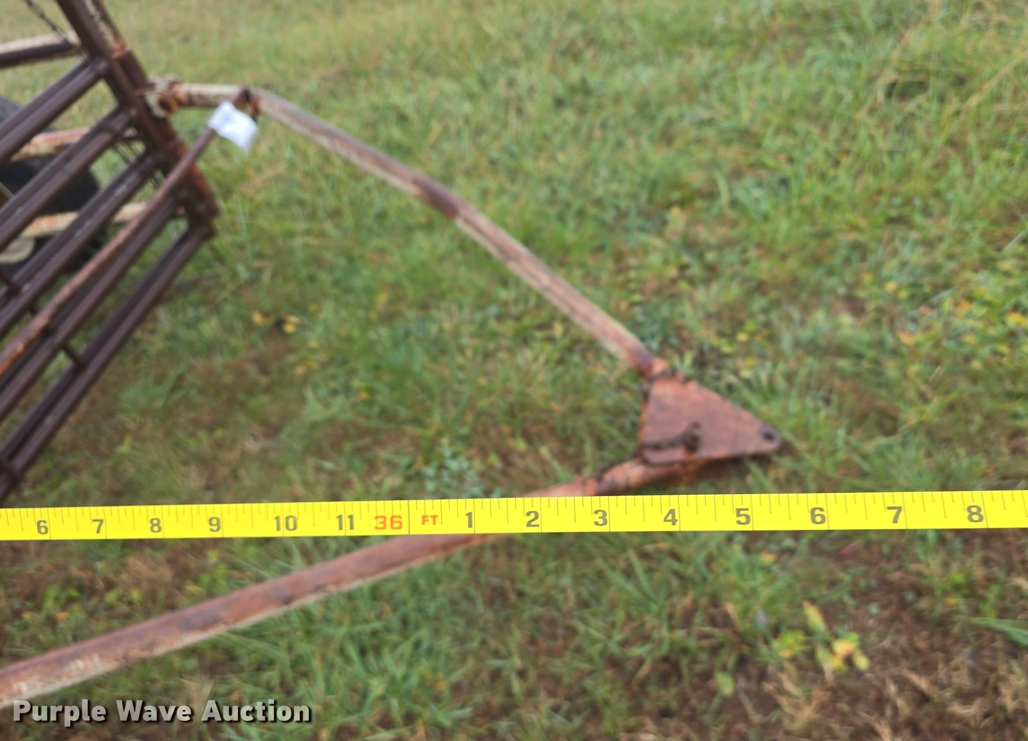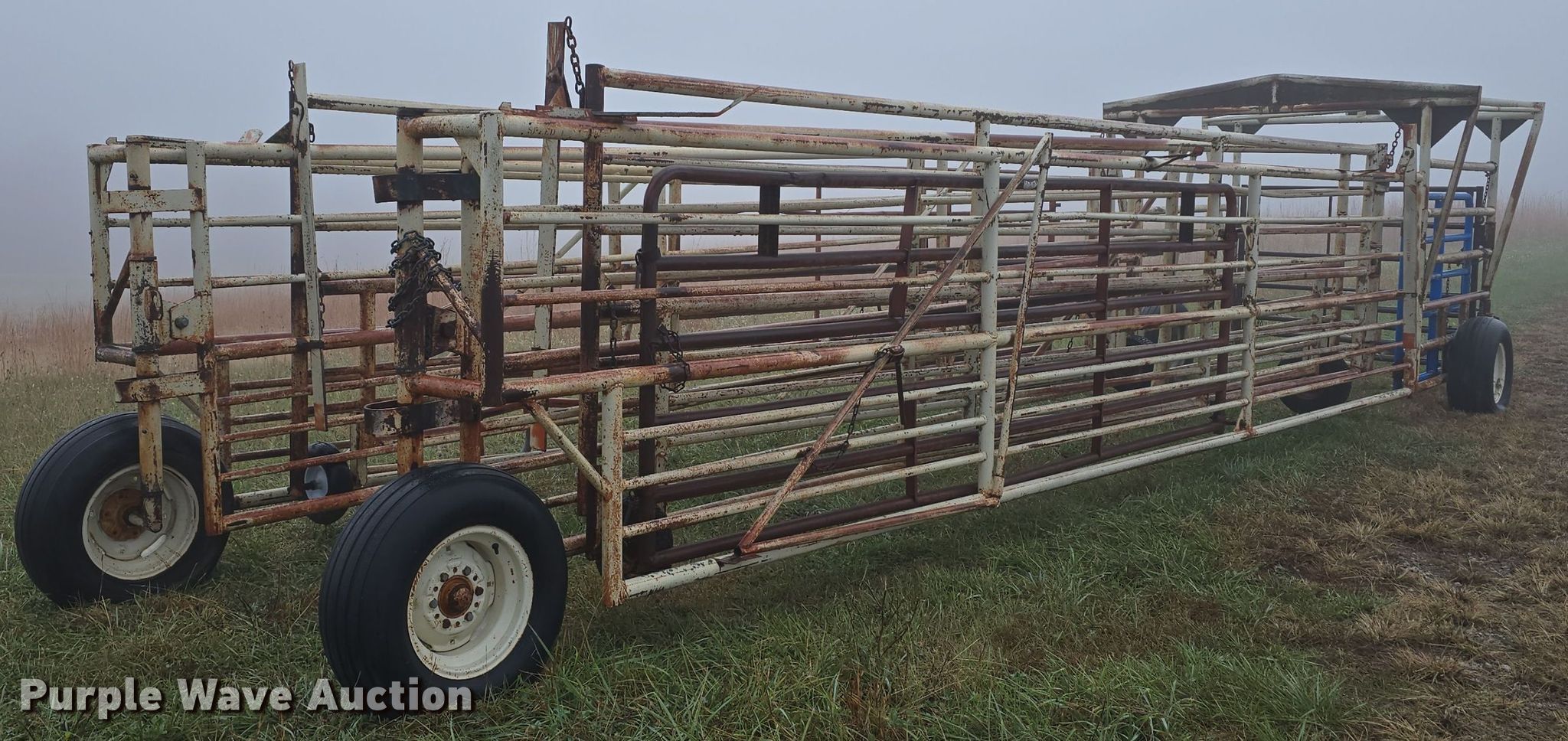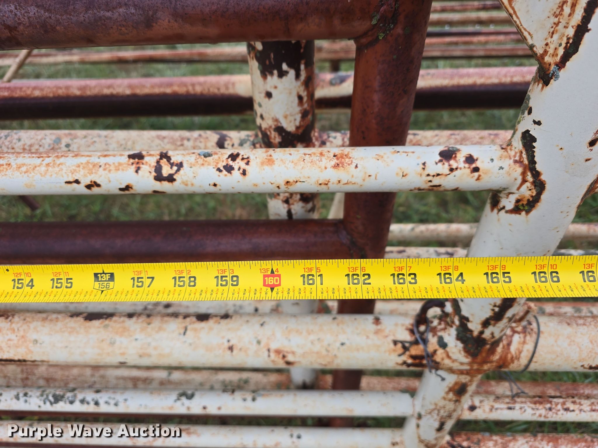 Wilson Corral livestock corral. Serial: 0098. Features Overall dimensions: 36' L x 96" W, (2) panels 24' 6" L x 56" H, (2) panels 20' L x 56" H, (2) 22' 6" L x 56" H, (3) gates: 68" W x 52" H, Gate: 16' L x 60" H, Gate: 14' L x 52" H. Tires Size: 11L-15, (2) gate tires: 16x6.50-8, (2) gate tires: 4.00-6. Bethany, MO 64424