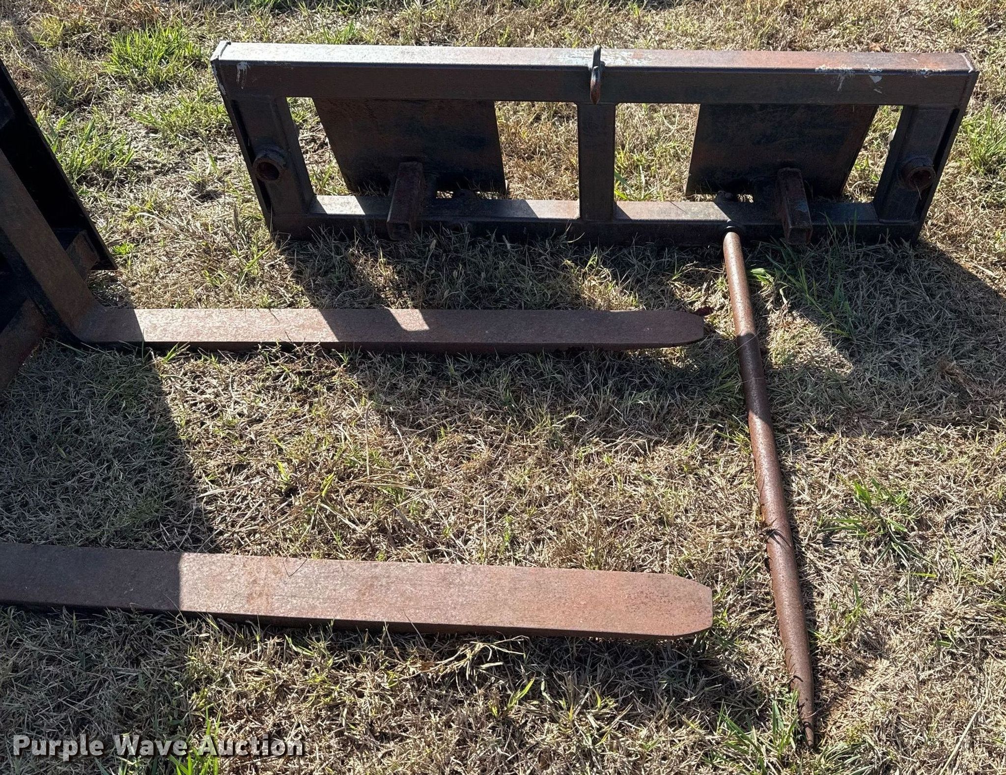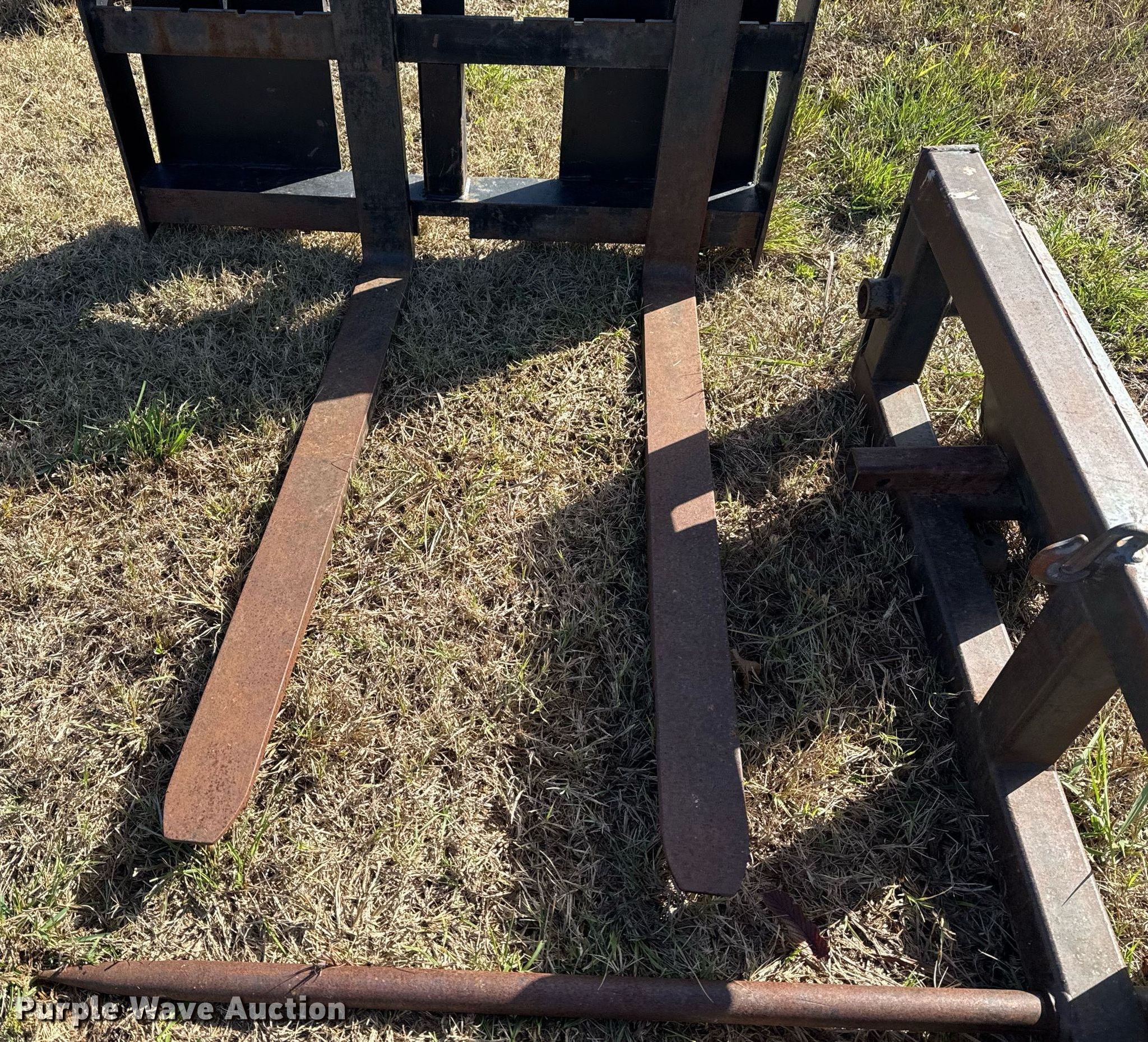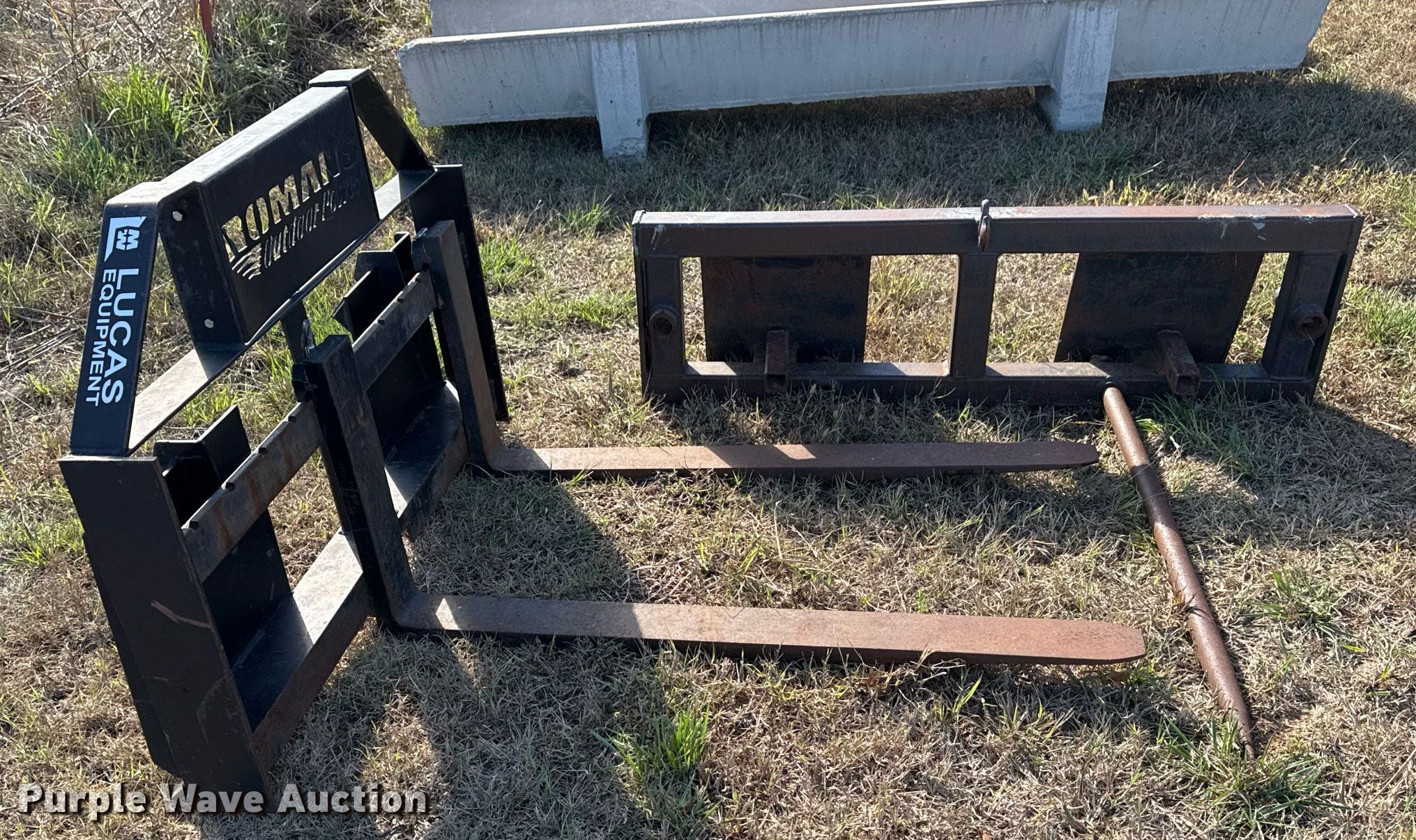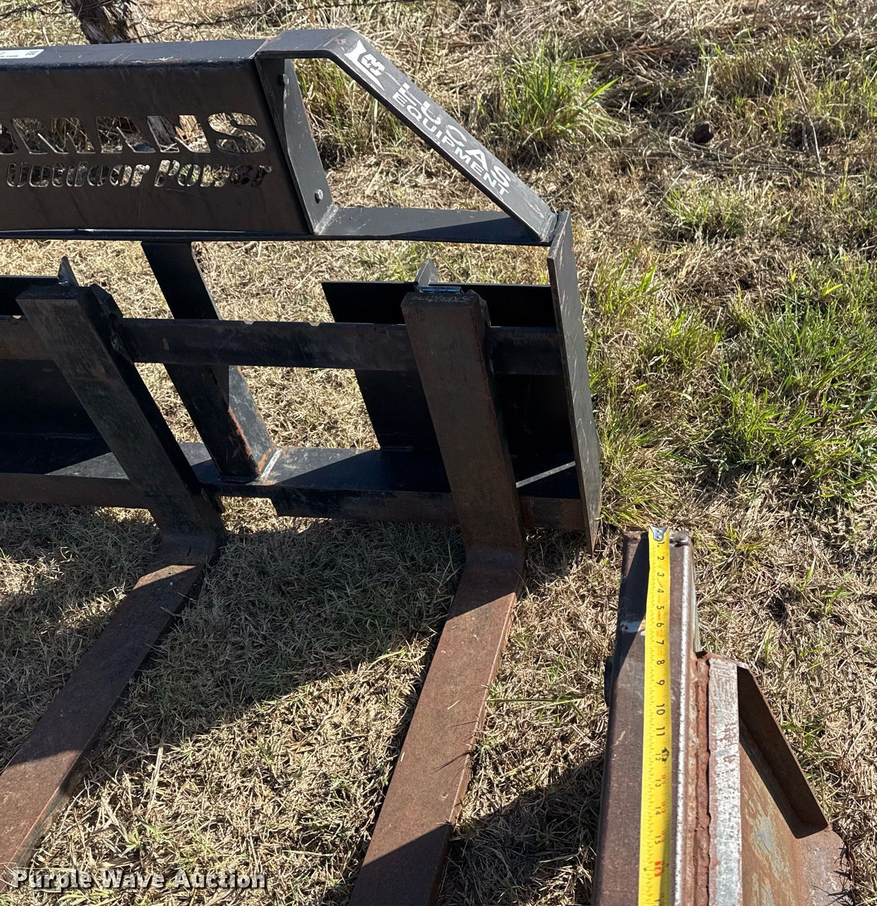 Purple Wave is selling a used Skid Steer Attach. in Oklahoma. This item is a Skid steer attachments with the following: Lucas Metal Works Inc. P-SS-17 forks, Serial: 1216, Length: 48", Bale spear, Length: 43"