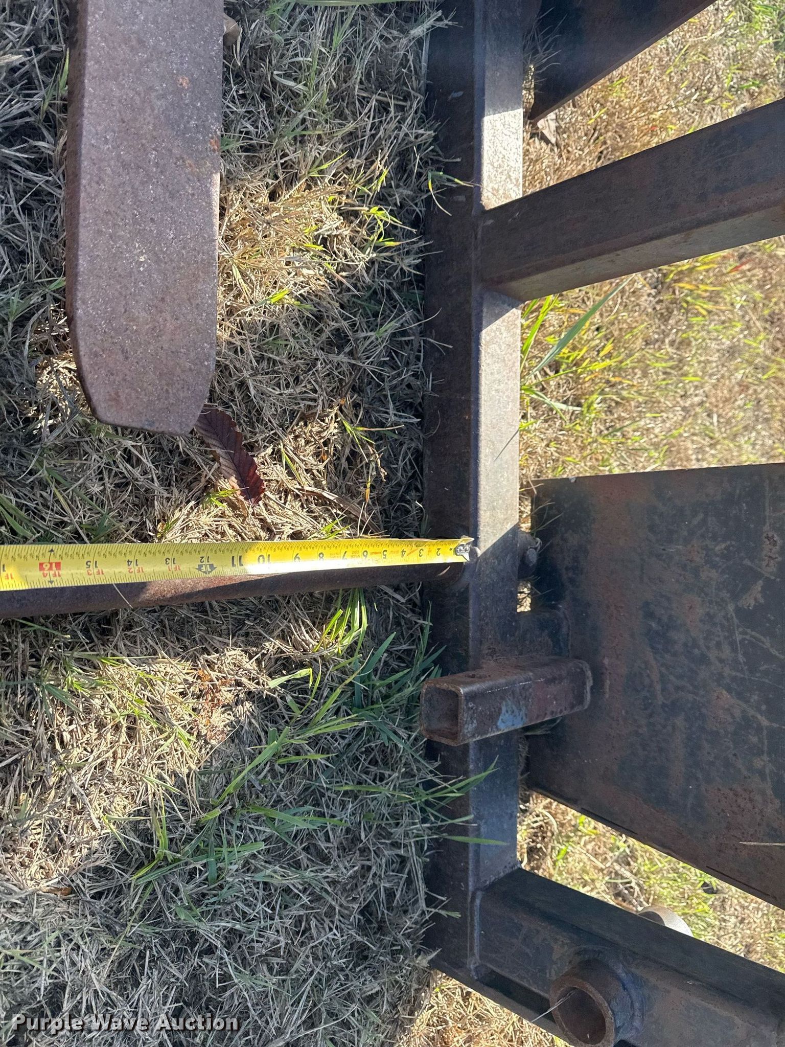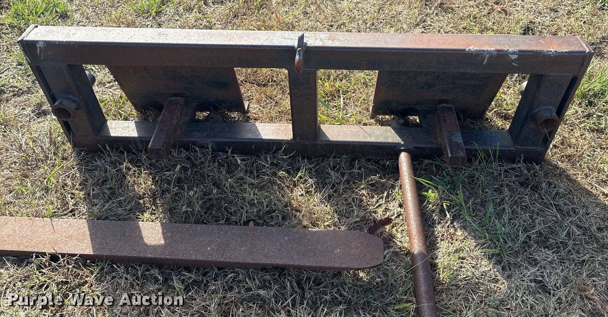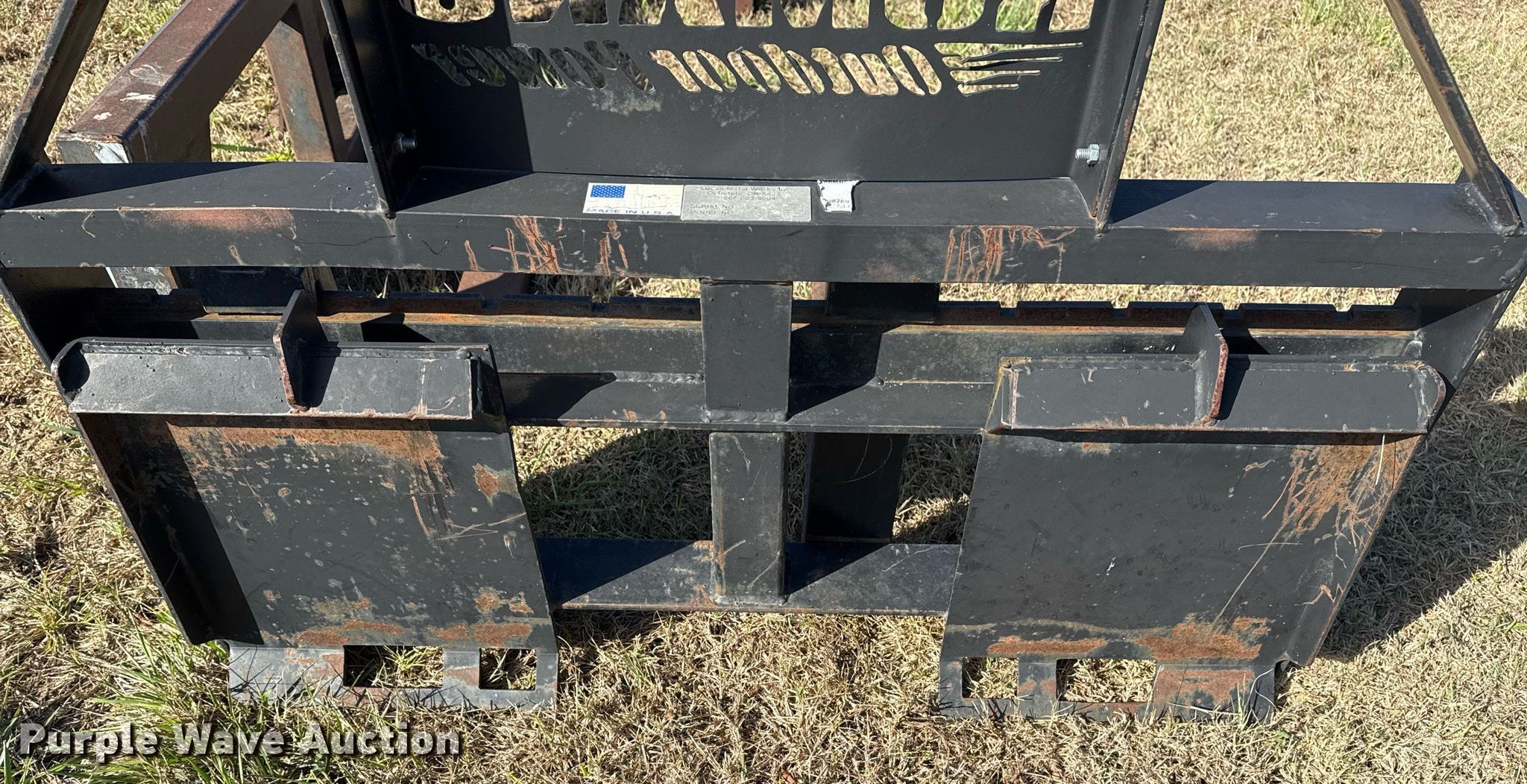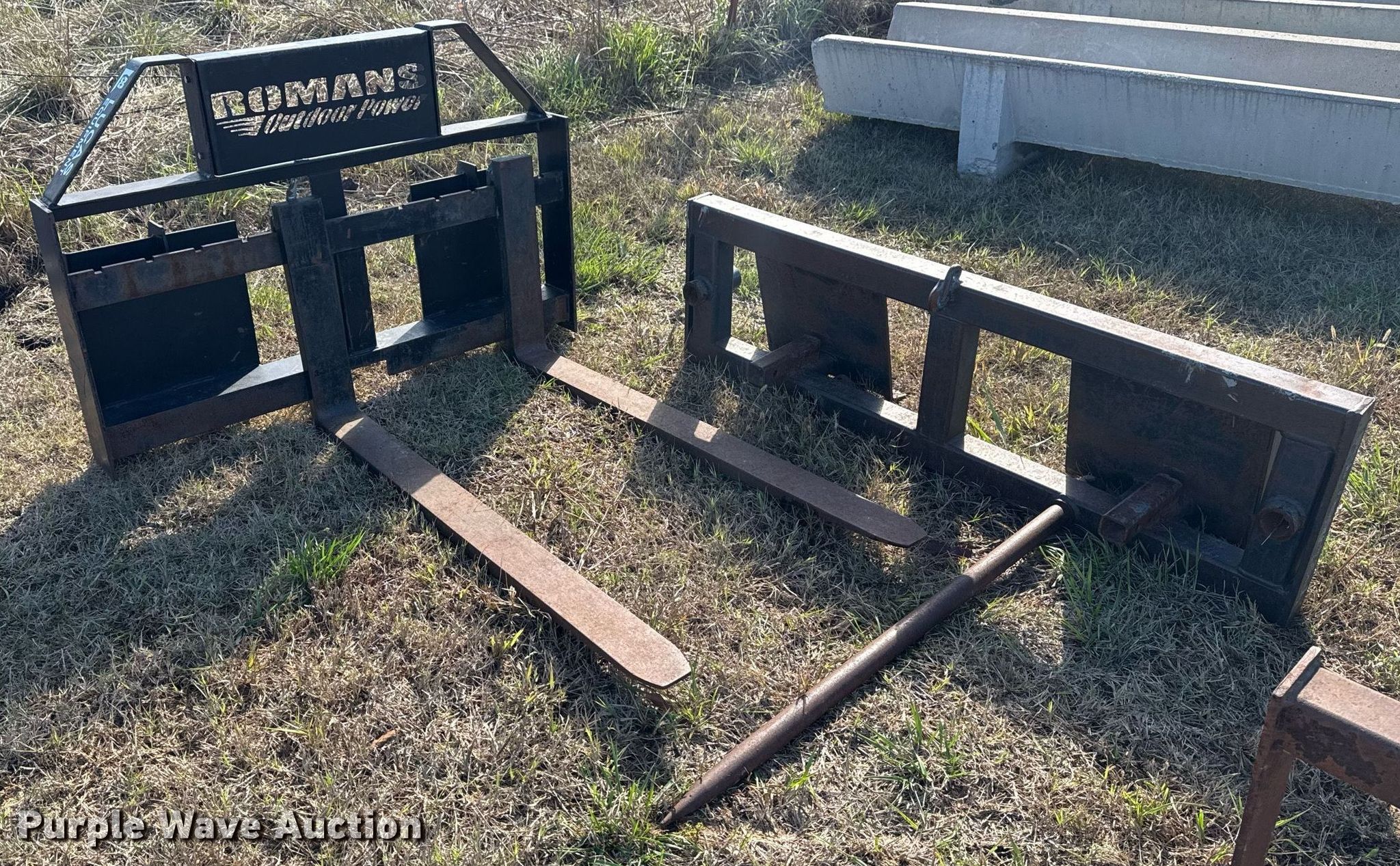 Purple Wave is selling a used Skid Steer Attach. in Oklahoma. This item is a Skid steer attachments with the following: Lucas Metal Works Inc. P-SS-17 forks, Serial: 1216, Length: 48", Bale spear, Length: 43"