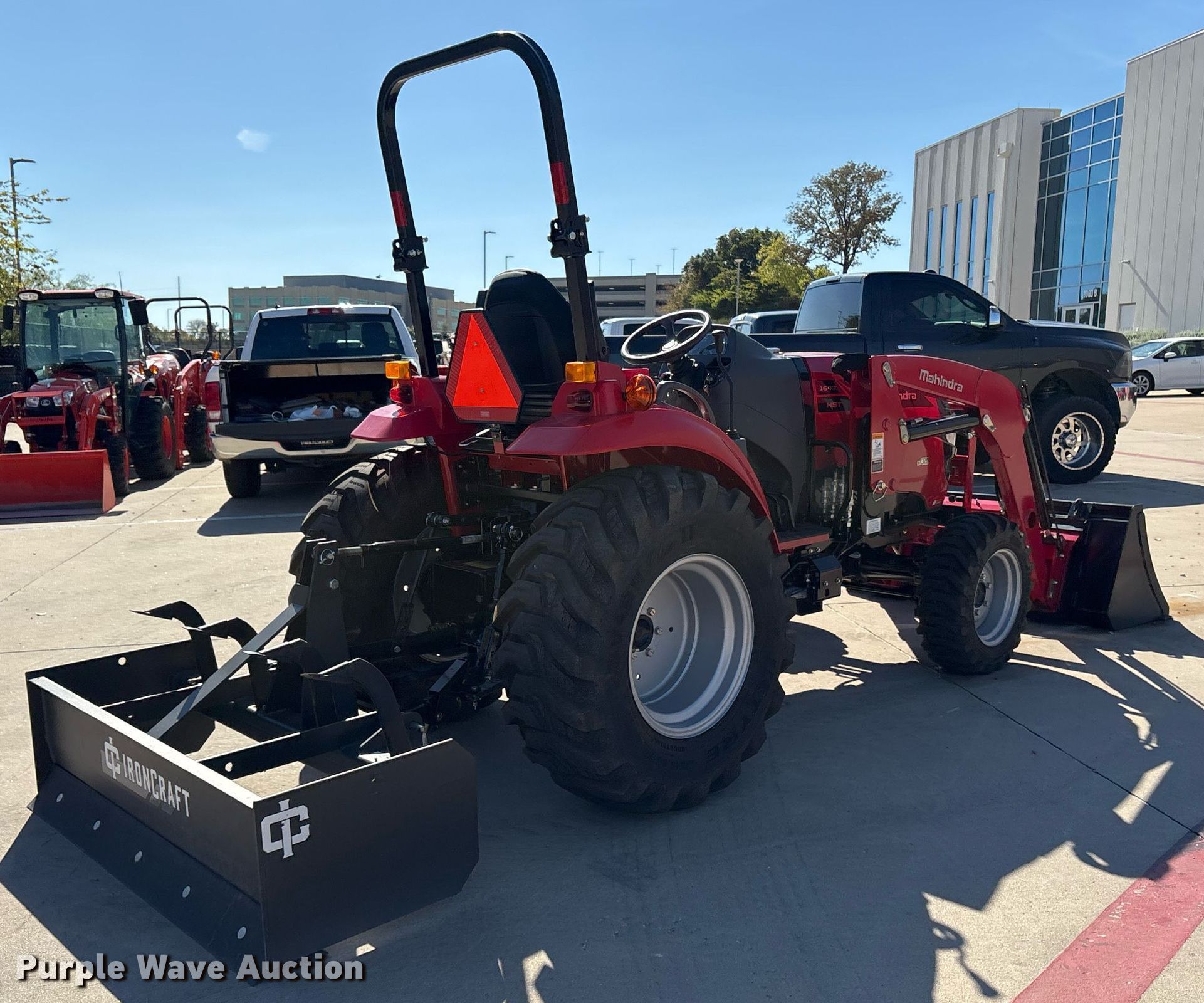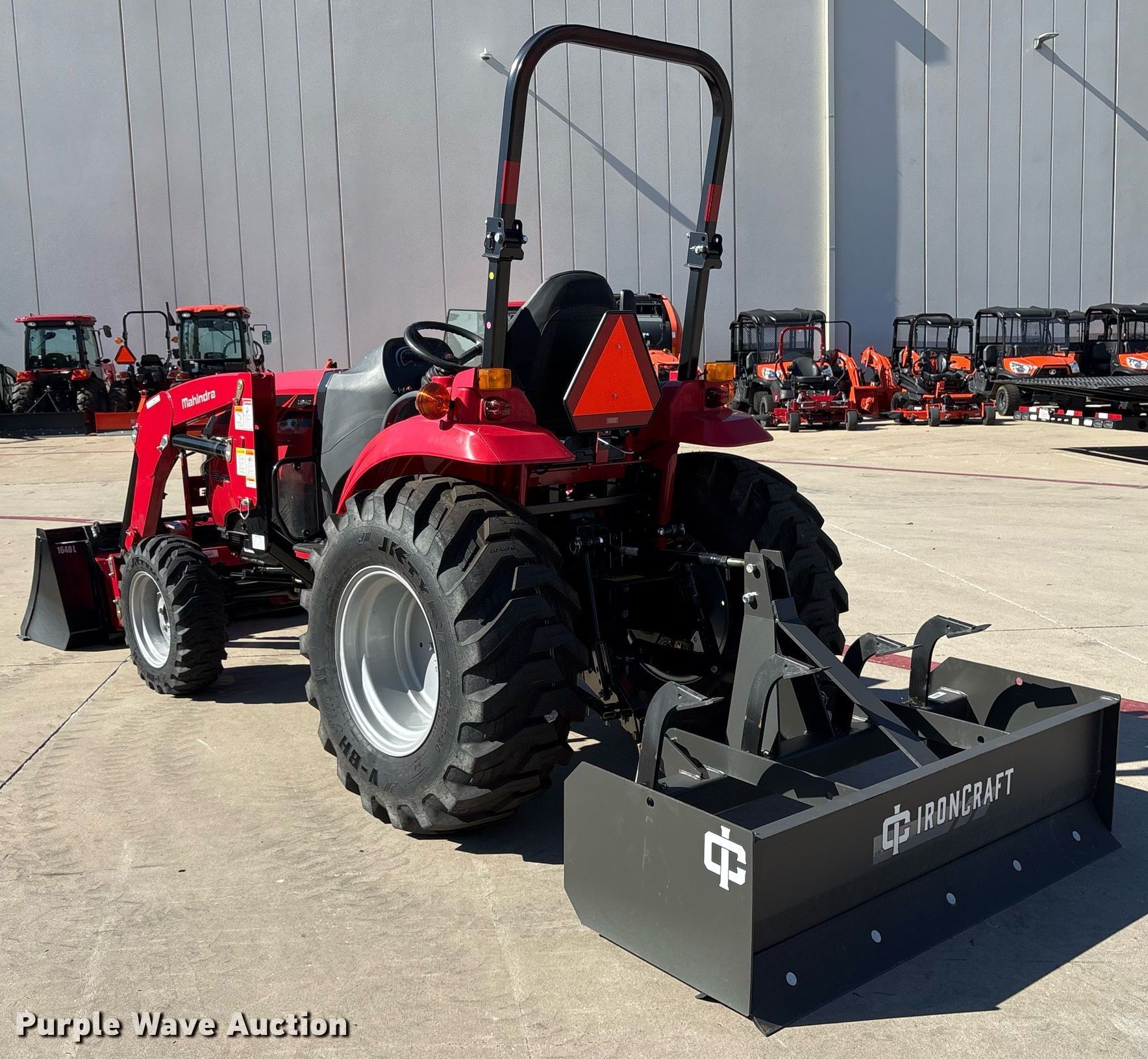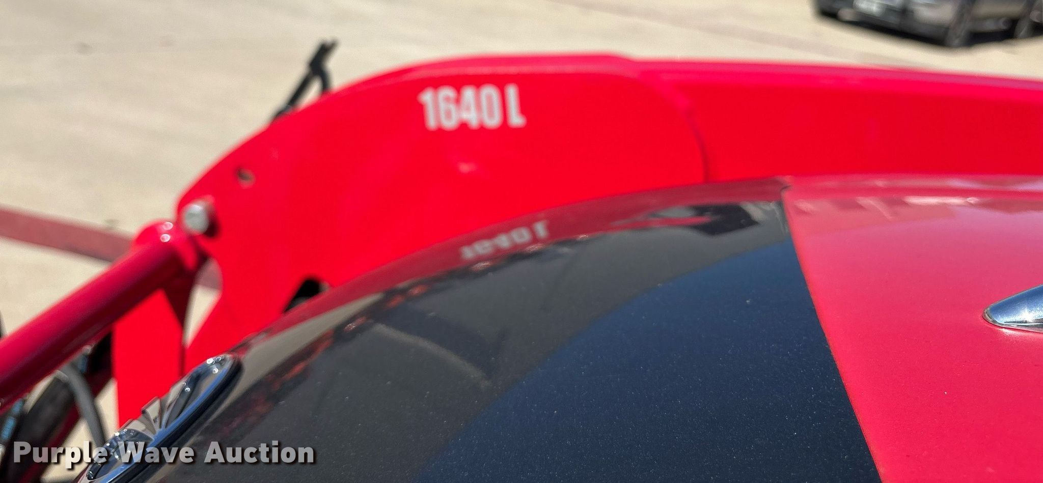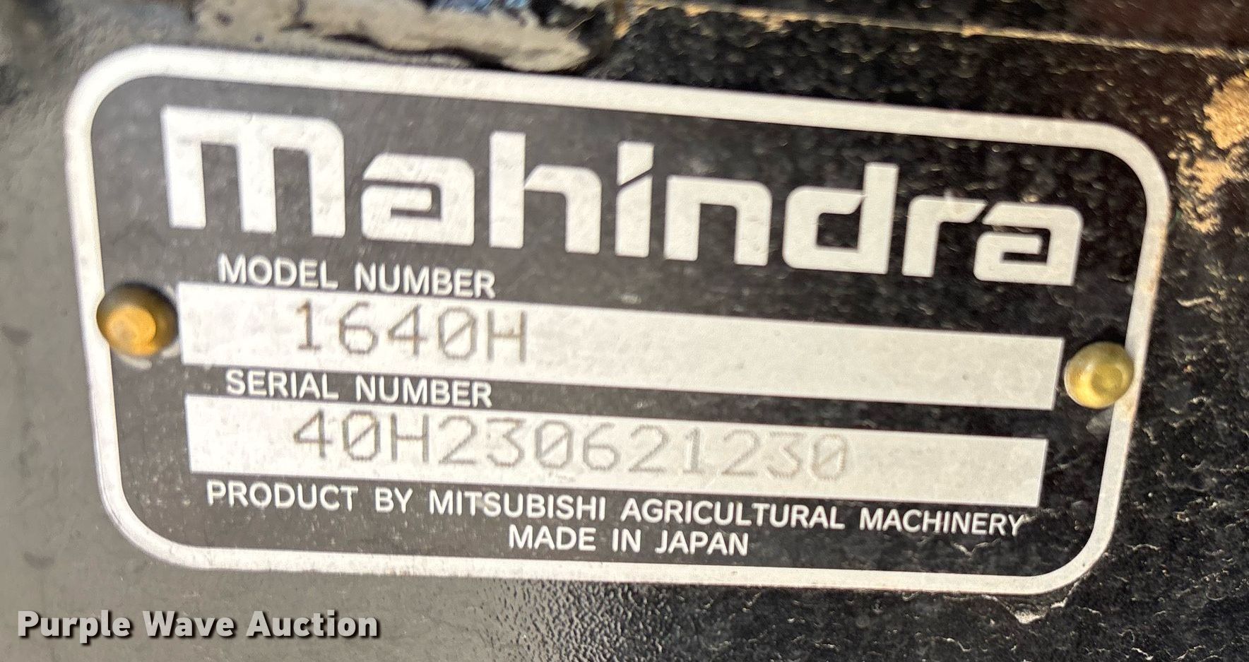 2023 Mahindra 1640 HST MFWD tractor. Hours: 5 on meter, Serial: 40H230621230. Engine Mahindra CE-38, Displacement: 2.731L, Cylinders: 4, Fuel type: Diesel, kW: 28. Transmission Hydrostatic, Three speed travel, Differential lock. Features PTO: 540, Three point Top link, Loader Mahindra 1640L, Controls: Joystick, Bucket Width: 65", Box blade IronCraft, Width: 60", Draw bar. Tires Front: 28x8.50-15NHS, Rear: 43x16.00-20. Kubota Tractor Corp. Grapevine, TX 76051