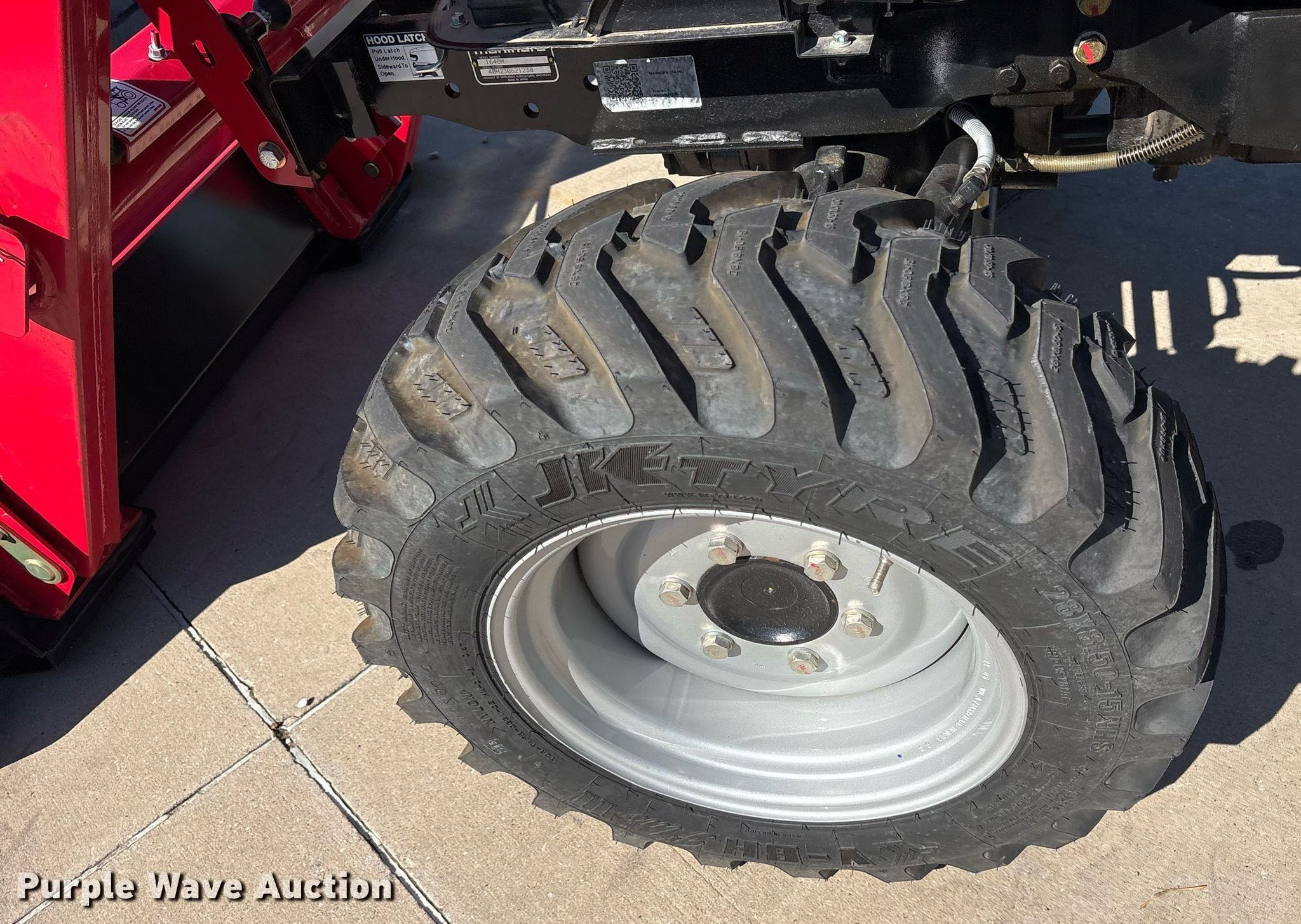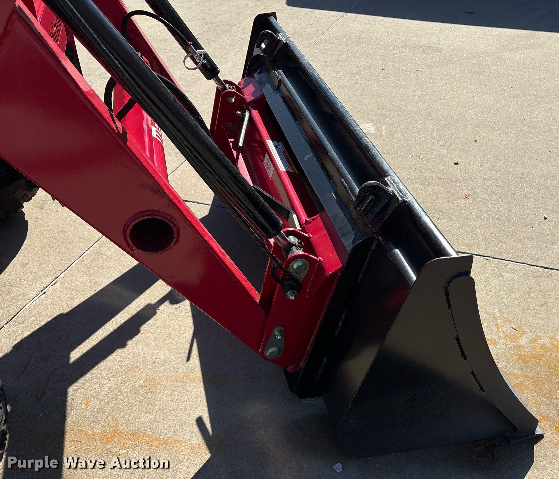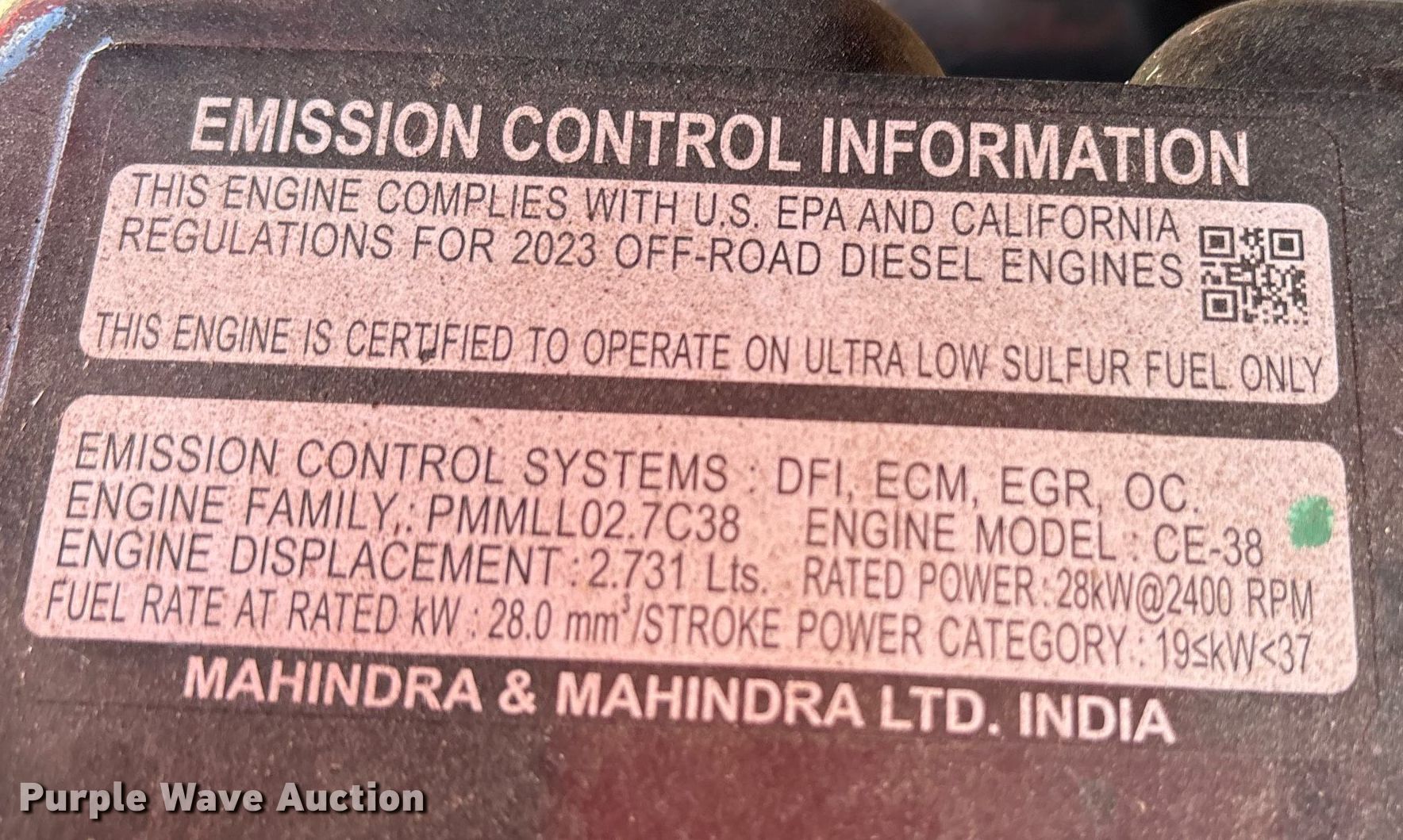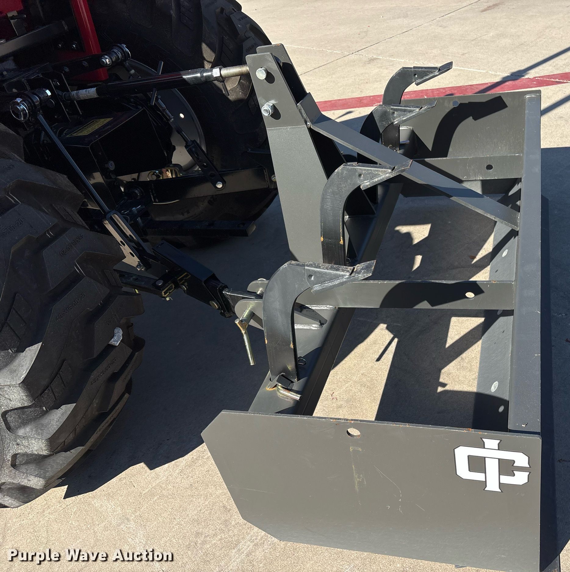 2023 Mahindra 1640 HST MFWD tractor. Hours: 5 on meter, Serial: 40H230621230. Engine Mahindra CE-38, Displacement: 2.731L, Cylinders: 4, Fuel type: Diesel, kW: 28. Transmission Hydrostatic, Three speed travel, Differential lock. Features PTO: 540, Three point Top link, Loader Mahindra 1640L, Controls: Joystick, Bucket Width: 65", Box blade IronCraft, Width: 60", Draw bar. Tires Front: 28x8.50-15NHS, Rear: 43x16.00-20. Kubota Tractor Corp. Grapevine, TX 76051