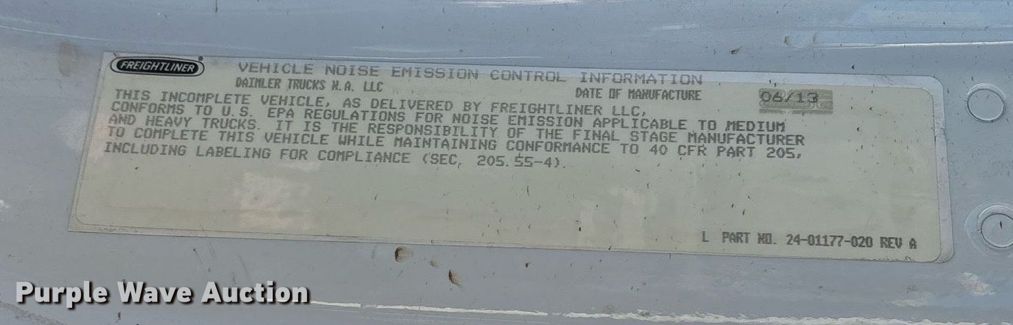 2014 Freightliner Business Class M2 106 flatbed truck. Miles: 200,210 on odometer, VIN: 1FVACWDU4EHFT1536, Unit #: 2619. Engine Cummins ISB, Displacement: 6.7L, Cylinders: 6, Fuel type: Diesel. Transmission Manual, Speed: 6. Chassis Axles: Single, Suspension: Spring, Brakes: Hydraulic, GVWR: 33,000 lbs. Interior AC, Heat, Heated mirrors, Cruise control. Features Flatbed MBS, Serial: 027813, 14' 8" L x 8' W. Tires Size: 255/70R22.5. Notes Engine issues, goes into limp mode , Dead battery, Non-operational unit Unit must be towed or hauled. Oklahoma title. Title distribution may be delayed up to 30 days from verification of funds. Wilbert Funeral Services. Sulphur, OK 73086