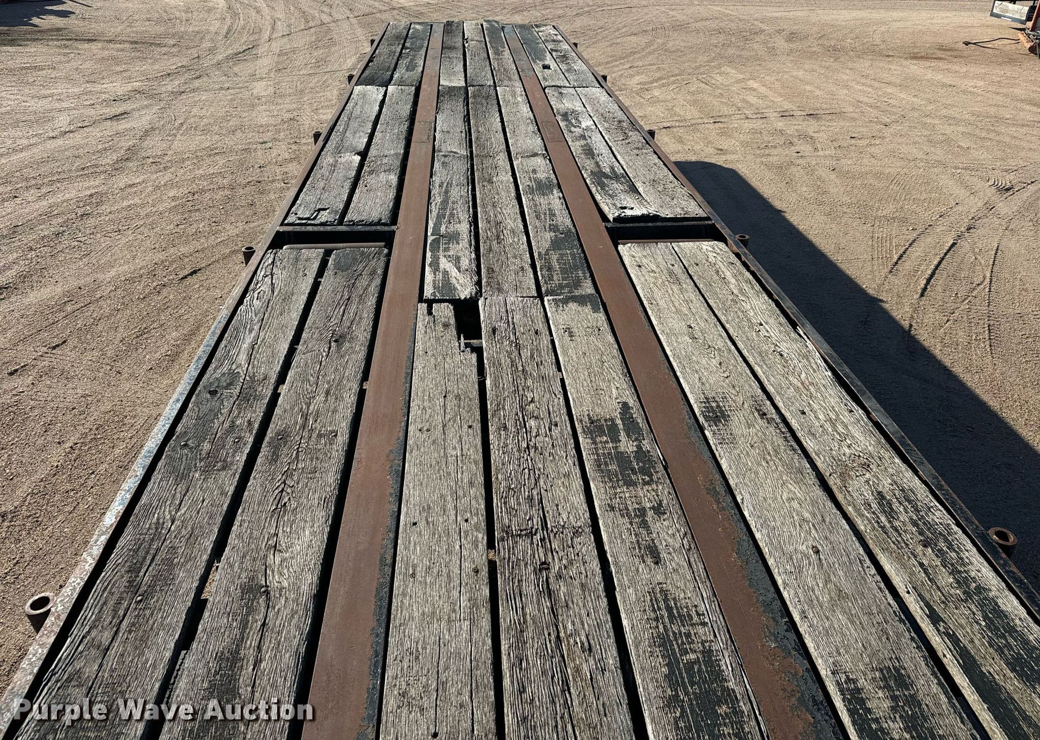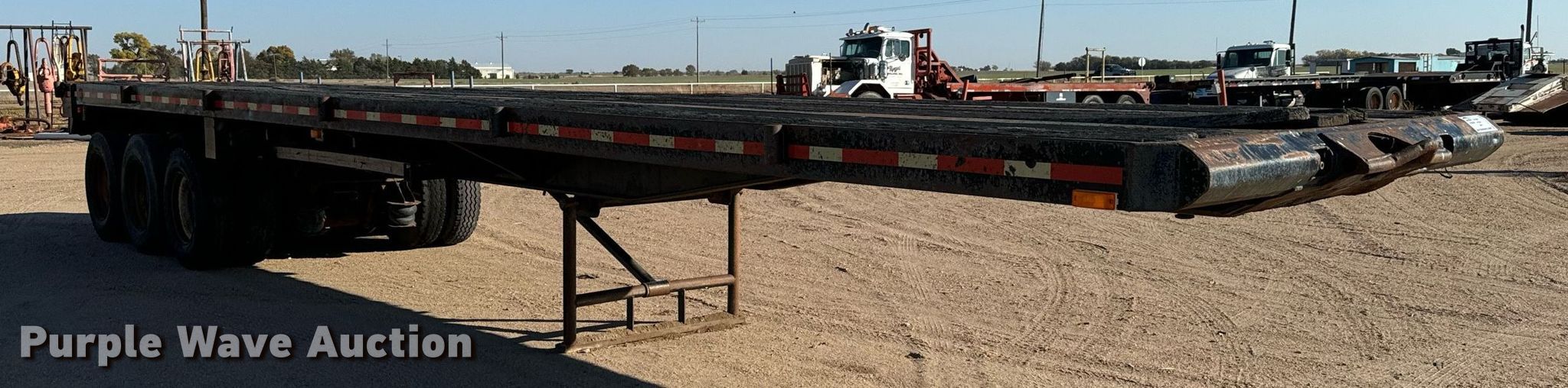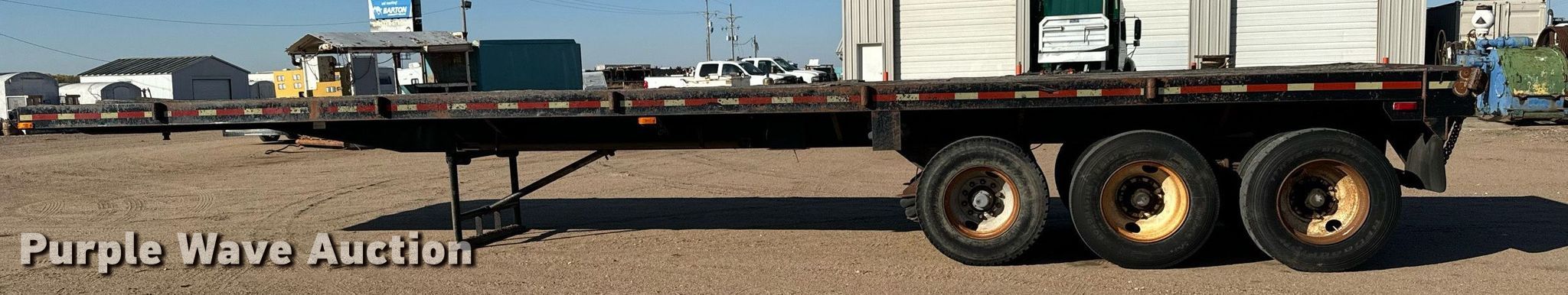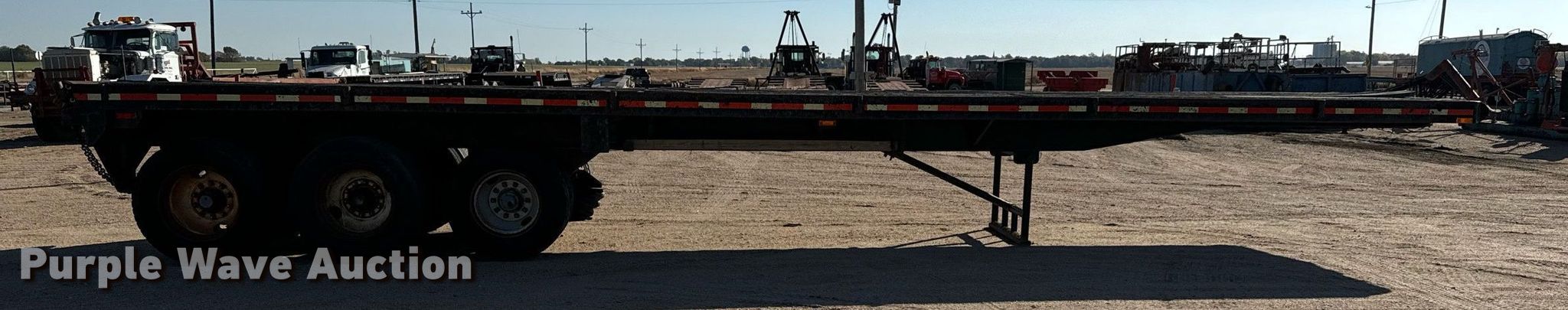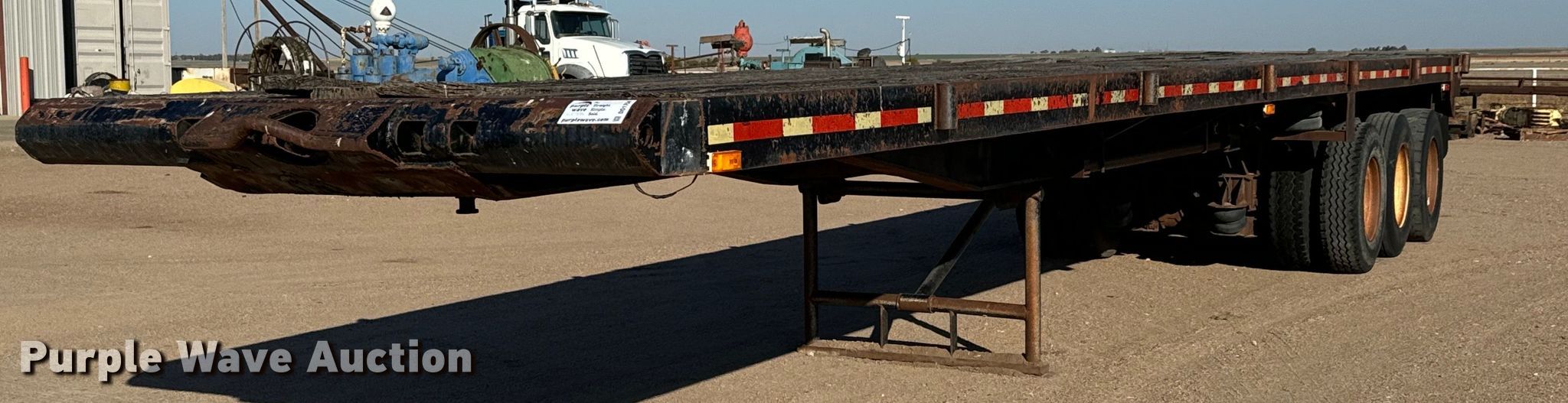 1980 Shop built oilfield trailer. VIN: TR145779. Dimensions Overall: 41' L x 102" W, Deck: 41' L x 96" W, Deck height: 59". Features Deck type: Wood, Rolling tailboard. Chassis Landing gear: Dual, Suspension: Spring, Brakes: Air, Axles: Triple. Tires Steel wheels, Size: 11R22.5, 11R24.5. Kansas title. Flex Inc. Ellinwood, KS 67526