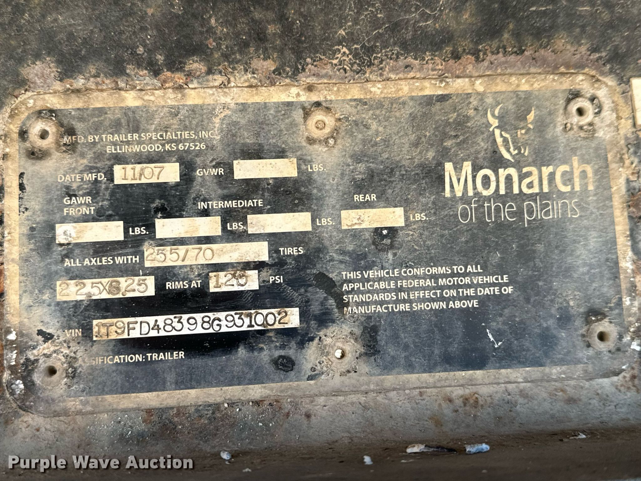 2008 Monarch drop deck oilfield trailer. VIN: 1T9FD48398G931002, Unit #: 6-1. Dimensions Overall: 47' 6" L x 104.5" W, Deck: 36' 4" L x 98" W, Top deck length: 8'. Features Deck type: Steel, Wood, Rolling tailboard. Chassis Suspension: Spring, Brakes: Air, Axles: Triple. Tires Steel wheels, Size: 255/70R22.5. Kansas title. Title distribution may be delayed up to 30 days from verification of funds. Southwind Drilling. Ellinwood, KS 67526