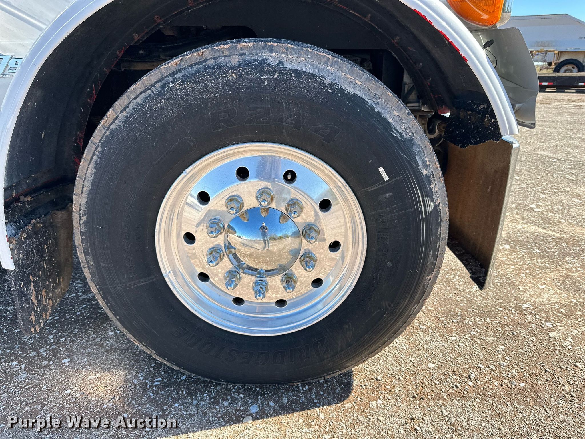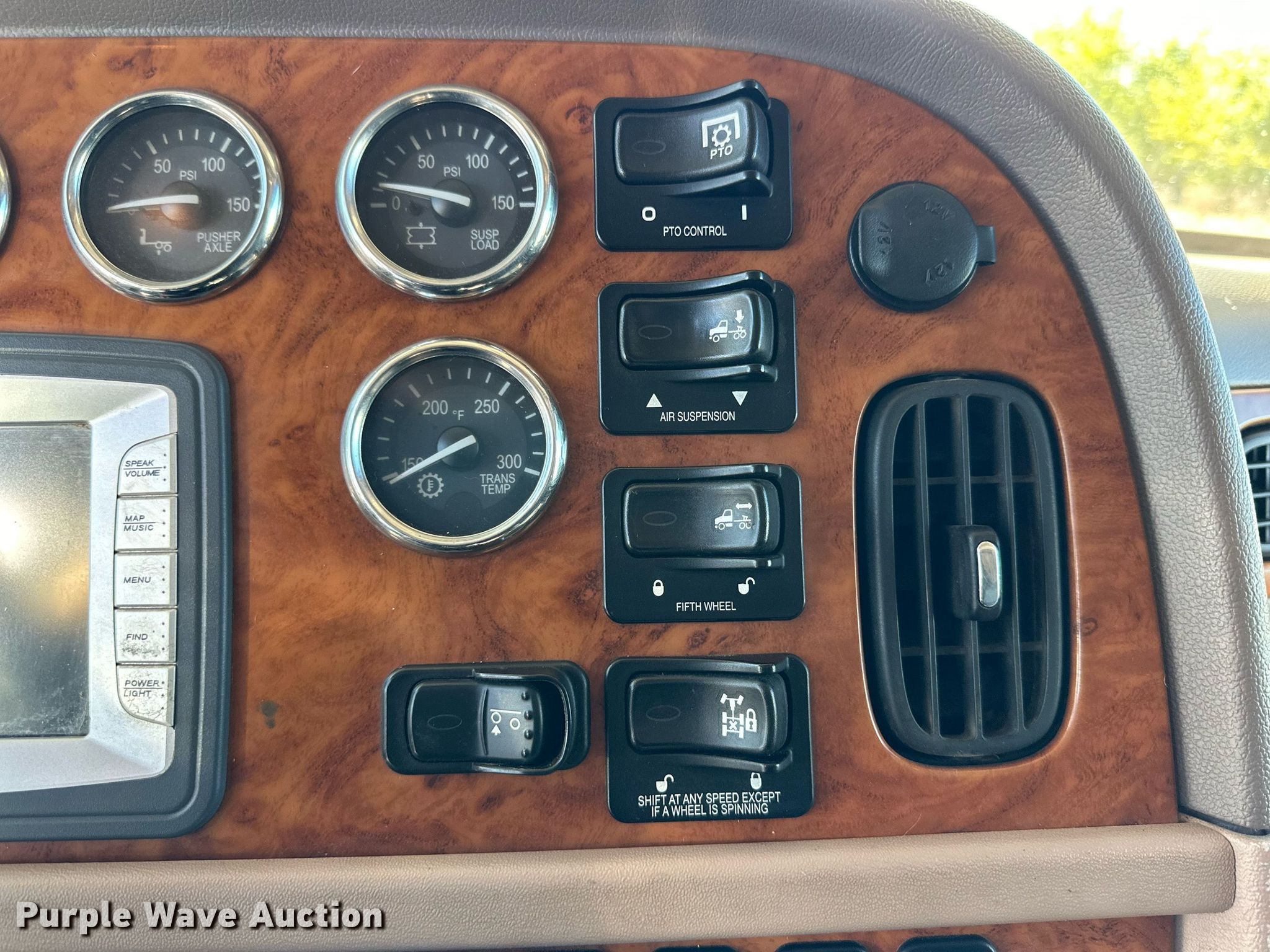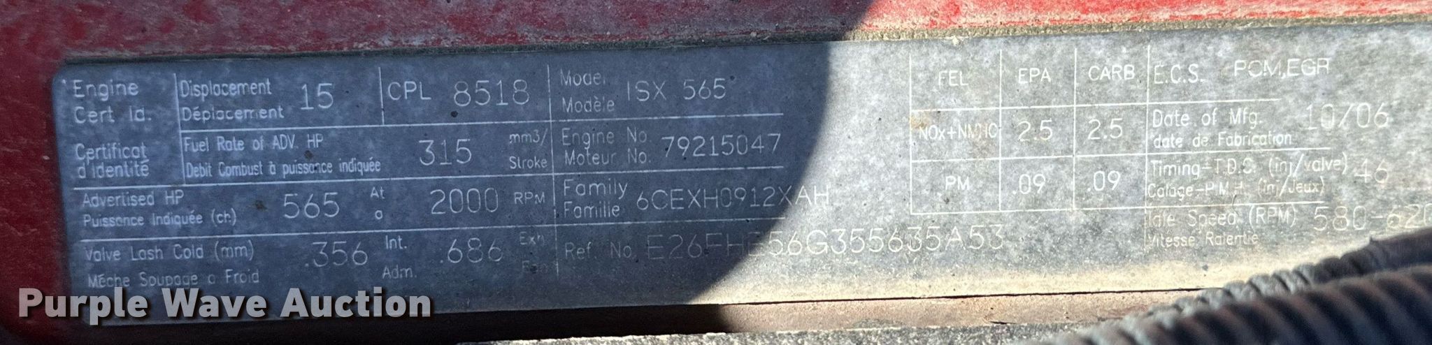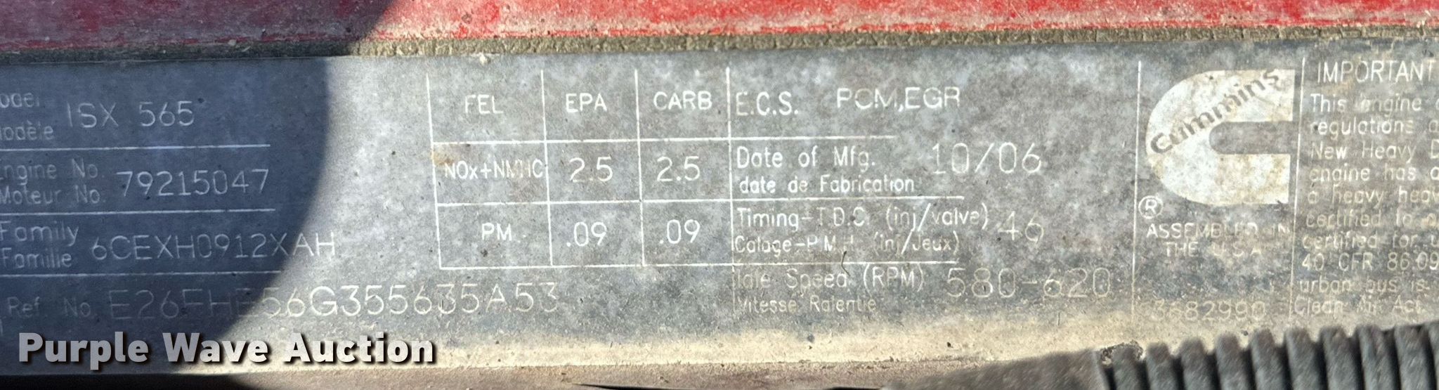 2007 Peterbilt 379 semi truck. Miles: 851,504 on odometer, Hours: 9,162 on meter, VIN: 1XP5D4EX17N735394. Engine Cummins ISX 565, Serial: 79215047, Displacement: 14.9L, Cylinders: 6, Fuel type: Diesel, HP: 565, Engine brake. Transmission Eaton Fuller, Manual, Speed: 18. Chassis Axles: Triple, Pusher axle, Differential lock: Inter-axle, Suspension: Air, Brakes: Air, PTO, Double frame, GVWR: 74,600 lbs FAWR: 14,320 lbs, IAWR: 23,000 lbs, RAWR: 23,000 lbs, Lift axle GAWR: 20,280 lbs. Interior AC, Heat, Power windows, Power locks, Cruise control, Air ride cab, Sleeper Sleeper length: 5' 6", Beds: Single, Refrigerator, Rear climate control, Auxiliary power unit Dynasys, Engine Yanmar.. Features Deck plate: Aluminum, Fifth wheel type: Air operated, Sliding, Fuel tank: Dual. Tires Size: 385/65R22.5, Lift axle: 255/70R22.5. Notes EGR deleted. Oklahoma title. Title has a lien that will be released following the close of the auction. Title distribution may be delayed up to 30 days from verification of funds. Reydon, OK 73660