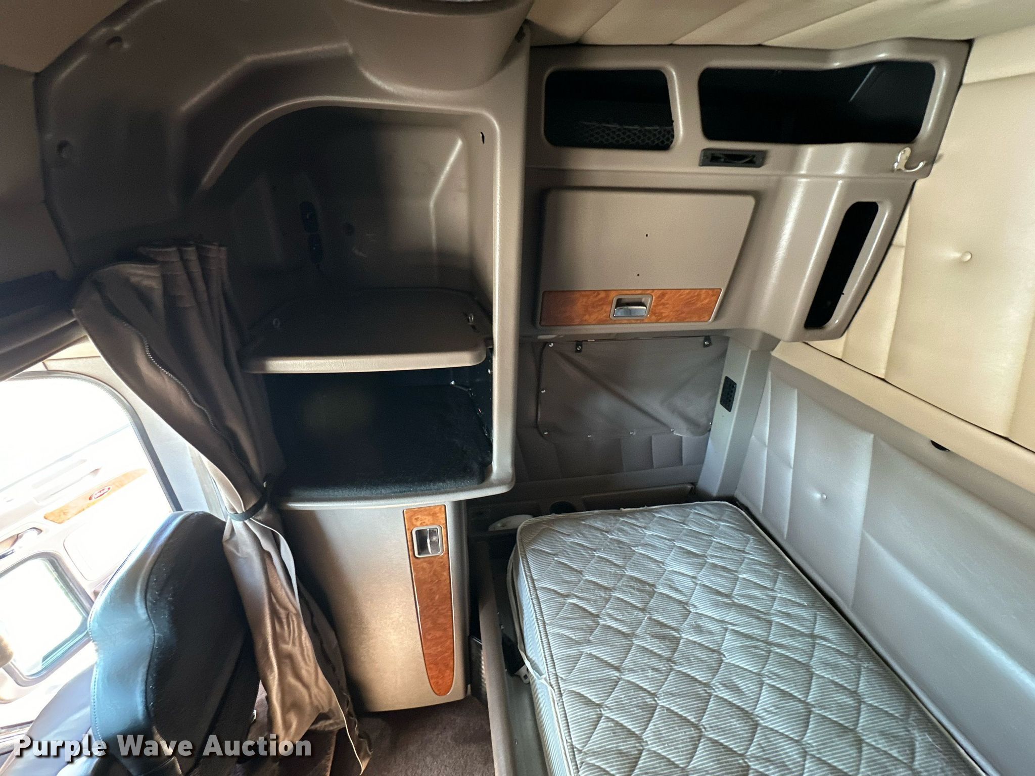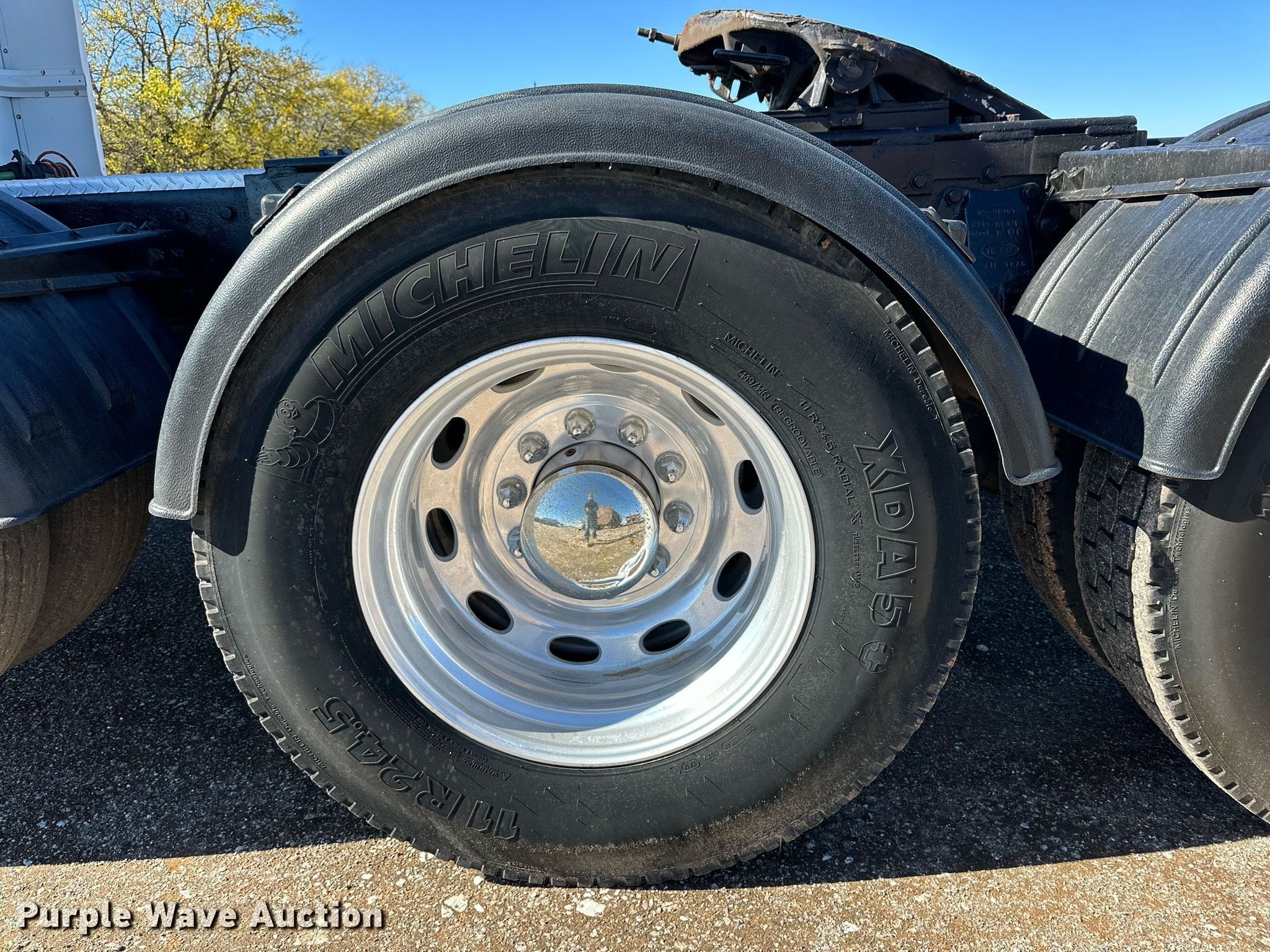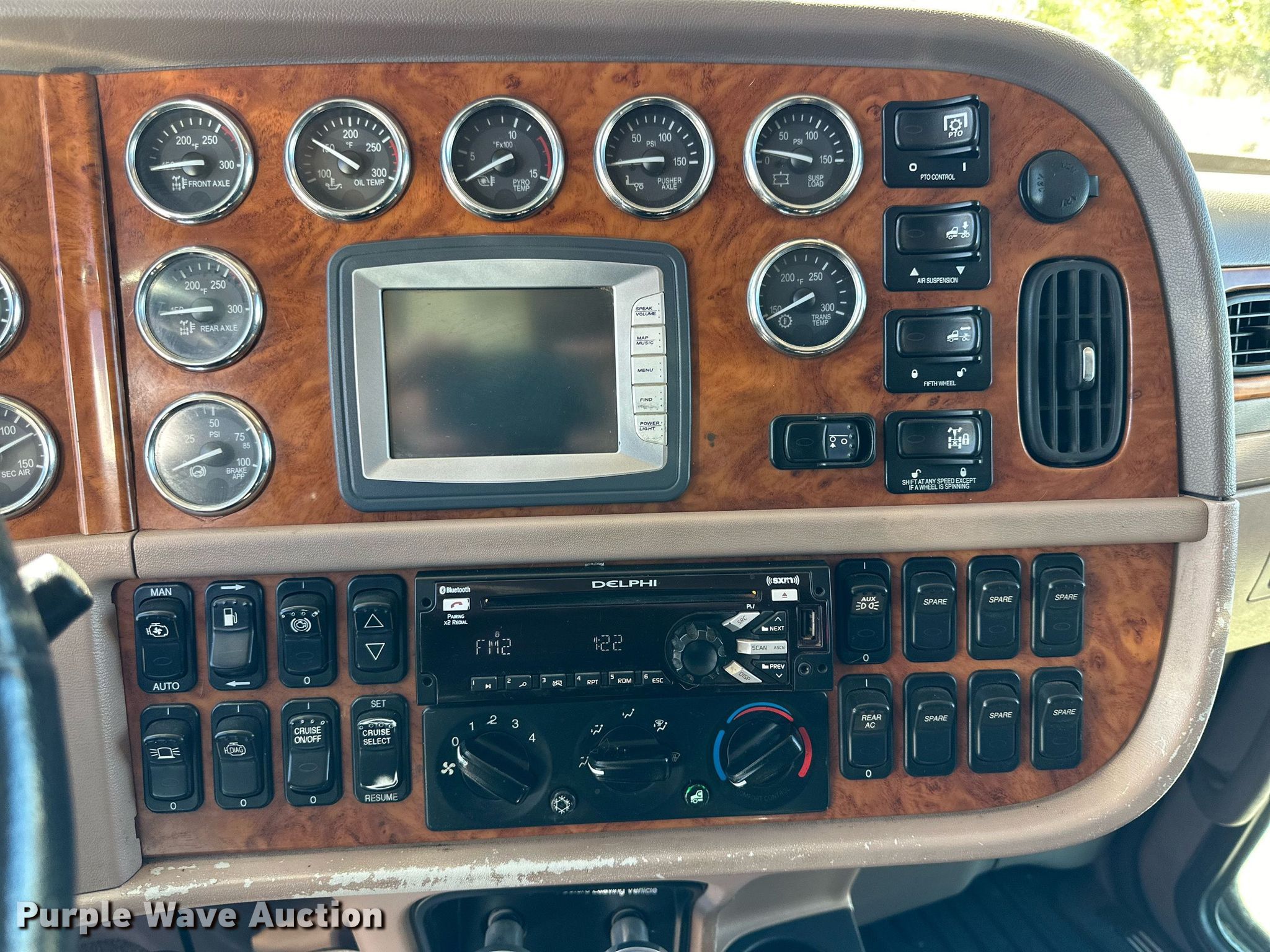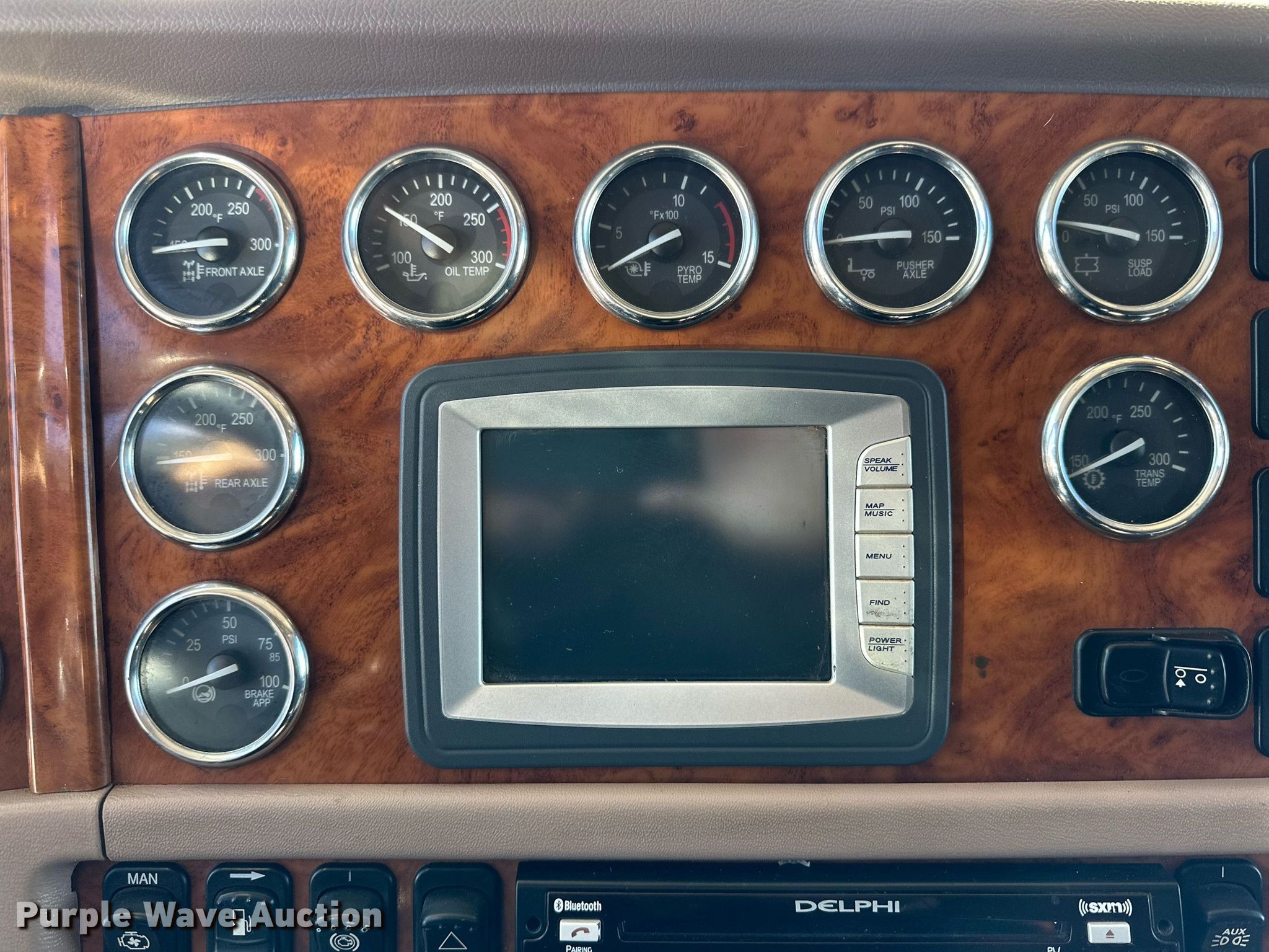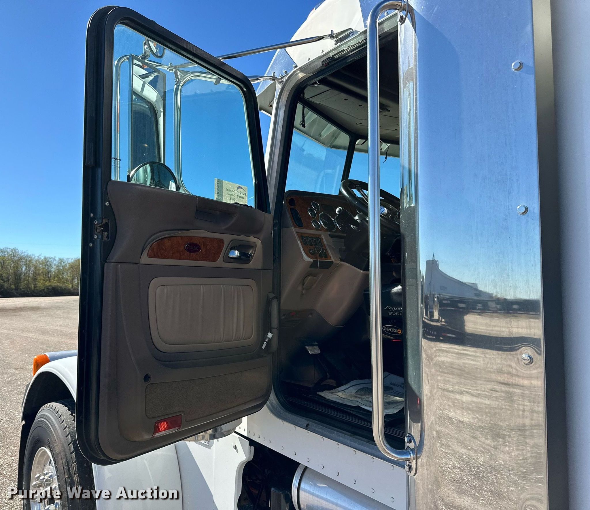 2007 Peterbilt 379 semi truck. Miles: 851,504 on odometer, Hours: 9,162 on meter, VIN: 1XP5D4EX17N735394. Engine Cummins ISX 565, Serial: 79215047, Displacement: 14.9L, Cylinders: 6, Fuel type: Diesel, HP: 565, Engine brake. Transmission Eaton Fuller, Manual, Speed: 18. Chassis Axles: Triple, Pusher axle, Differential lock: Inter-axle, Suspension: Air, Brakes: Air, PTO, Double frame, GVWR: 74,600 lbs FAWR: 14,320 lbs, IAWR: 23,000 lbs, RAWR: 23,000 lbs, Lift axle GAWR: 20,280 lbs. Interior AC, Heat, Power windows, Power locks, Cruise control, Air ride cab, Sleeper Sleeper length: 5' 6", Beds: Single, Refrigerator, Rear climate control, Auxiliary power unit Dynasys, Engine Yanmar.. Features Deck plate: Aluminum, Fifth wheel type: Air operated, Sliding, Fuel tank: Dual. Tires Size: 385/65R22.5, Lift axle: 255/70R22.5. Notes EGR deleted. Oklahoma title. Title has a lien that will be released following the close of the auction. Title distribution may be delayed up to 30 days from verification of funds. Reydon, OK 73660