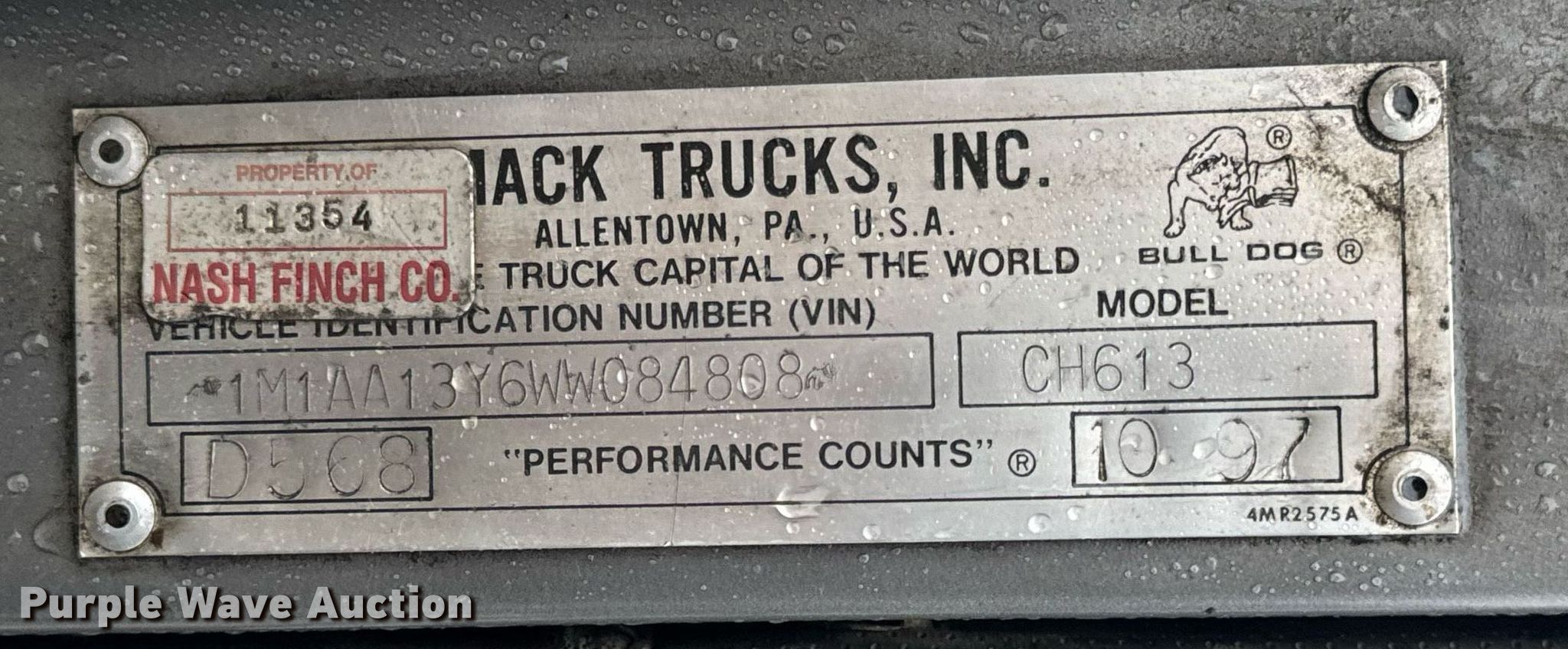 Purple Wave is selling a used Truck Tractor in Ohio. This item is a 1998 Mack CH600 semi truck with the following: Miles: 922,311 on odometer, VIN: 1M1AA13Y6WW084808