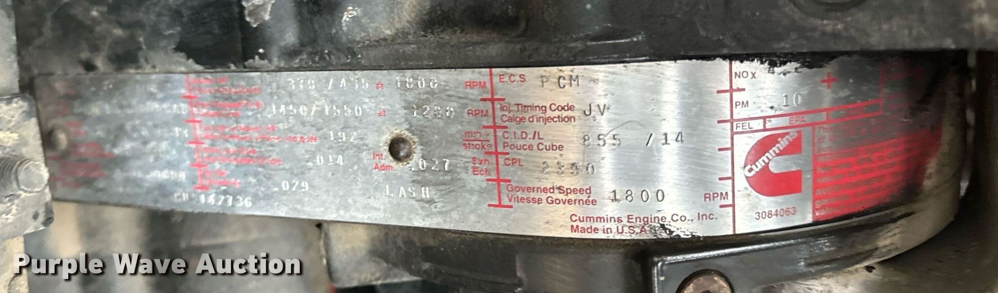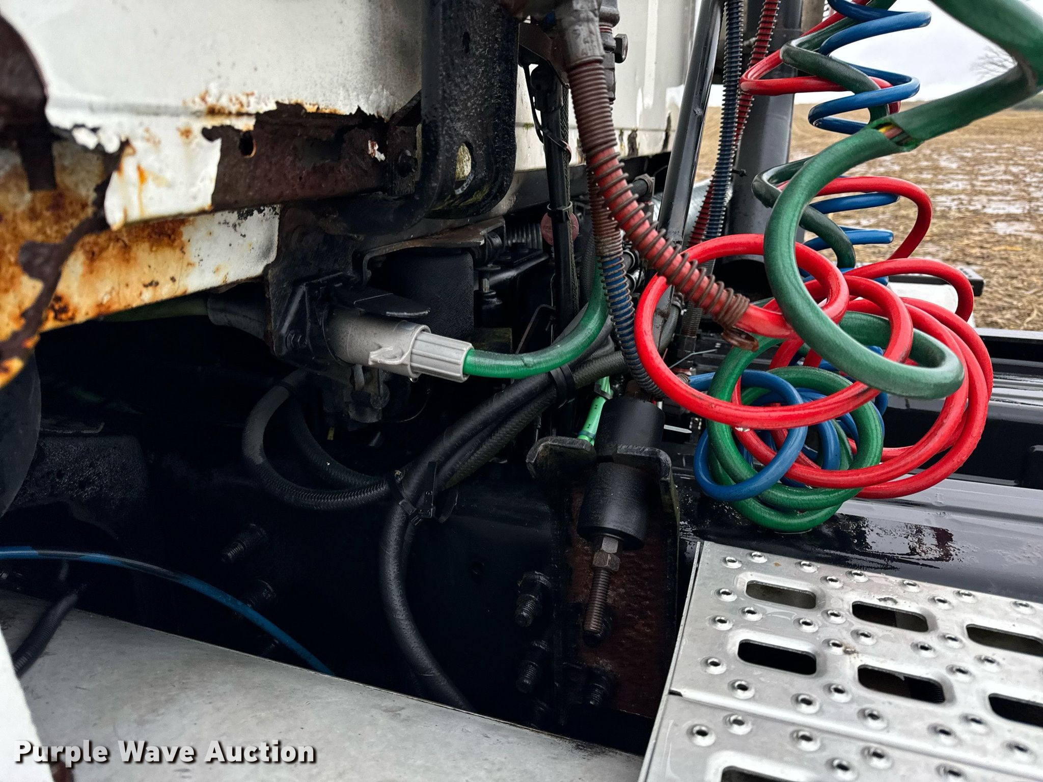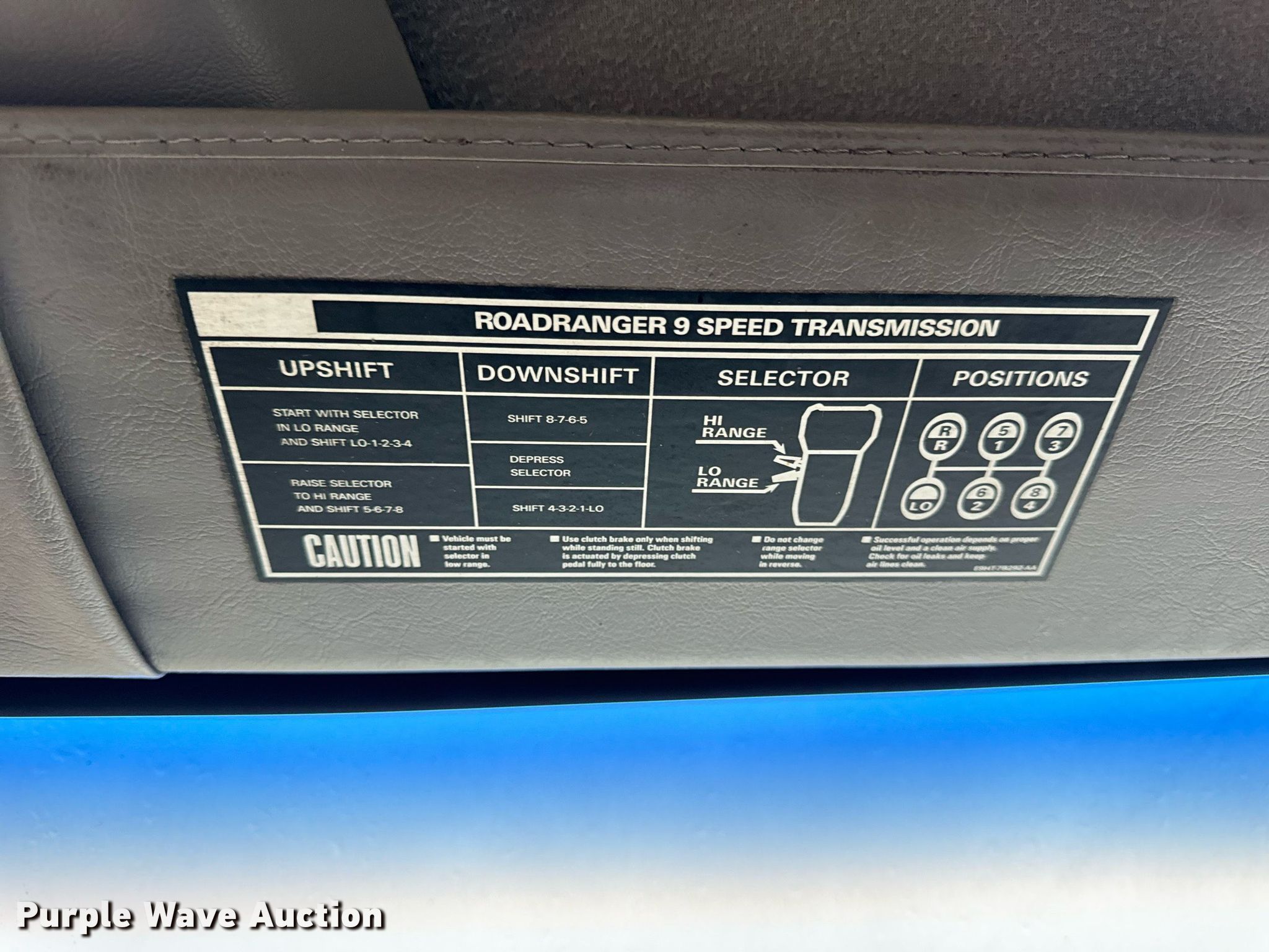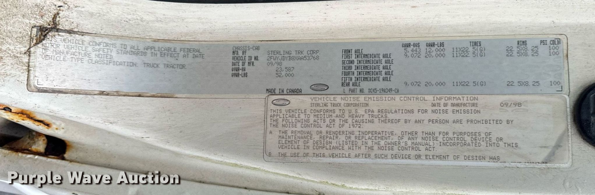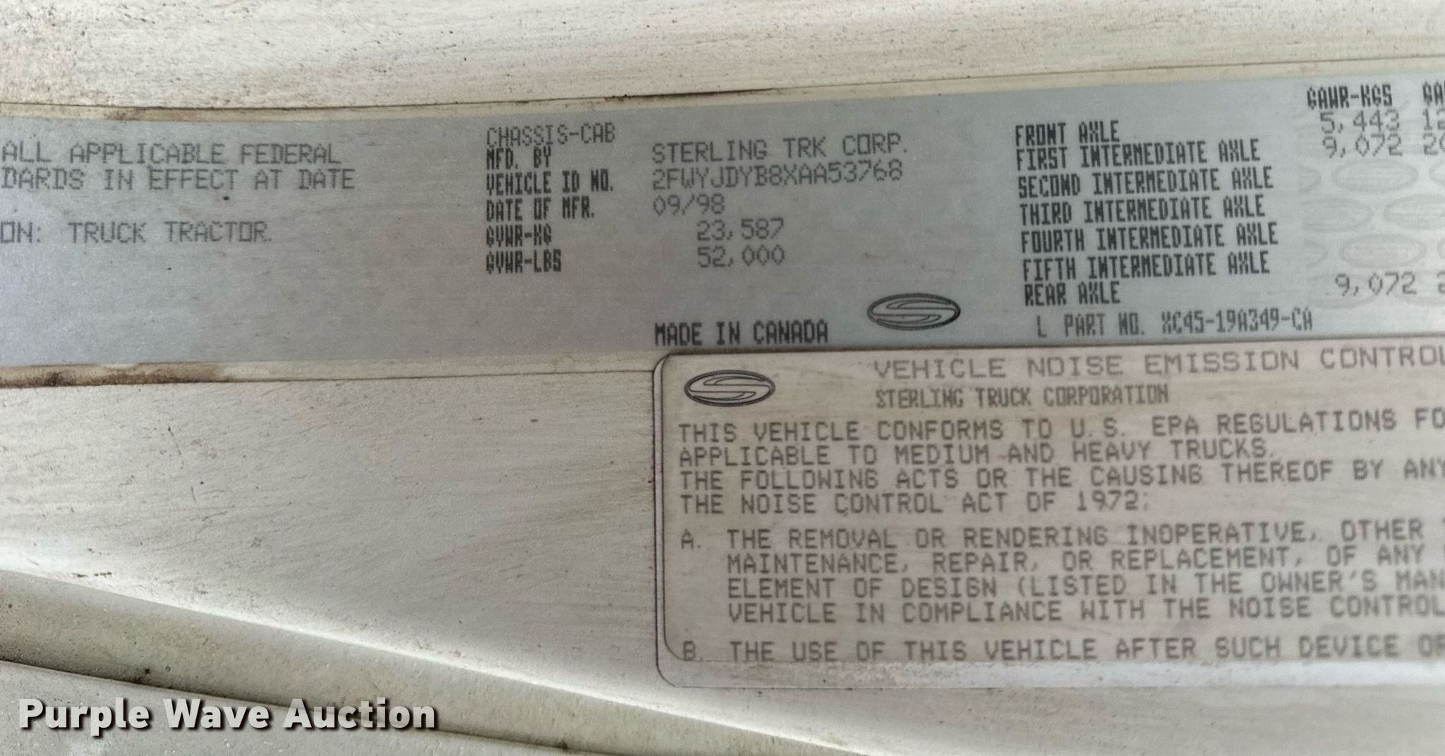 1999 Sterling semi truck. Miles: 474,892 on odometer, VIN: 2FWYJDYB8XAA53768. Engine Cummins, Cylinders: 6, Fuel type: Diesel. Transmission Roadranger, Manual, Speed: 9. Chassis Axles: Tandem, Differential lock: Inter-axle, Suspension: Air Dump valves, Brakes: Air, GVWR: 52,000 lbs FAWR: 12,000 lbs, IAWR: 20,000 lbs, RAWR: 20,000 lbs. Interior AC, Heat, Heated mirrors, Cruise control, Air ride cab. Features Fifth wheel type: Fixed, Fuel tank: Dual. Tires Size: 295/75R22.5. Notes Dash warning indicator: Stop engine, Dead battery, Non-operational AC, belt missing. Ohio title. Title distribution may be delayed up to 14 days from verification of funds. Mcintosh Ag Logistics. Cable, OH 43009