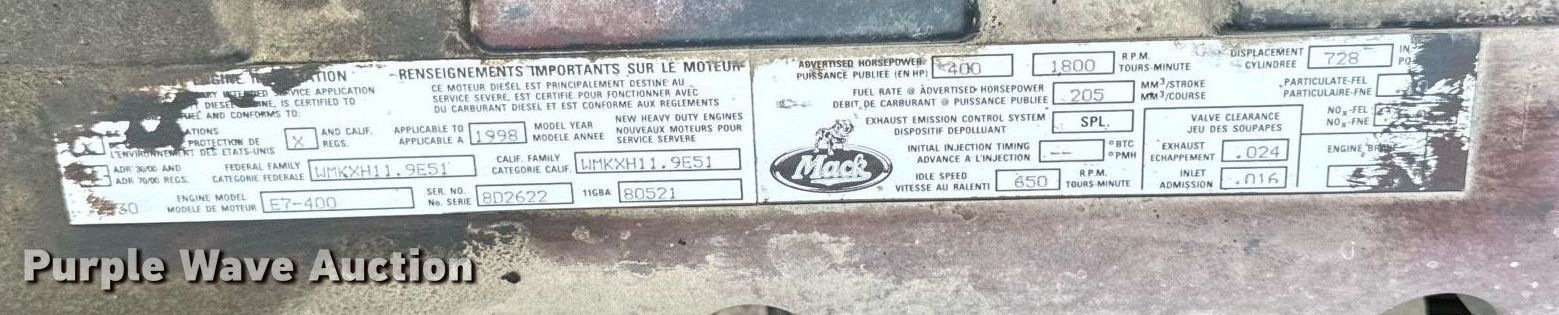 1998 Mack RD688S semi truck. Miles: 291,588 on odometer, Hours: 35,142 on meter, VIN: 1M1P270Y7WM042089, Unit #: 201. Engine Mack E7-400, Displacement: 12.0L, Cylinders: 6, Fuel type: Diesel. Transmission Eaton Fuller 9LL, Manual, Speed: 11. Chassis Axles: Tandem, Suspension: Air Dump valves, Brakes: Air, PTO, Wet kit. Interior AC, Heat, Heated mirrors, Cruise control, Air ride cab. Features Deck plate: Aluminum, Fifth wheel type: Air operated, Sliding, Fuel tank: Single. Tires Size: 11R22.5. Notes Dash warning indicator: ABS, Electrical Fault. Illinois title. Title distribution may be delayed up to 14 days from verification of funds. L Bo Logistics, Inc.. Bourbonnais, IL 60914
