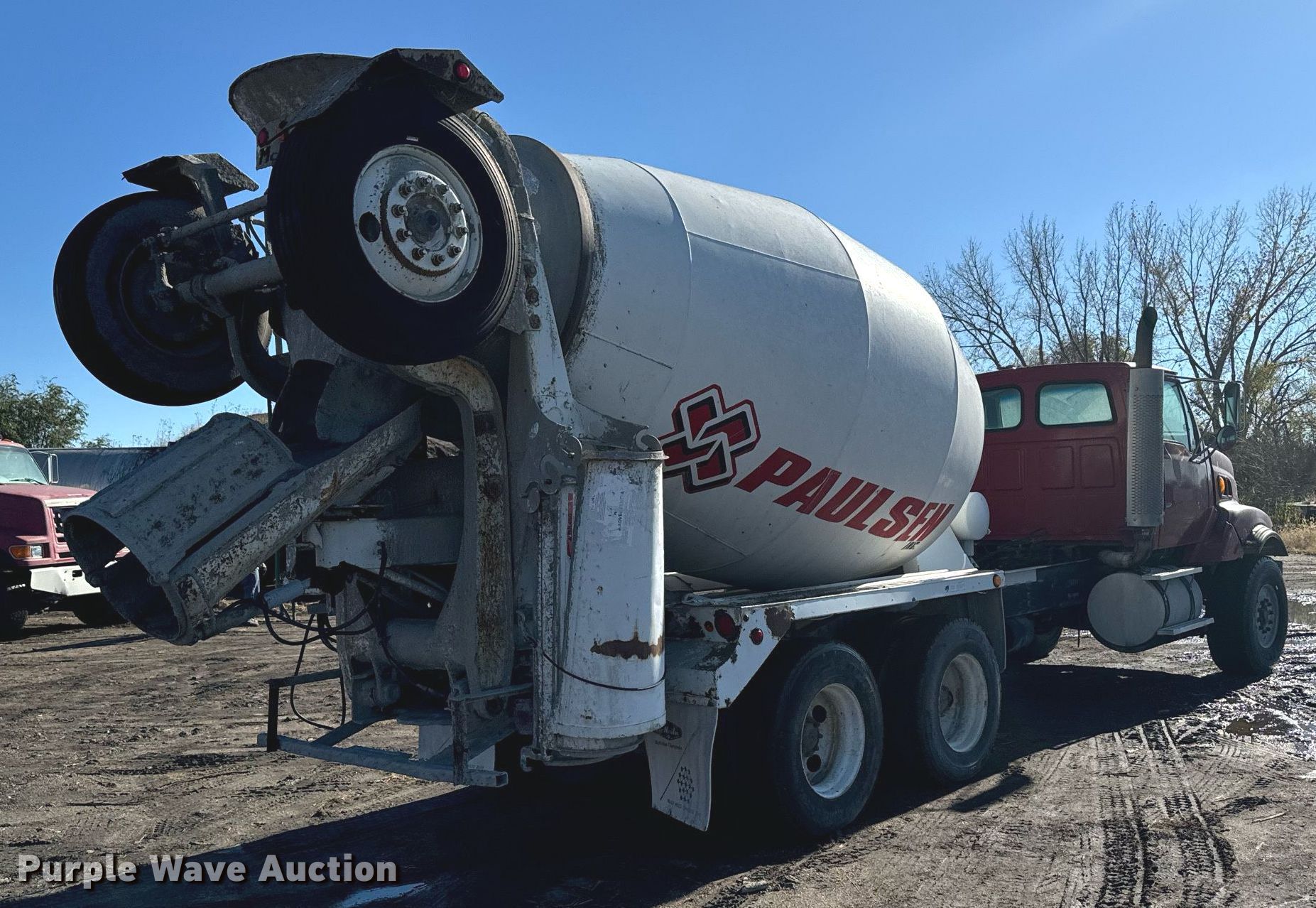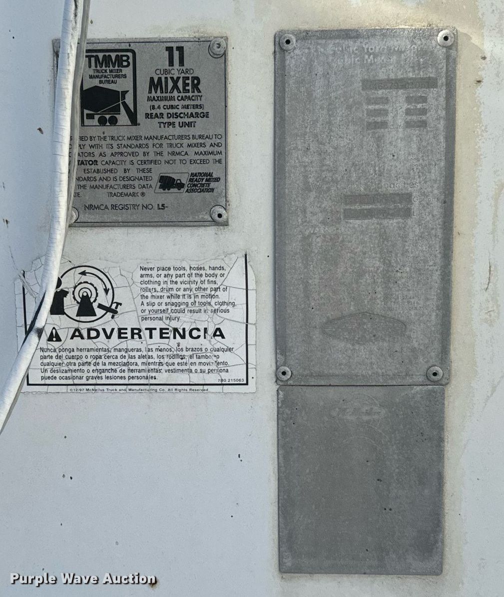 1998 Ford Z96 ready mix truck. Miles: 151,749 on odometer, Hours: 2,074 on meter, VIN: 1FDZZ96P4WVA28428, Unit #: 2676. Engine Cummins M11, Displacement: 10.8L, Cylinders: 6, Fuel type: Diesel. Transmission Manual, Speed: 8. Chassis Axles: Triple, Tag axle Steerable, Differential lock: Inter-axle, Suspension: Spring over walking beam, Brakes: Air, PTO, GVWR: 62,000 lbs. Interior AC, Heat. Features Mixer TMMB, Capacity: 11 cu.yd., Discharge: Rear, In-cab controls, Rear drum controls, Water tank capacity: 150 gallons, Chute Extensions: 3, Chute type: Steel.. Tires Front: 425/65R22.5, Rear: 11R22.5, Lift axle: 11R22.5. Nebraska title. Title distribution may be delayed up to 14 days from verification of funds. Paulsen Inc.. Cozad, NE 69130