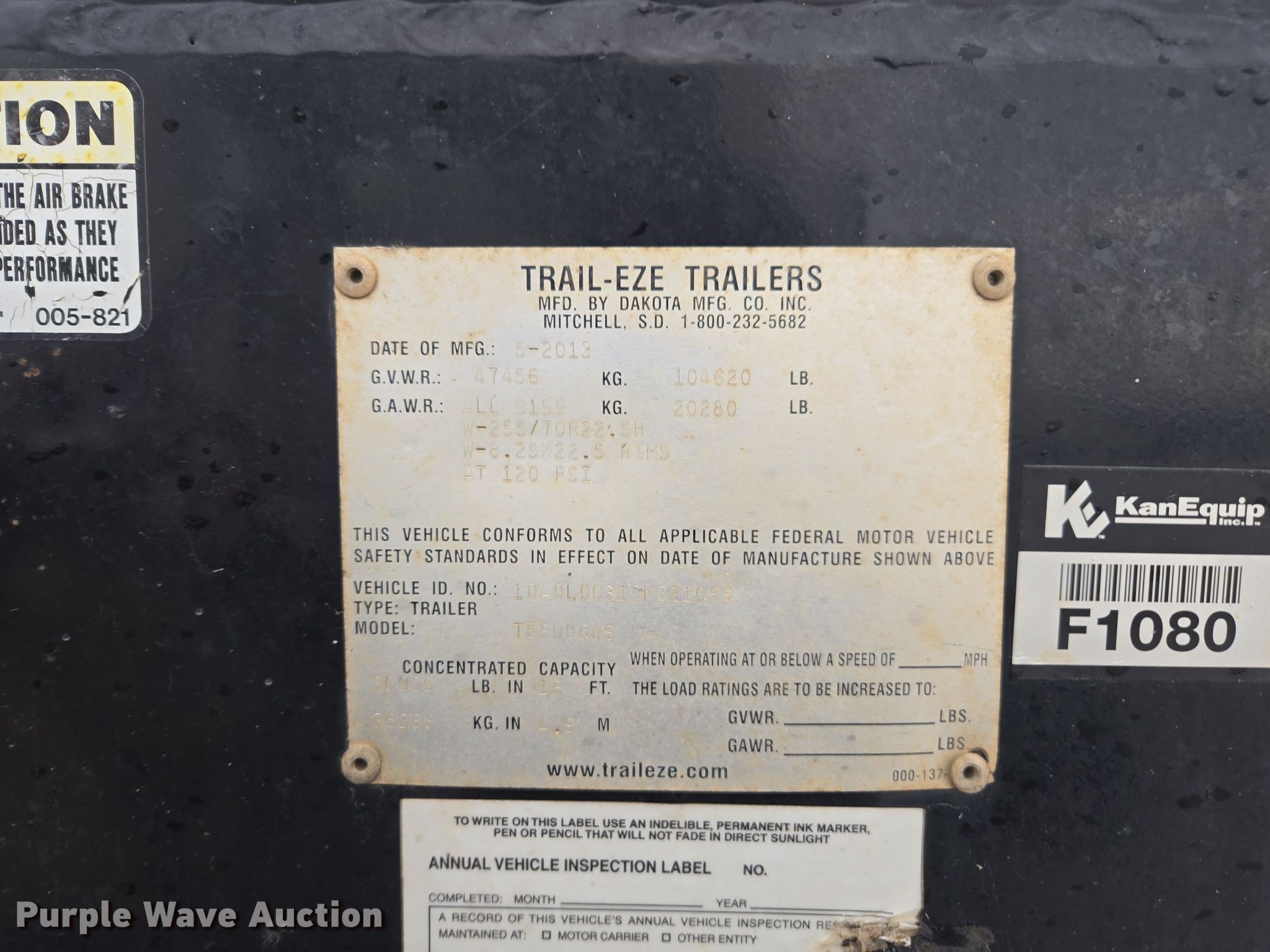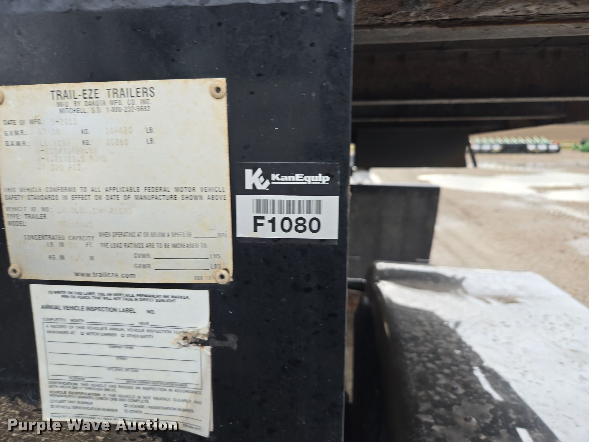 Purple Wave is selling a used Equip. Trailer in Kansas. This item is a 2013 Trail-Eze TE80DGWS lowboy equipment trailer with the following: VIN: 1DADLD031DM021089, Unit #: f1080