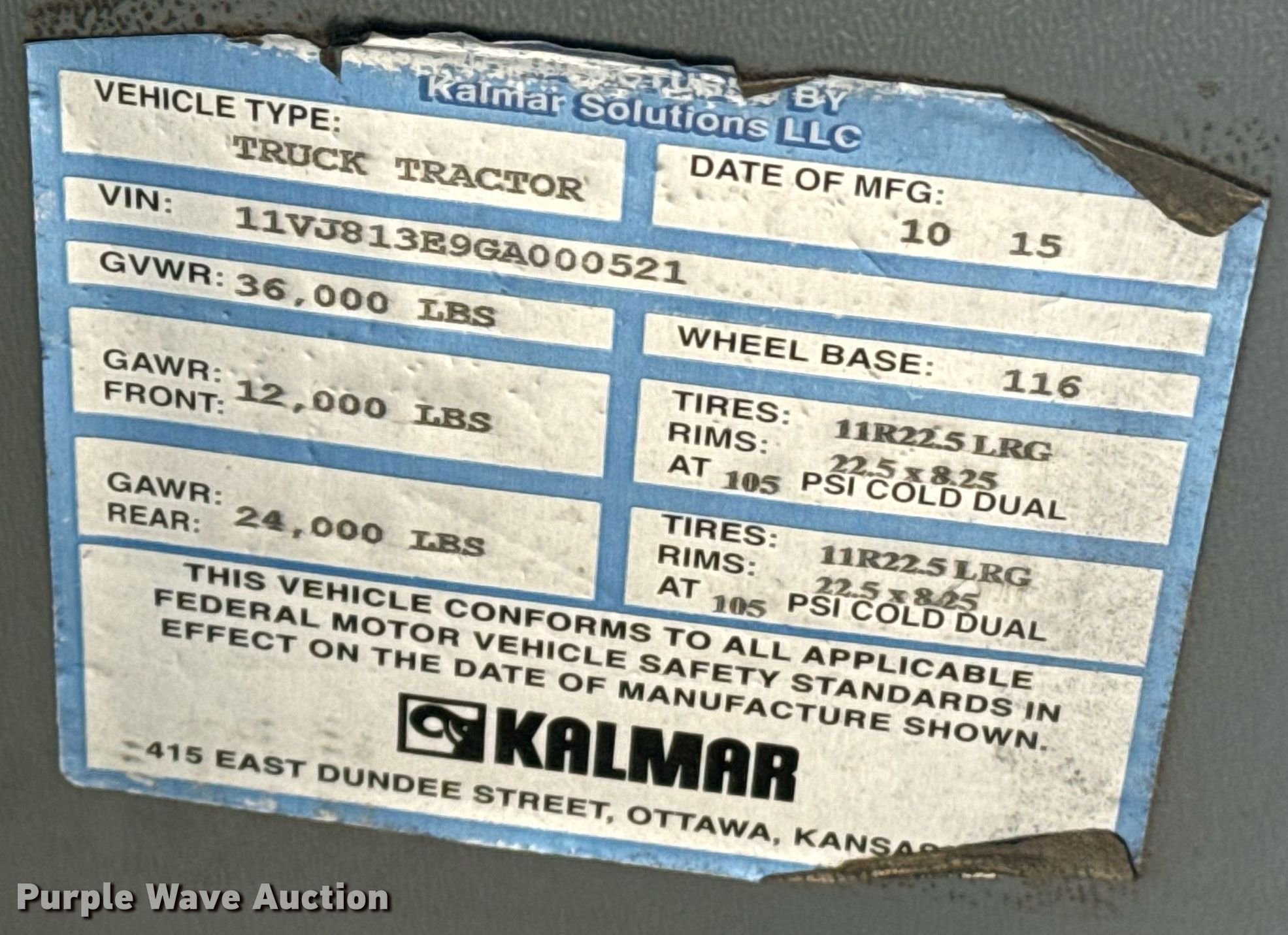 Purple Wave is selling a used Yard Truck in California. This item is a 2016 Kalmar Ottawa T2 yard truck with the following: Miles: 25,001 on odometer, Hours: 10,918 on meter, VIN: 11VJ813E9GA000521