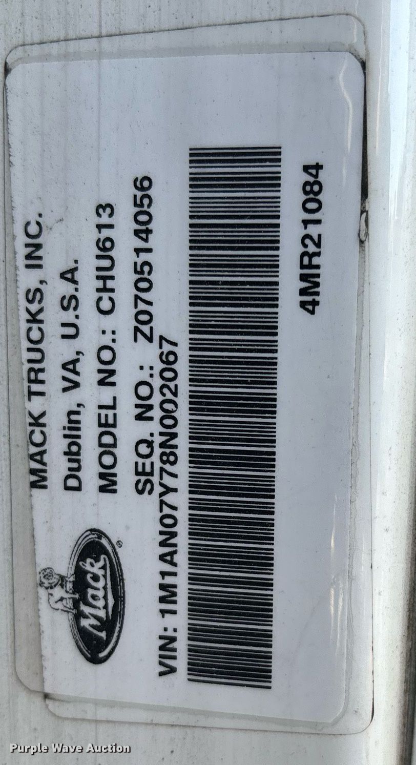 Purple Wave is selling a used Truck Tractor in North Carolina. This item is a 2008 Mack CHU613 semi truck with the following: Miles: 802,827 on odometer, VIN: 1M1AN07Y78N002067