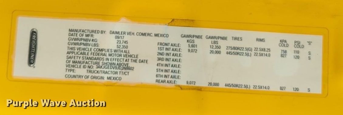 2018 Freightliner Cascadia 125 semi truck. Miles: 575,356 on odometer, VIN: 3AKJGEDV9JDJN8602, Unit #: 2440. Engine Detroit Diesel DD13, Displacement: 12.8L, Cylinders: 6, Fuel type: Diesel. Transmission Automated manual. Chassis Axles: Tandem, Differential lock: Inter-axle, Suspension: Air Dump valves, Brakes: Air, GVWR: 52,350 lbs FAWR: 12,350 lbs, IAWR: 20,000 lbs, RAWR: 20,000 lbs. Interior AC, Heat, Heated mirrors, Power windows, Power locks, Cruise control, Air ride cab. Features Deck plate: Aluminum, Fifth wheel type: Fixed, Fuel tank: Single. Tires Front: 295/75R22.5, Rear: 445/50R22.5. Notes Dash warning indicator: Check engine. Oklahoma title. Title distribution may be delayed up to 30 days from verification of funds. Gemini Motor Transport. Oklahoma City, OK 73127