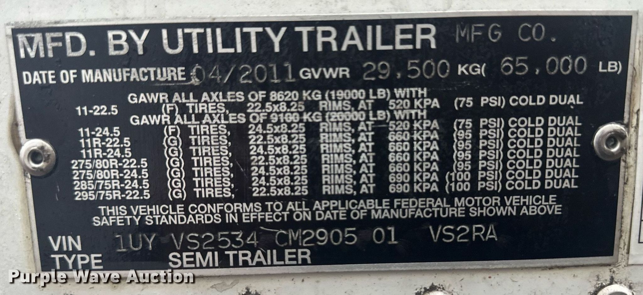 2012 Utility refrigerated van trailer. VIN: 1UYVS2534CM290501. Dimensions Overall: 53' L x 105" W. Features Deck type: Aluminum, Refrigeration unit Carrie. Chassis Landing gear: Dual, Suspension: Air, Brakes: Air, Axles: Tandem Sliding, GVWR: 29,500 lbs. Tires Steel wheels, Size: 295/75R22.5. Kansas electronic title. Title has a lien that will be released following the close of the auction. A paper title will be printed once the lien is released. Title distribution may be delayed up to 30 days from verification of funds. Liberal, KS 67901