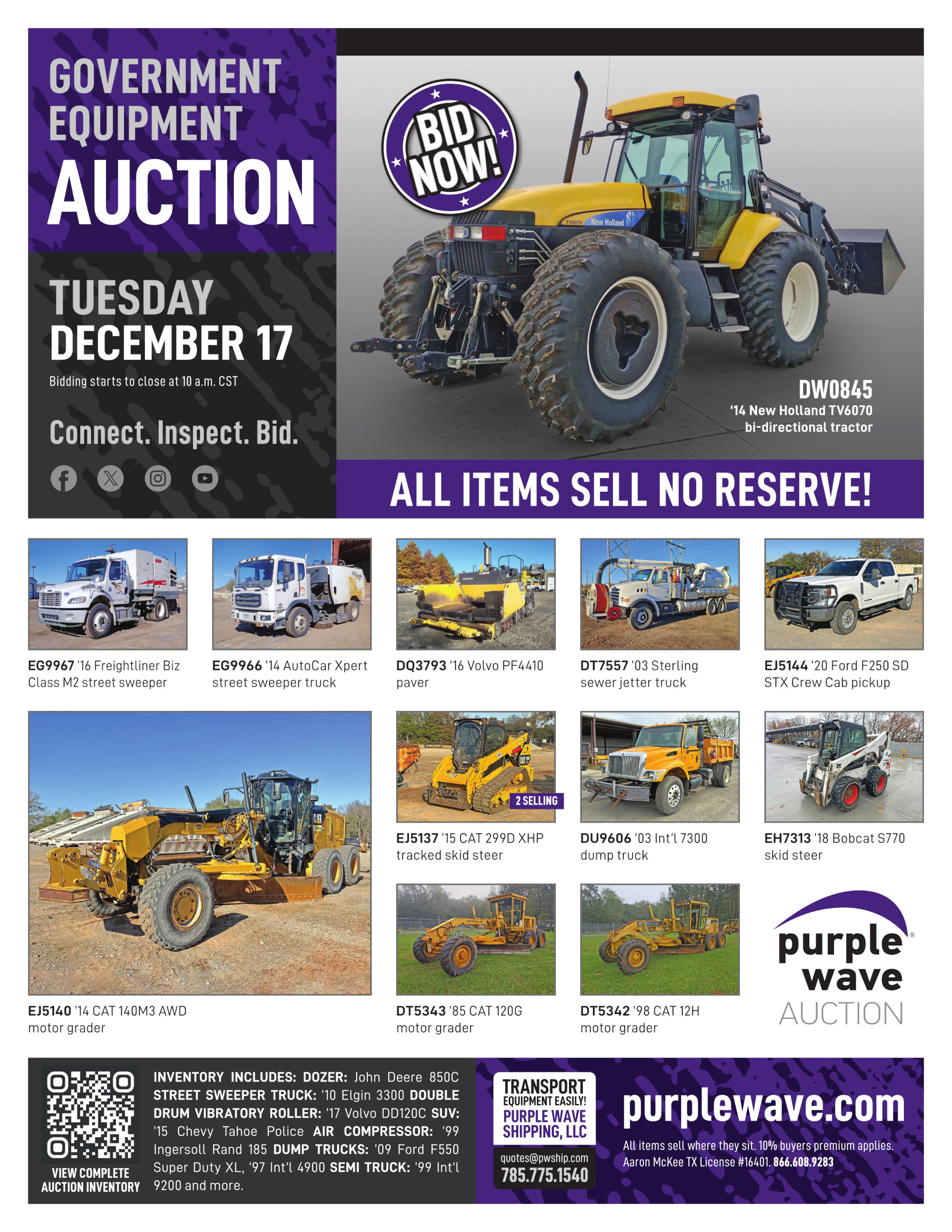 This auction is conducted by Purple Wave, Inc., whose home office is 825 Levee Drive, Manhattan, Kansas. Aaron McKee, Texas auctioneer license # 16401, operates Purple Wave, Inc. Complaints against us may be directed to the Texas Department of Licensing and Regulation, P.O. Box 12157, Austin, Texas 78711, (512) 463-6599. For additional required information, see the attached document.