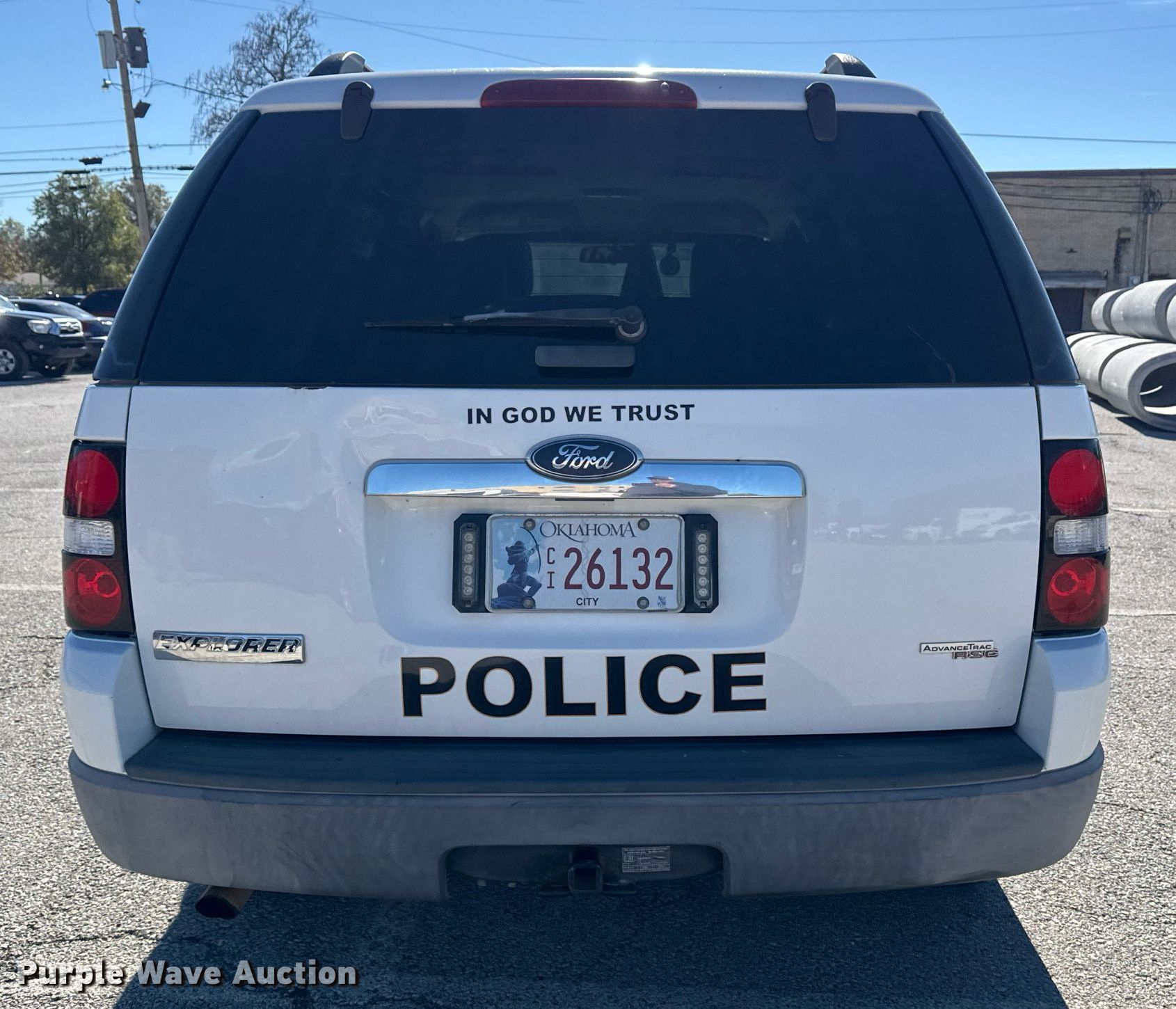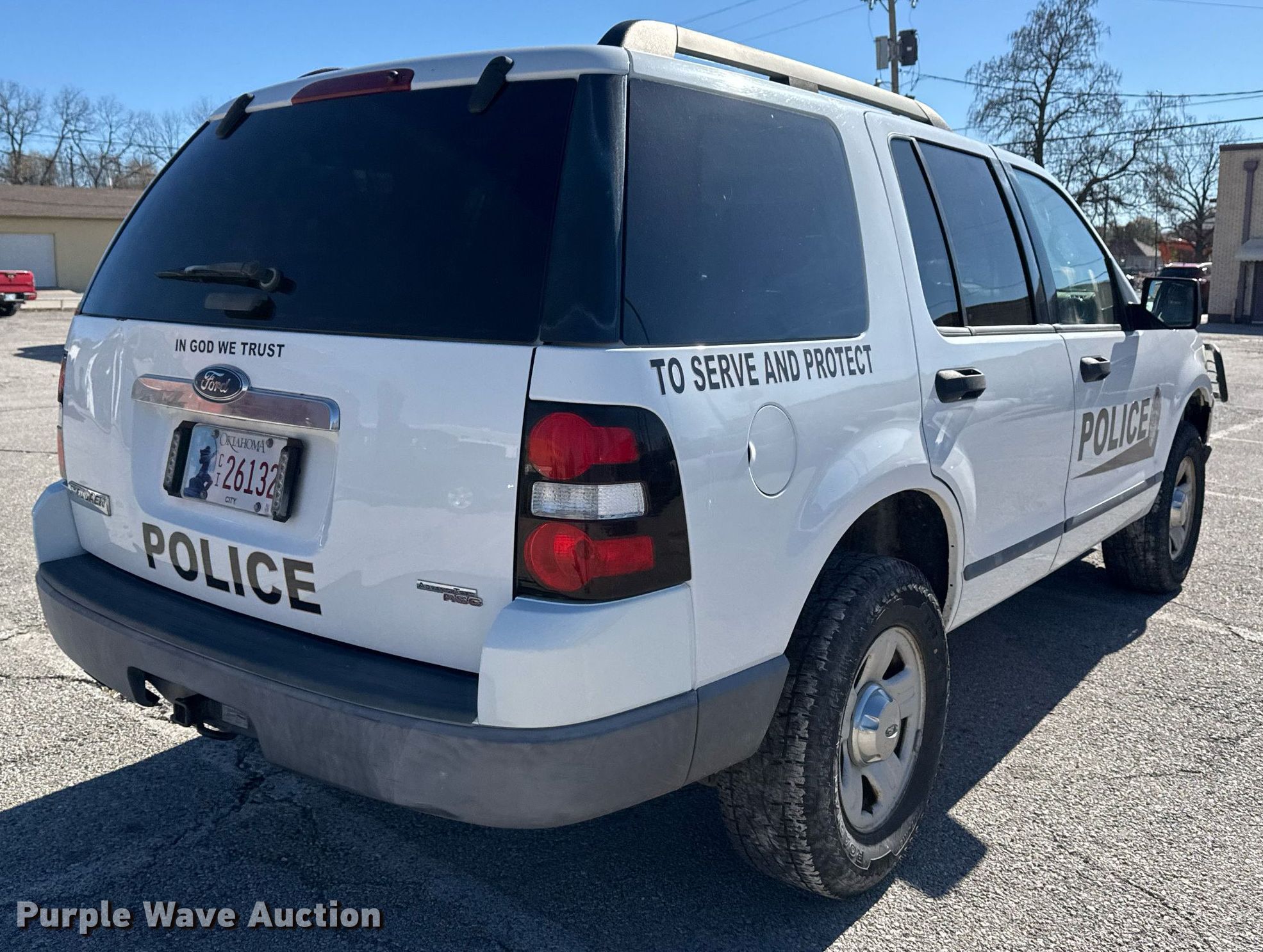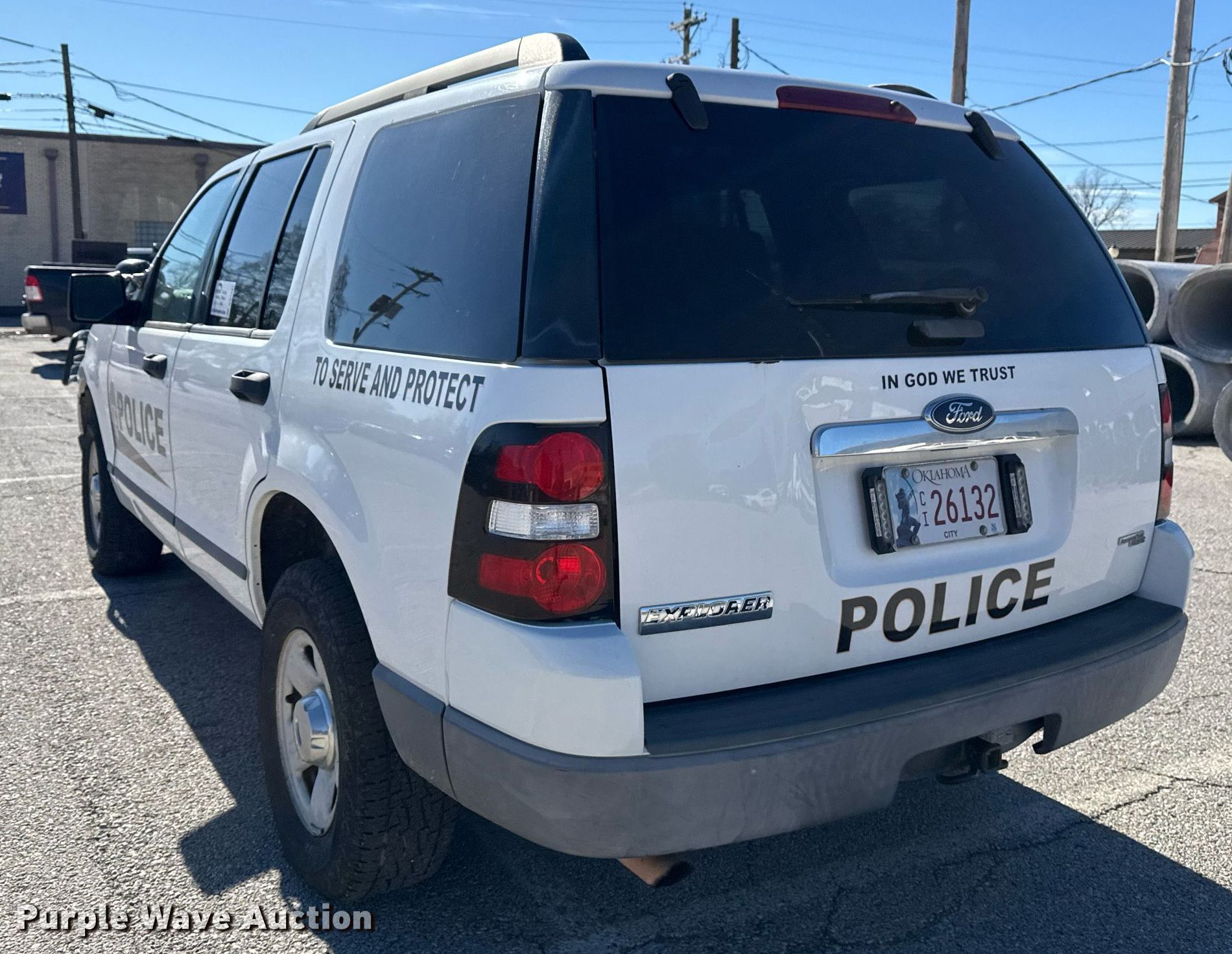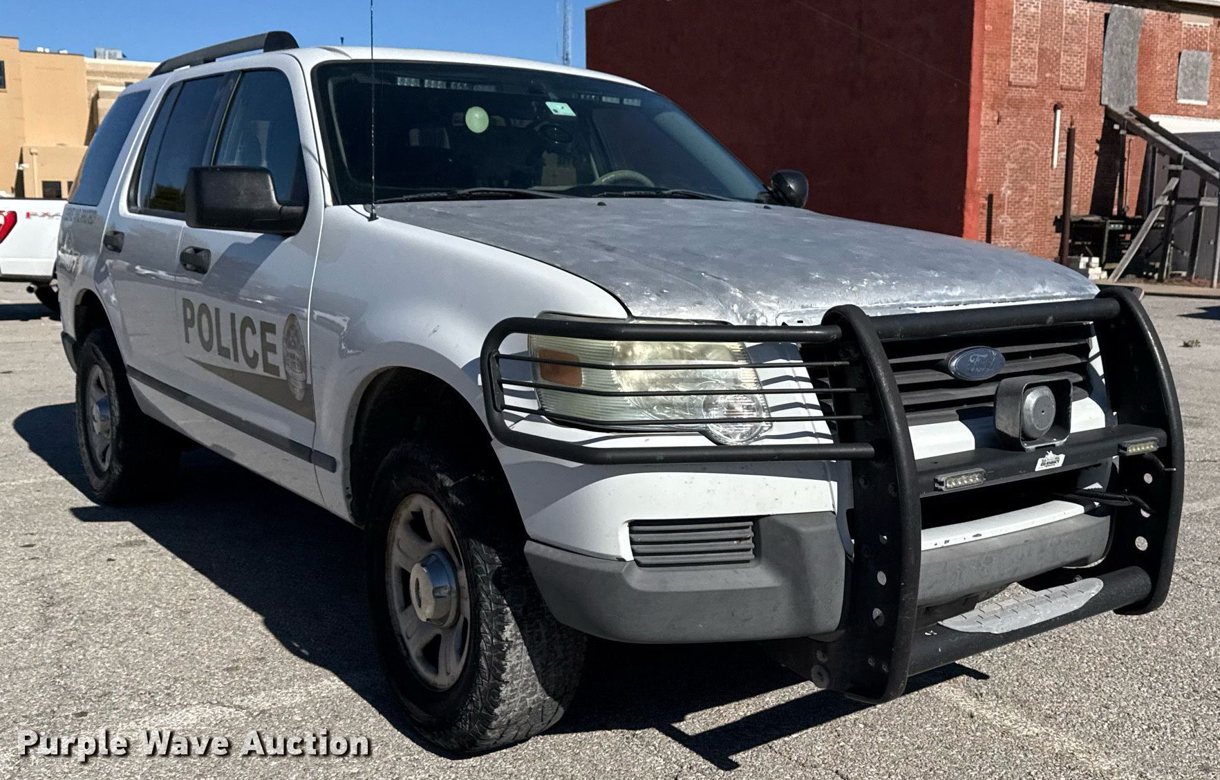 2006 Ford Explorer SUV. Miles: 165,373 on odometer, VIN: 1FMEU72EX6UB27993. Engine Displacement: 4.0L V6 SOHC, Cylinders: 6, Fuel type: Gas. Transmission Automatic, Four wheel drive. Interior AC, Heat, Power windows, Power locks, Cruise control. Tires Size: 245/70R16. Notes Dash warning indicator: TPMS, Paint has been removed from hood, Contents not included. Law enforcement and emergency equipment will be removed prior to auction. Includes but not limited to decals, two-way radio, spotlight, emergency lights and siren, firearm rack, and camera.. Oklahoma title. Title distribution may be delayed up to 14 days from verification of funds. City of Wagoner. 105 South Casaver Avenue. Wagoner, OK 74467