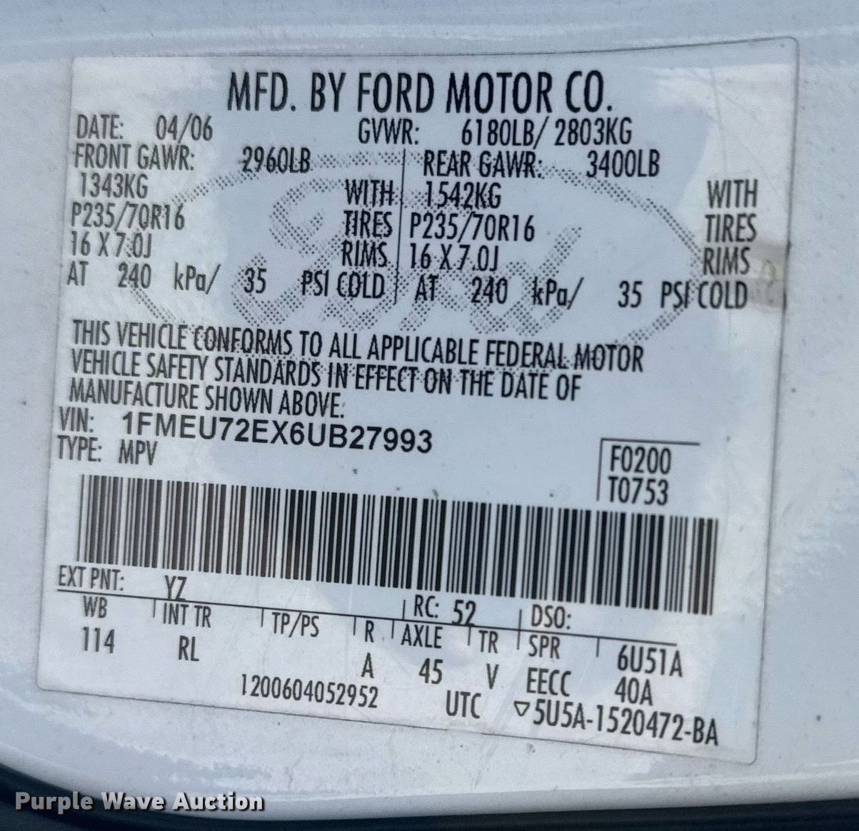 - VIN: 1FMEU72EX6UB27993