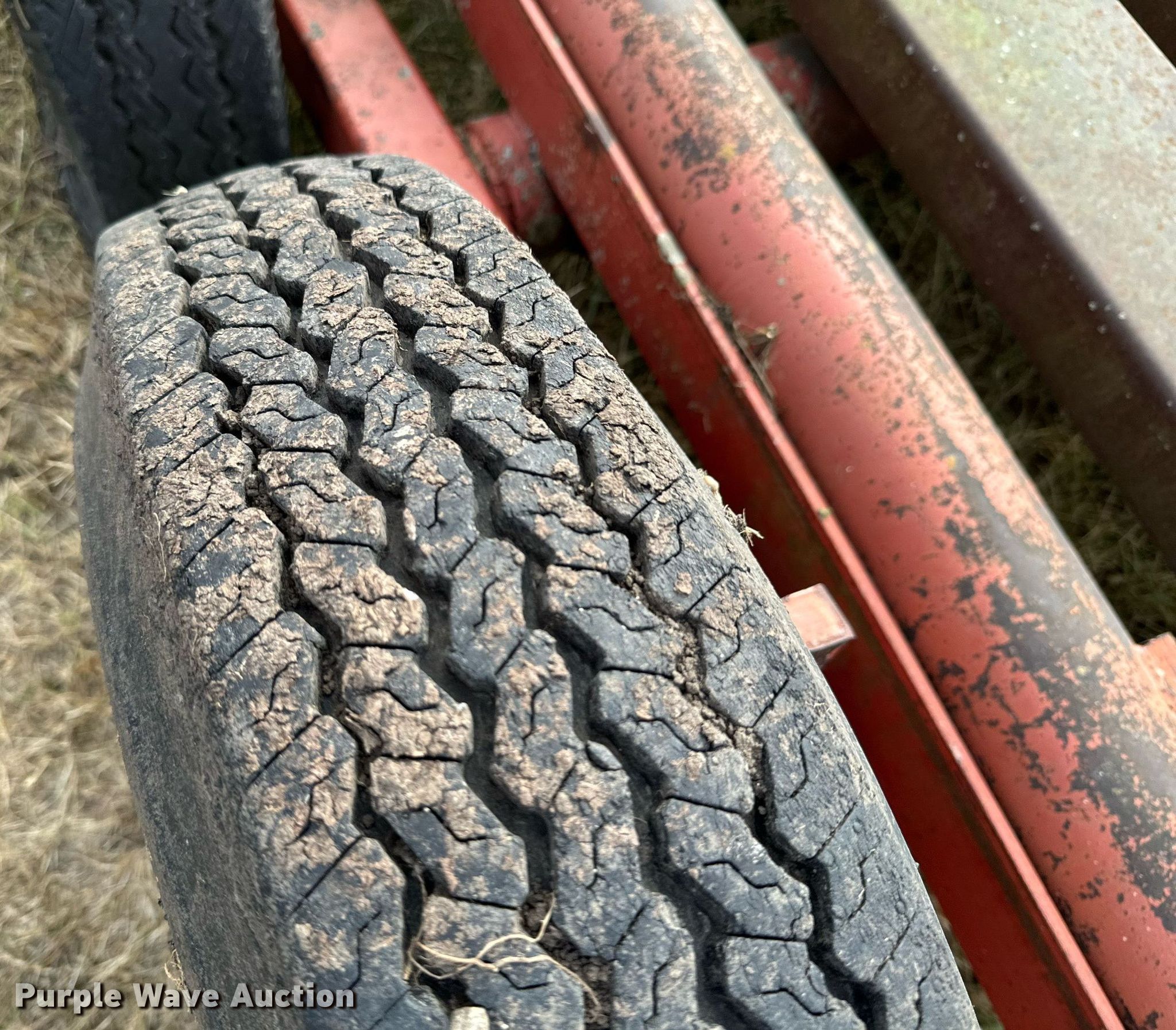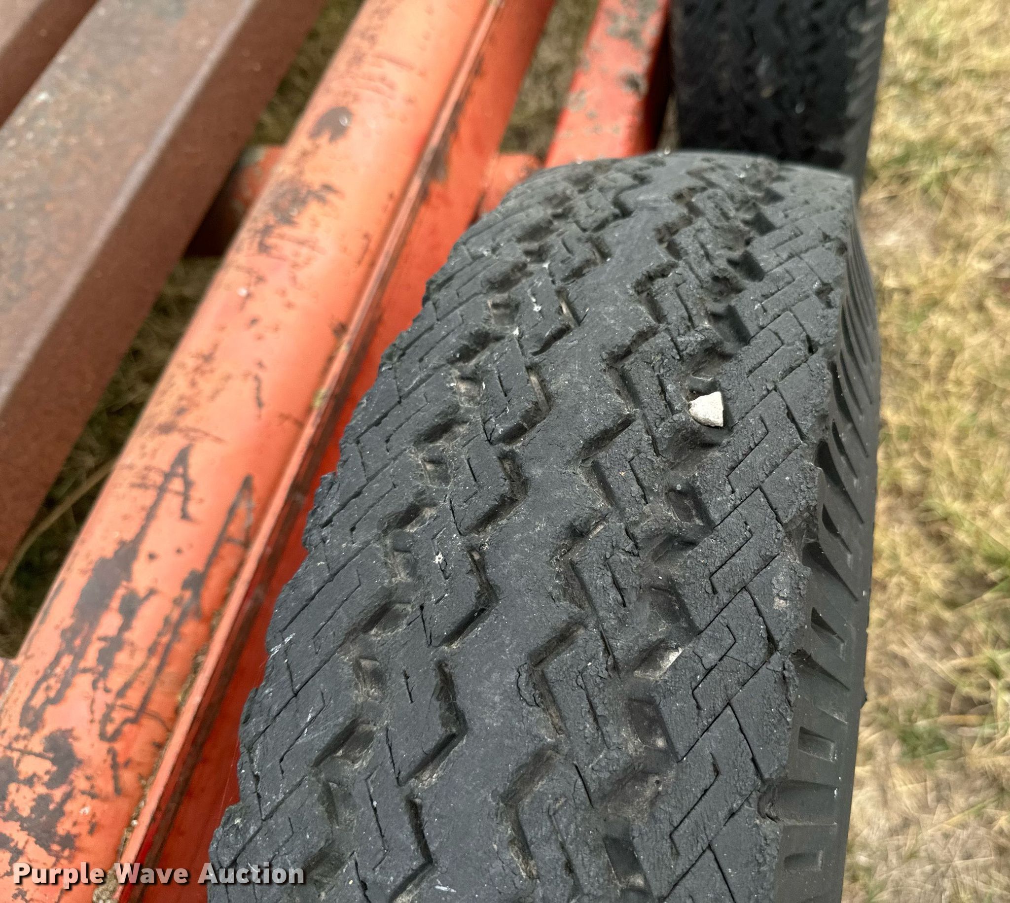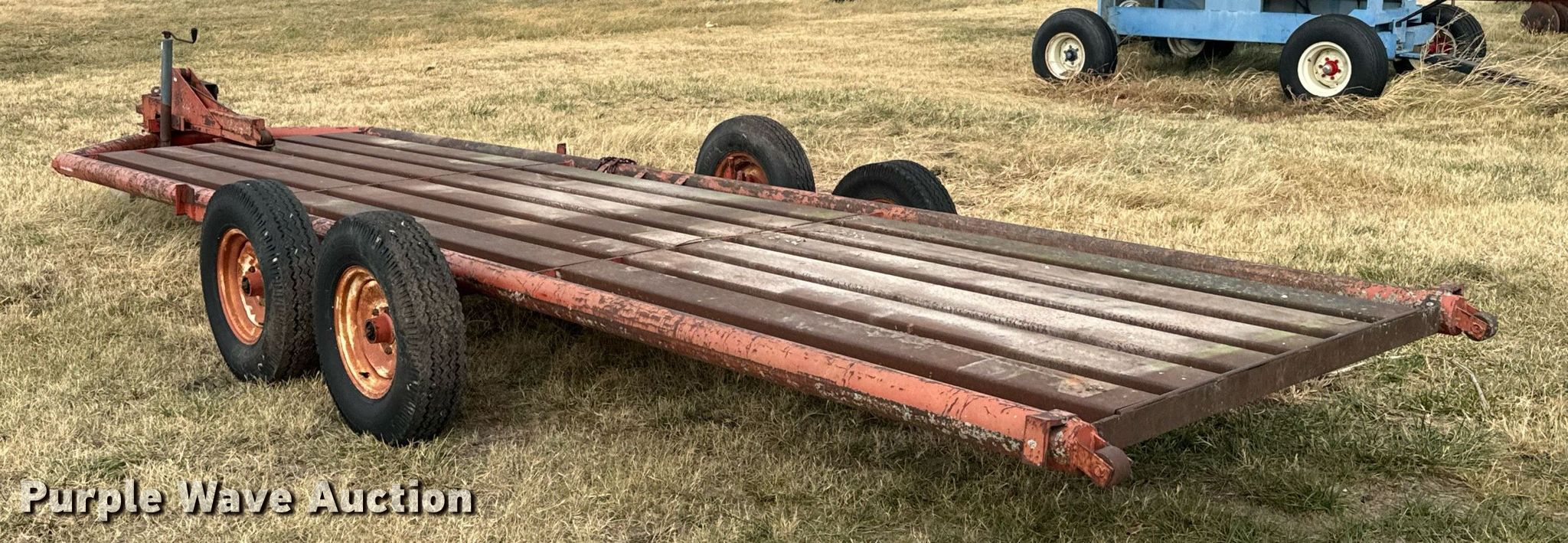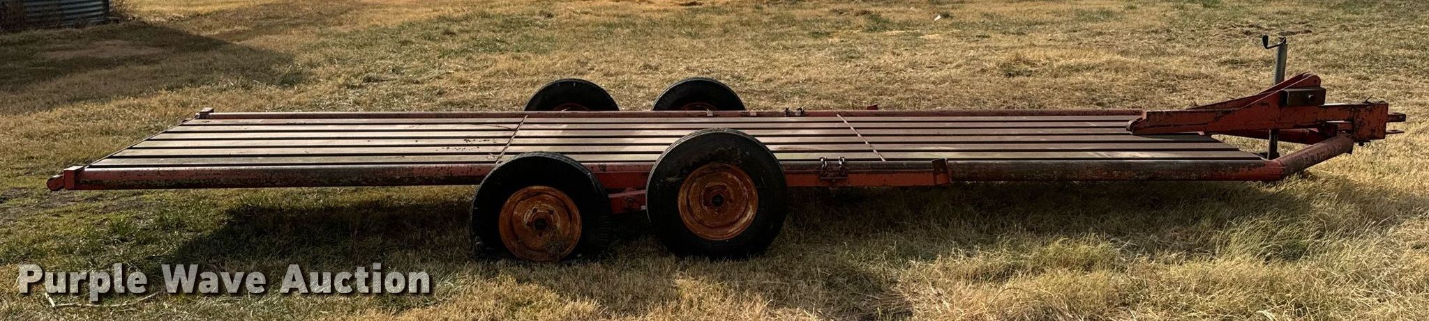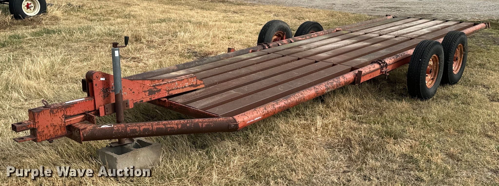 Donahue implement carrier. Serial: 055405. Dimensions Overall: 25' 6" L x 96" W, Deck: 21' 2" L x 72" W. Features Deck type: Steel. Chassis Landing gear: Single, Axles: Tandem. Tires Steel wheels, Size: 7.00-15LT. Notes Flat tire. Transfer of ownership documentation will be a bill of sale. K-State Southeast Research and Extension Center. Mound Valley, KS 67354