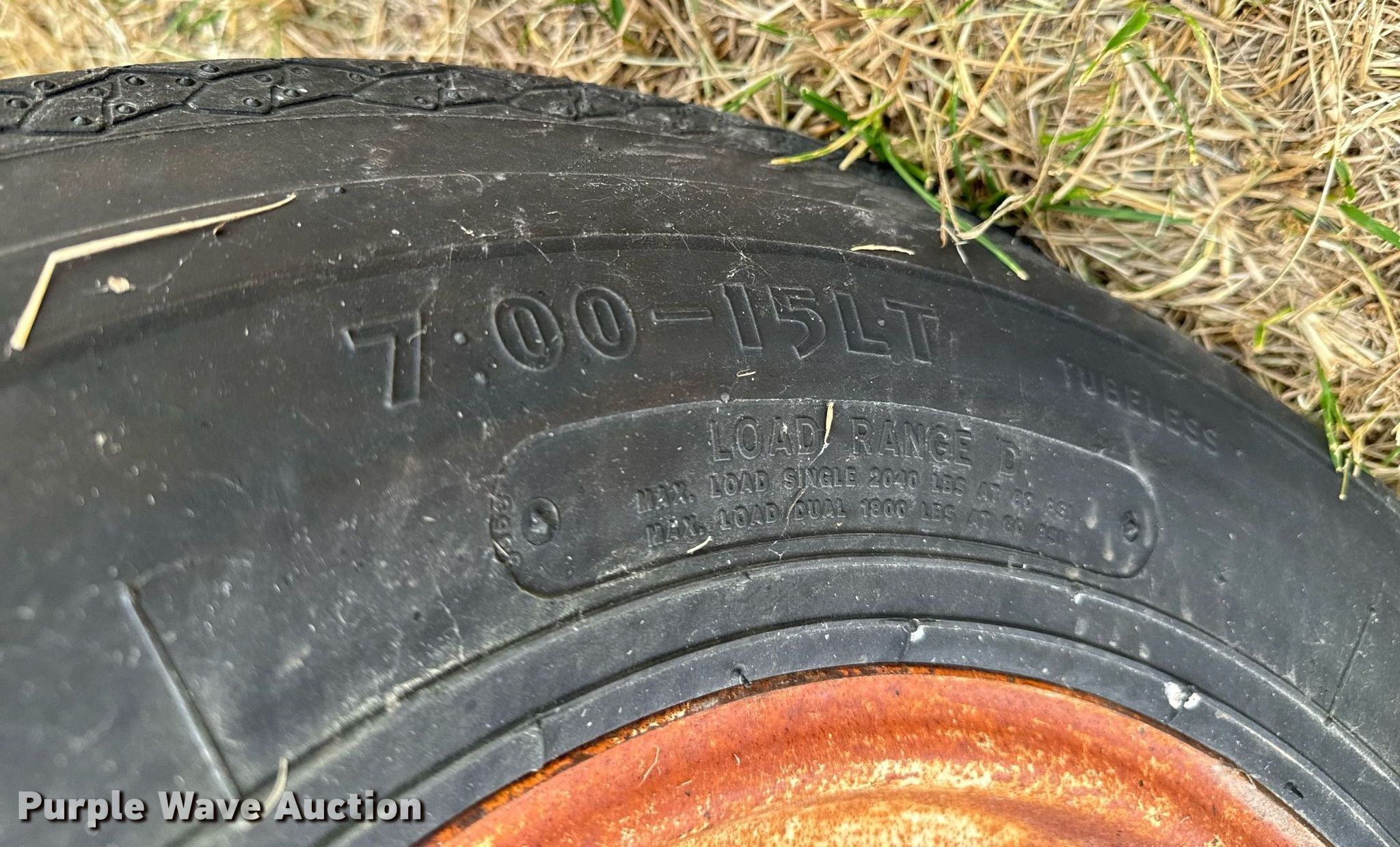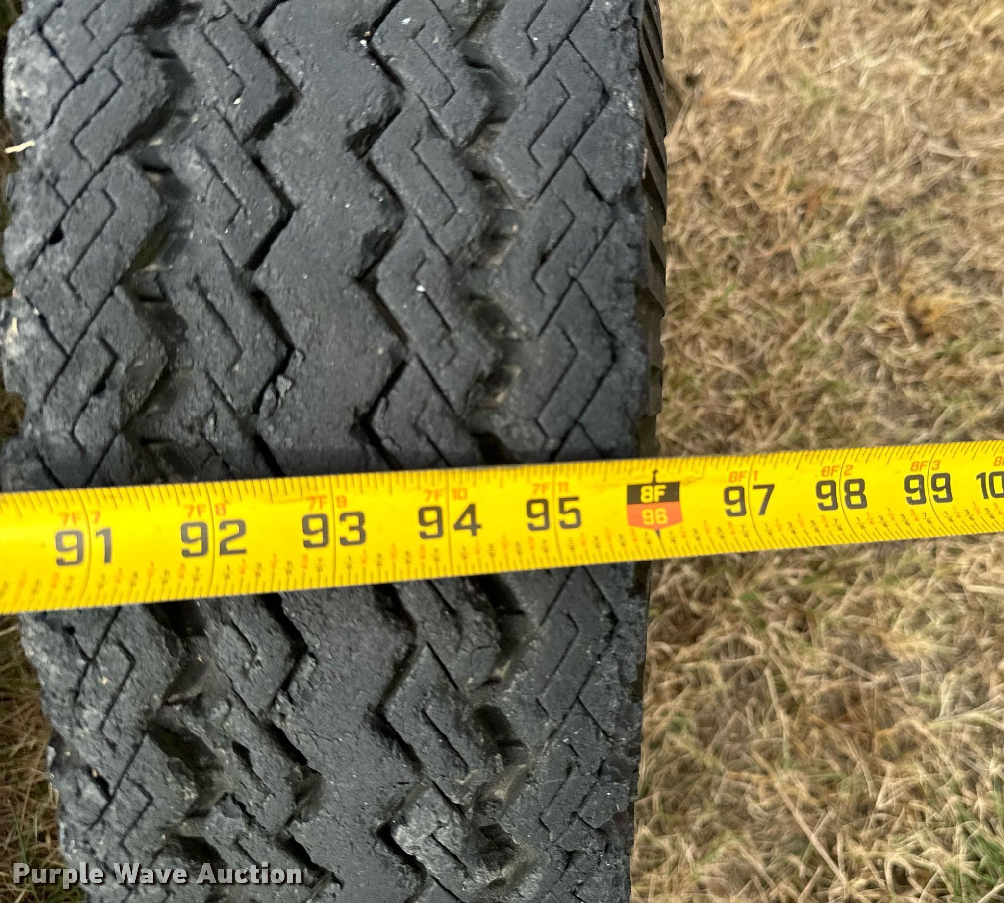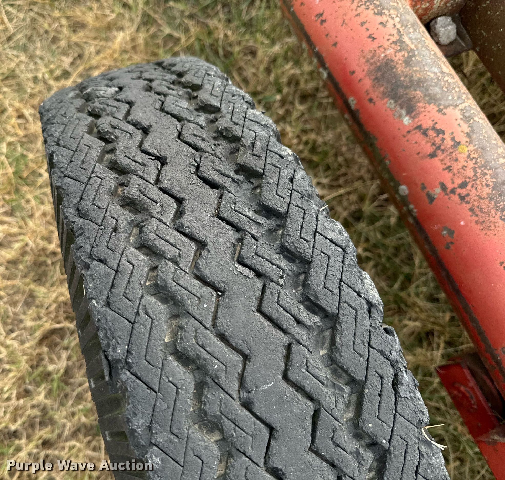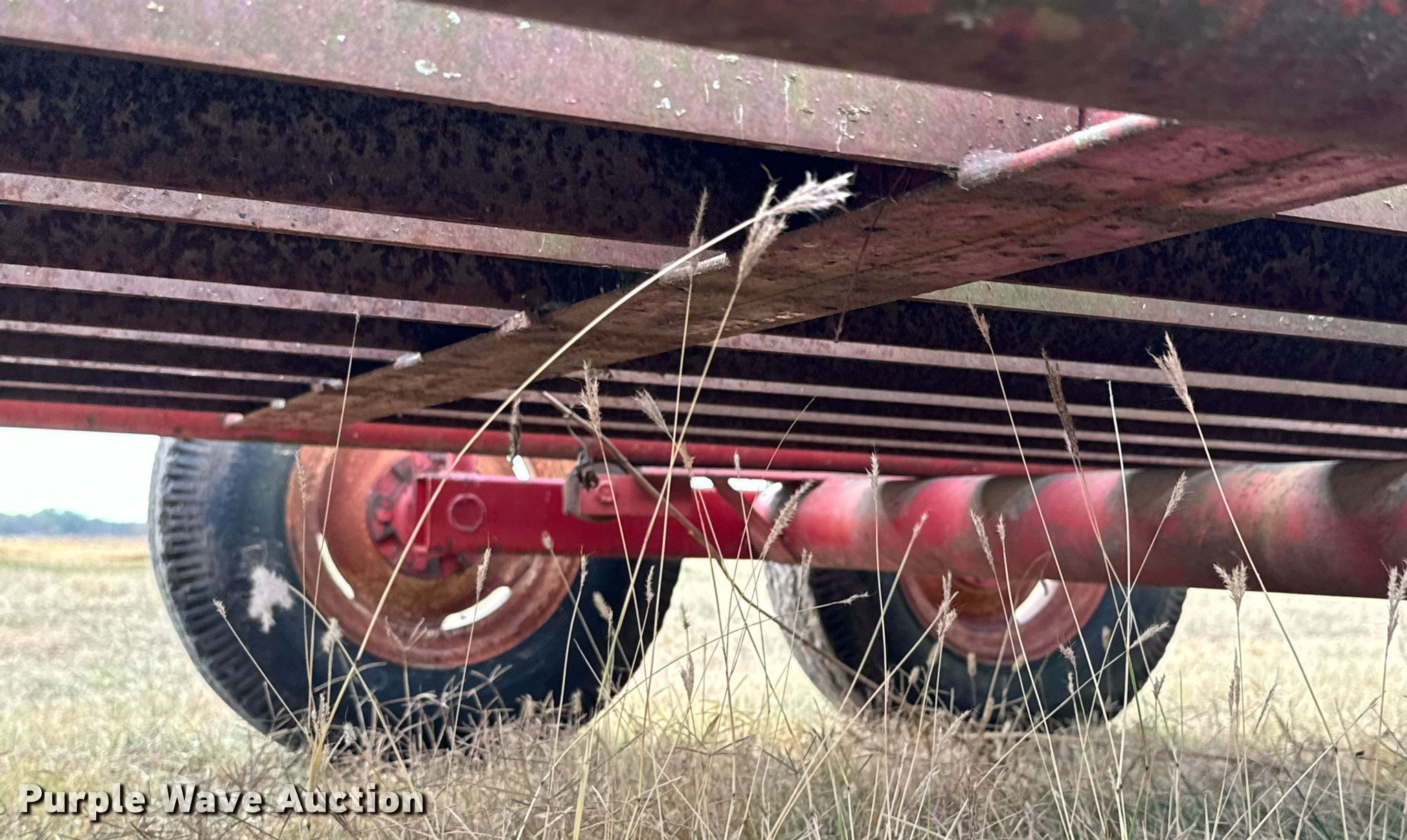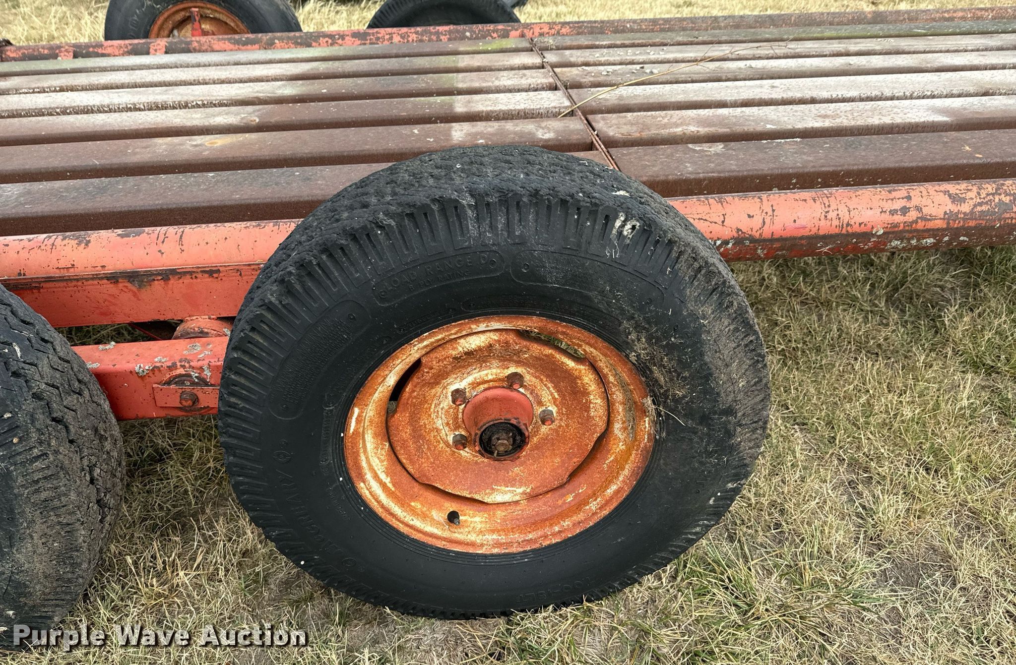 Donahue implement carrier. Serial: 055405. Dimensions Overall: 25' 6" L x 96" W, Deck: 21' 2" L x 72" W. Features Deck type: Steel. Chassis Landing gear: Single, Axles: Tandem. Tires Steel wheels, Size: 7.00-15LT. Notes Flat tire. Transfer of ownership documentation will be a bill of sale. K-State Southeast Research and Extension Center. Mound Valley, KS 67354