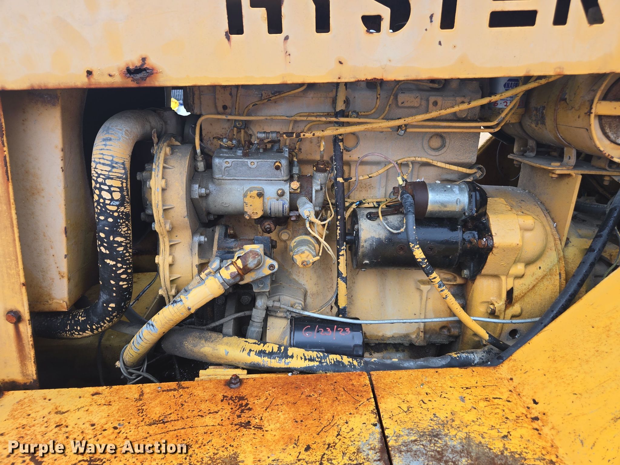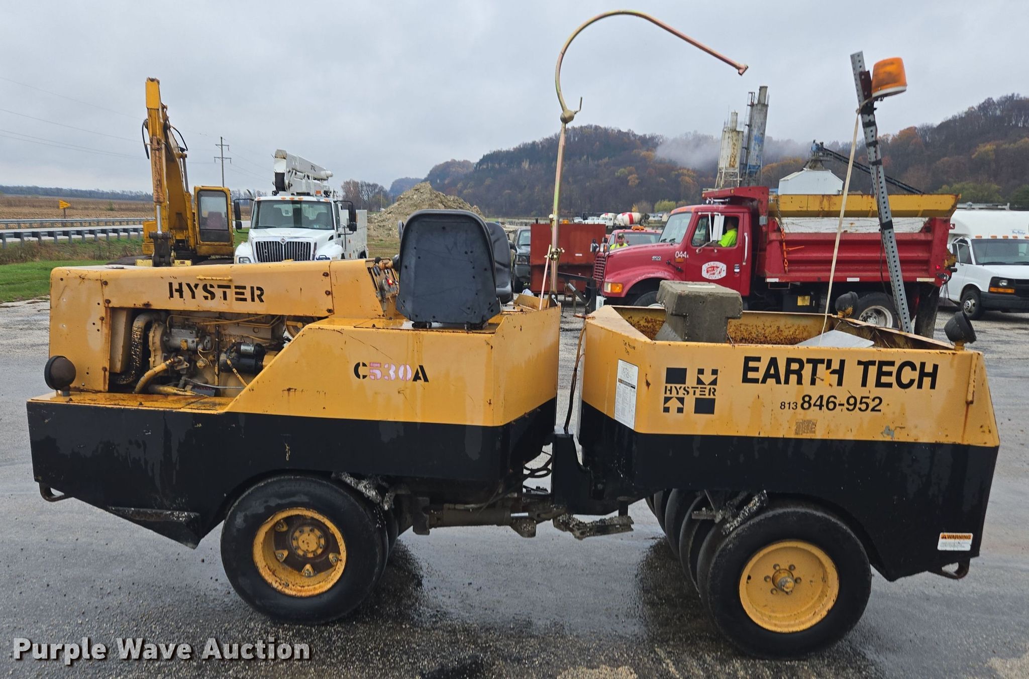 Hyster C530A pneumatic roller. Hours: Unknown. Engine Perkins, Cylinders: 4, Fuel type: Diesel. Transmission Hydrostatic. Features Drum scrapers: Front, Rear. Tires Size: 7.50-15, Quantity: 9. Calhoun County IL Highway Dept. Hardin Precinct, IL 62047