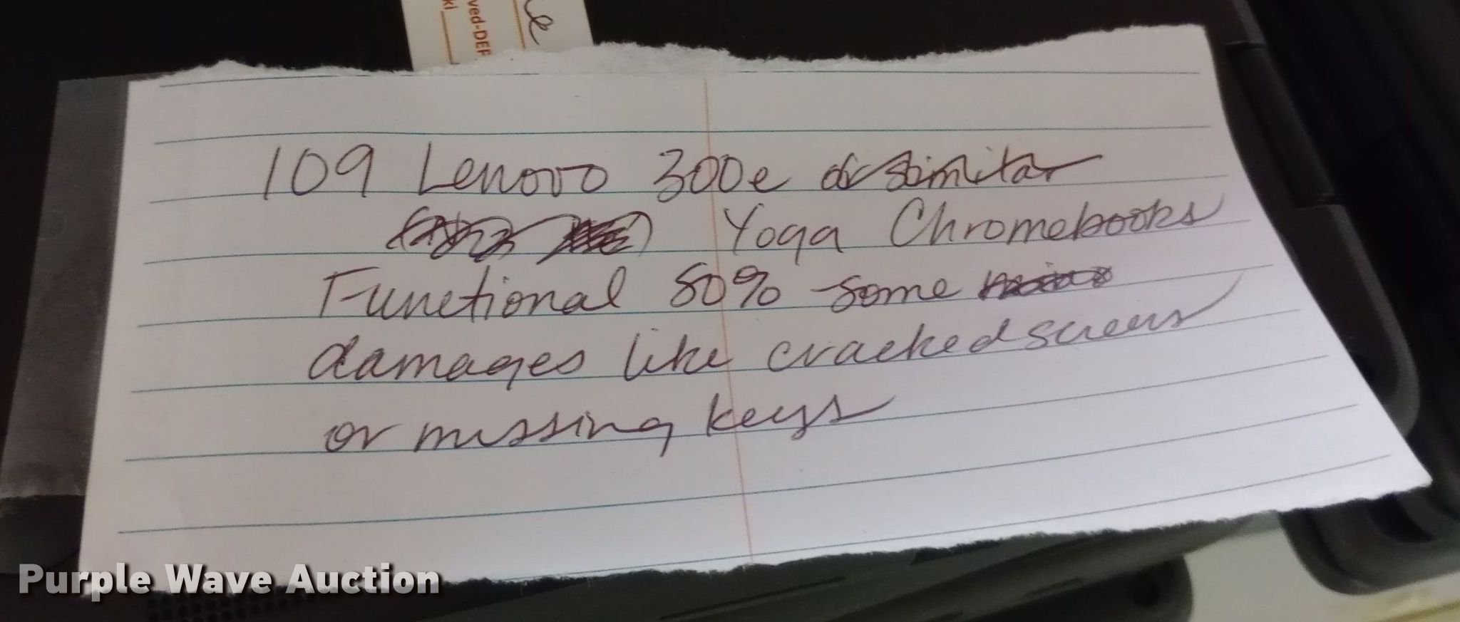 Purple Wave is selling a used Computers in Kansas. This item is a Approximately 109 Lenovo 300e Chromebooks with the following: Approximately 109 Lenovo 300e Chromebooks. Purple Wave reserves the right to obtain additional buyer information prior to item removal.. USD 470 Technology Department. Arkansas City, KS 67005