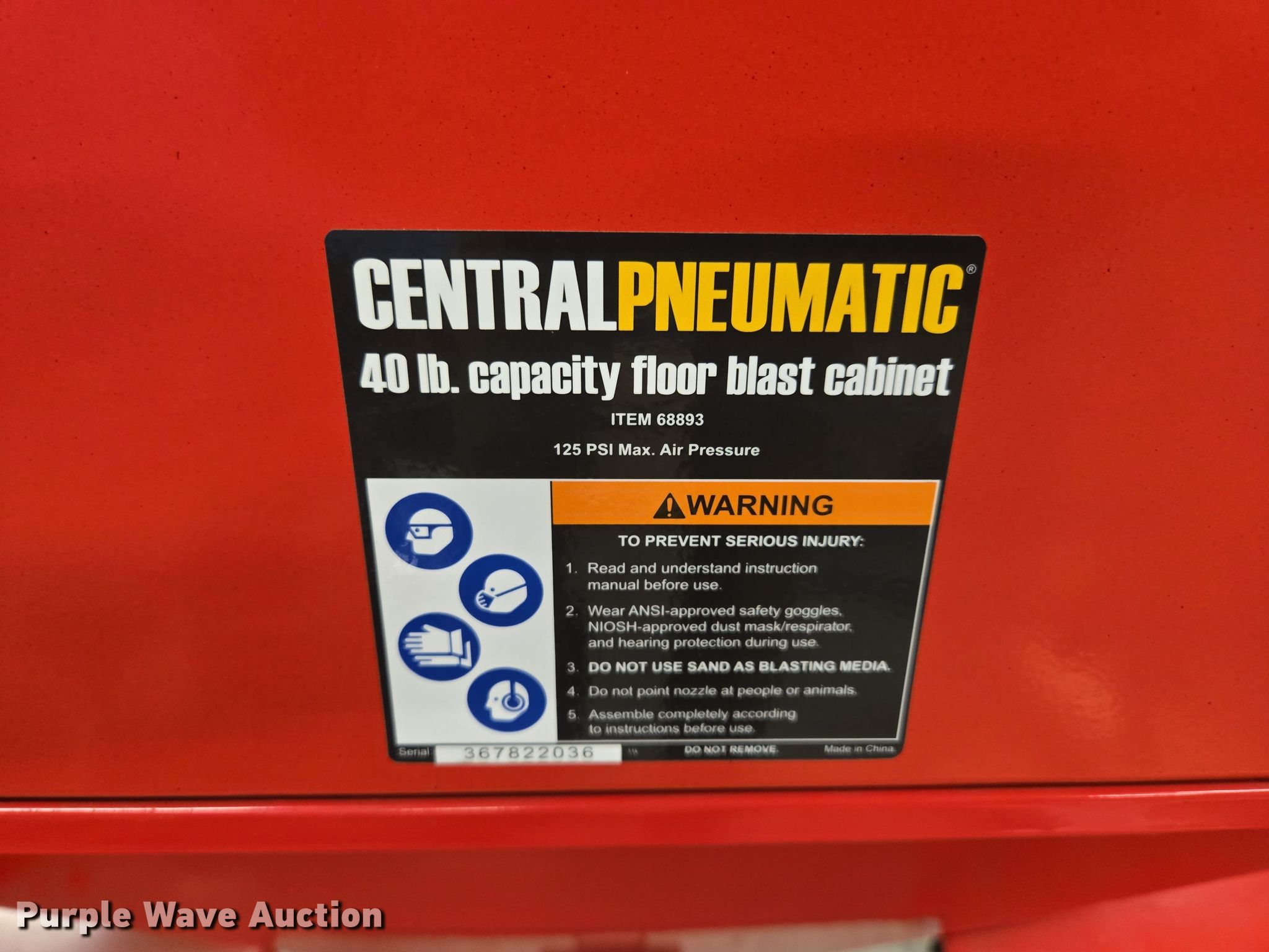 Purple Wave is selling a used Machine Shop Tools and Equip. in Missouri. This item is a Central Pneumatic sand blaster with the following: Capacity: 40 lbs