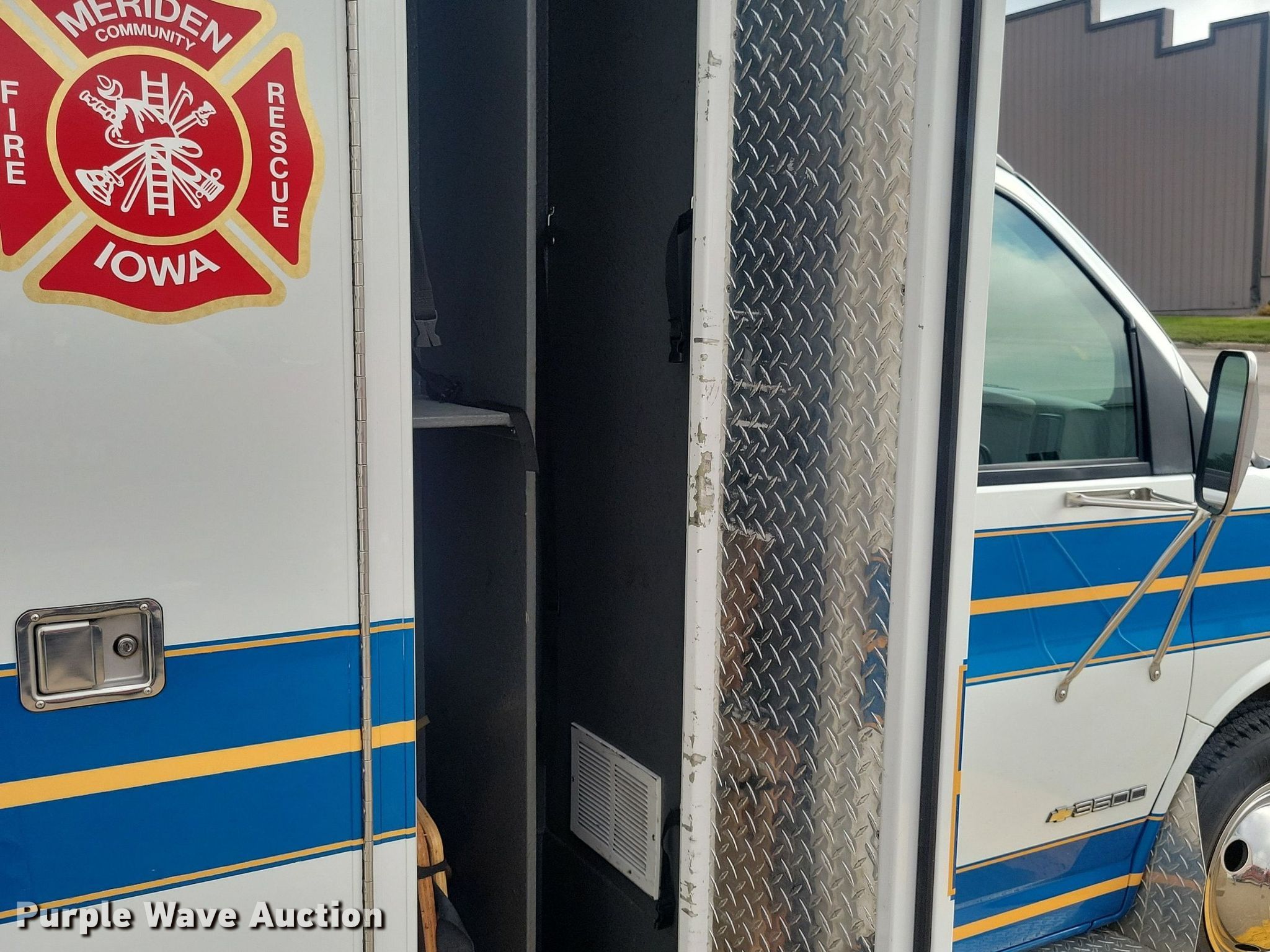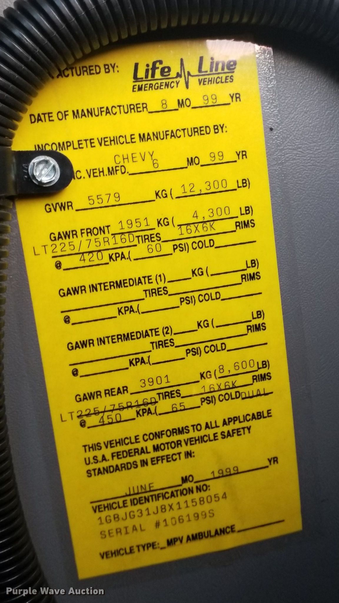 1999 Chevrolet Express 3500 ambulance. Miles: 33,964 on odometer, VIN: 1GBJG31J8X1158054. Engine Displacement: 7.4L V8 OHV, Cylinders: 8, Fuel type: Gas. Transmission Automatic. Chassis Axles: Single, Suspension: Spring, Brakes: Hydraulic, GVWR: 12,300 lbs. Interior AC, Heat, Cruise control, Auxiliary controls. Features Ambulance body Life Line, PA/ siren controls, Oxygen hookups. Tires Size: LT225/75R16. Notes Contents included, Siren controls removed. Iowa title. Seller is a government entity who will be assigning and distributing the title. Please contact the seller for distribution questions. Marcus Fire & Rescue. Marcus, IA 51035