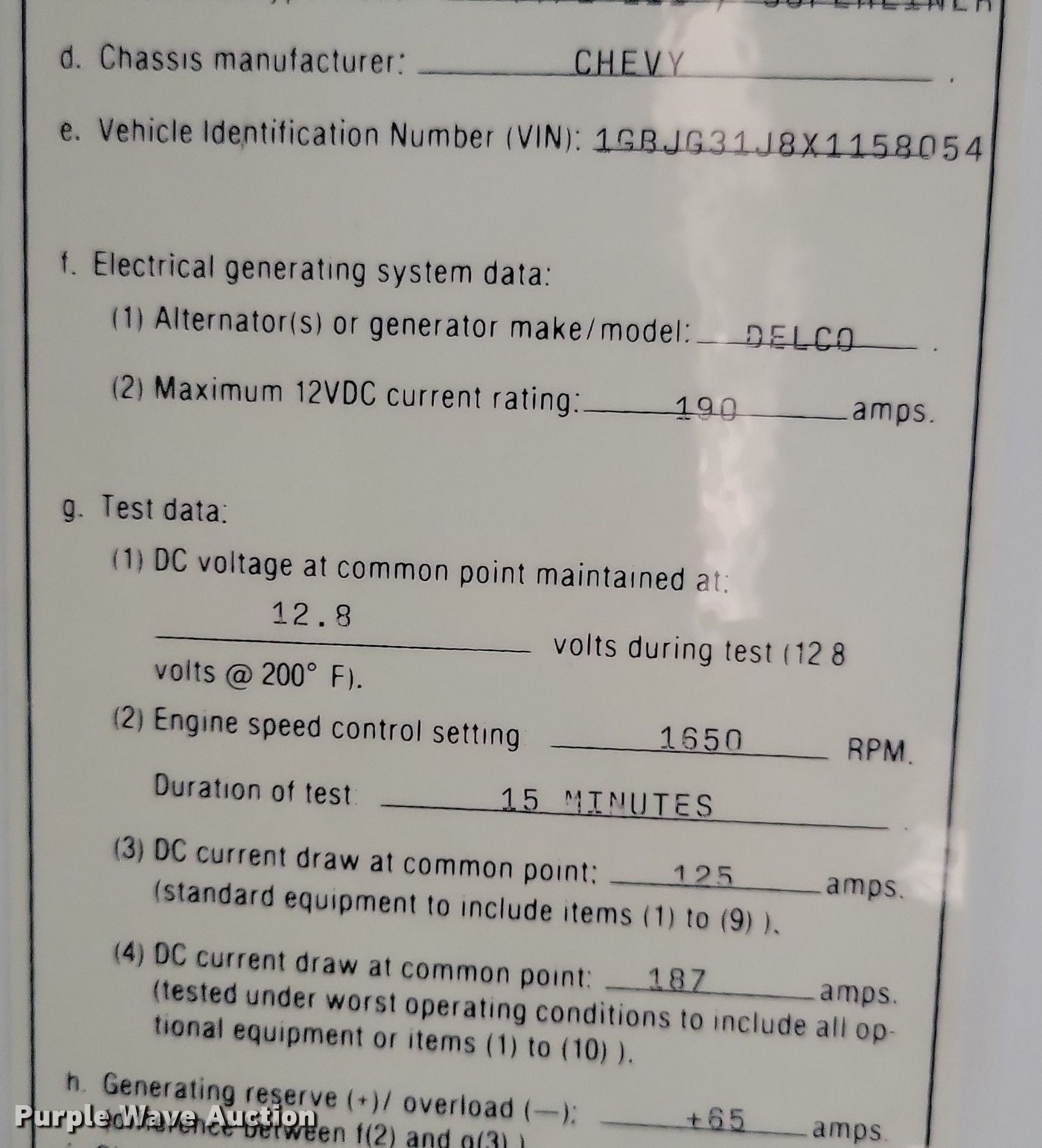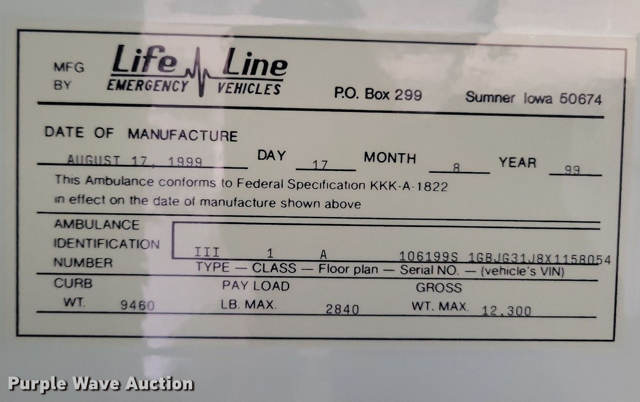 Purple Wave is selling a used Fire Truck or Emergency Vehicle in Iowa. This item is a 1999 Chevrolet Express 3500 ambulance with the following: Miles: 33,964 on odometer, VIN: 1GBJG31J8X1158054