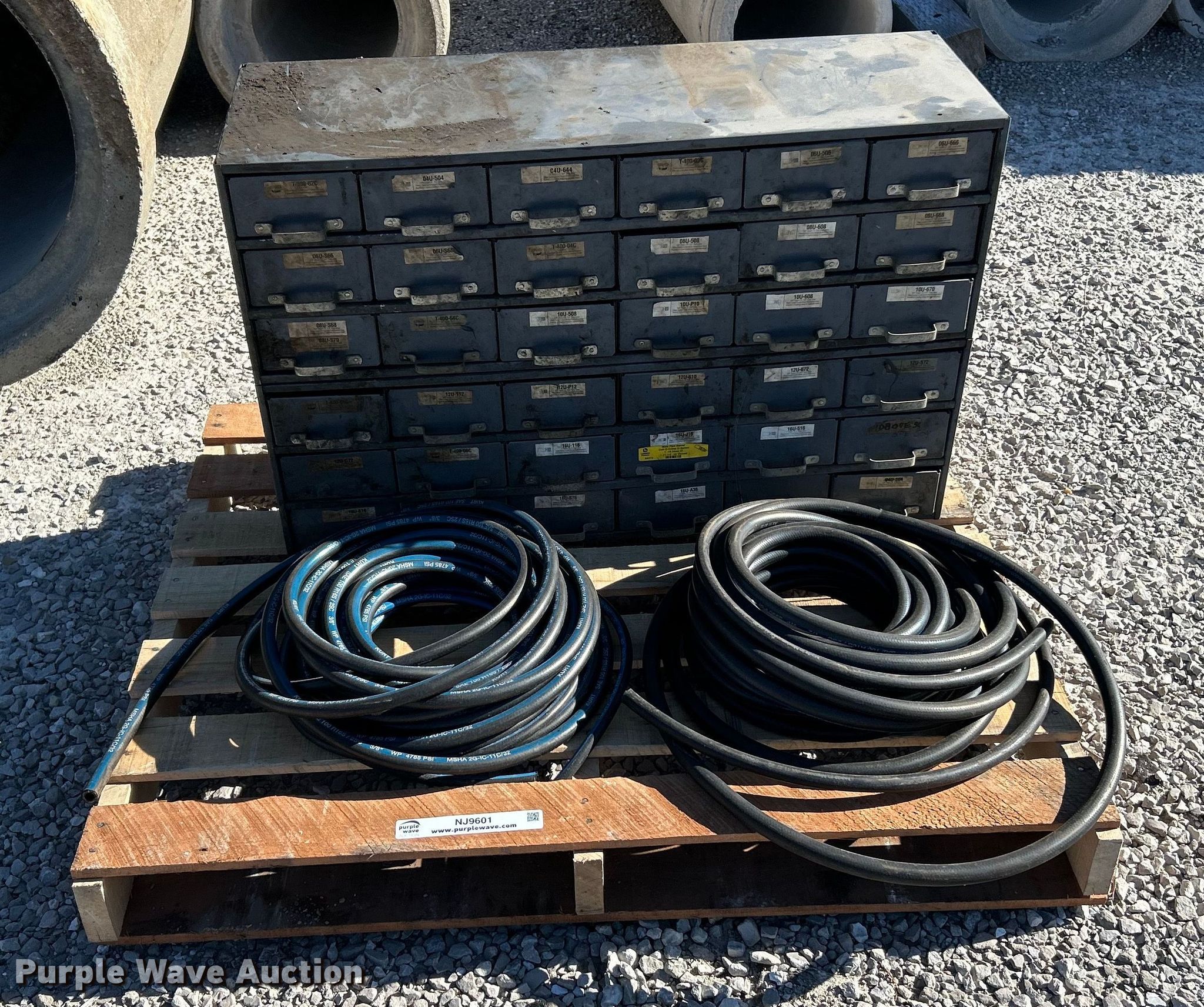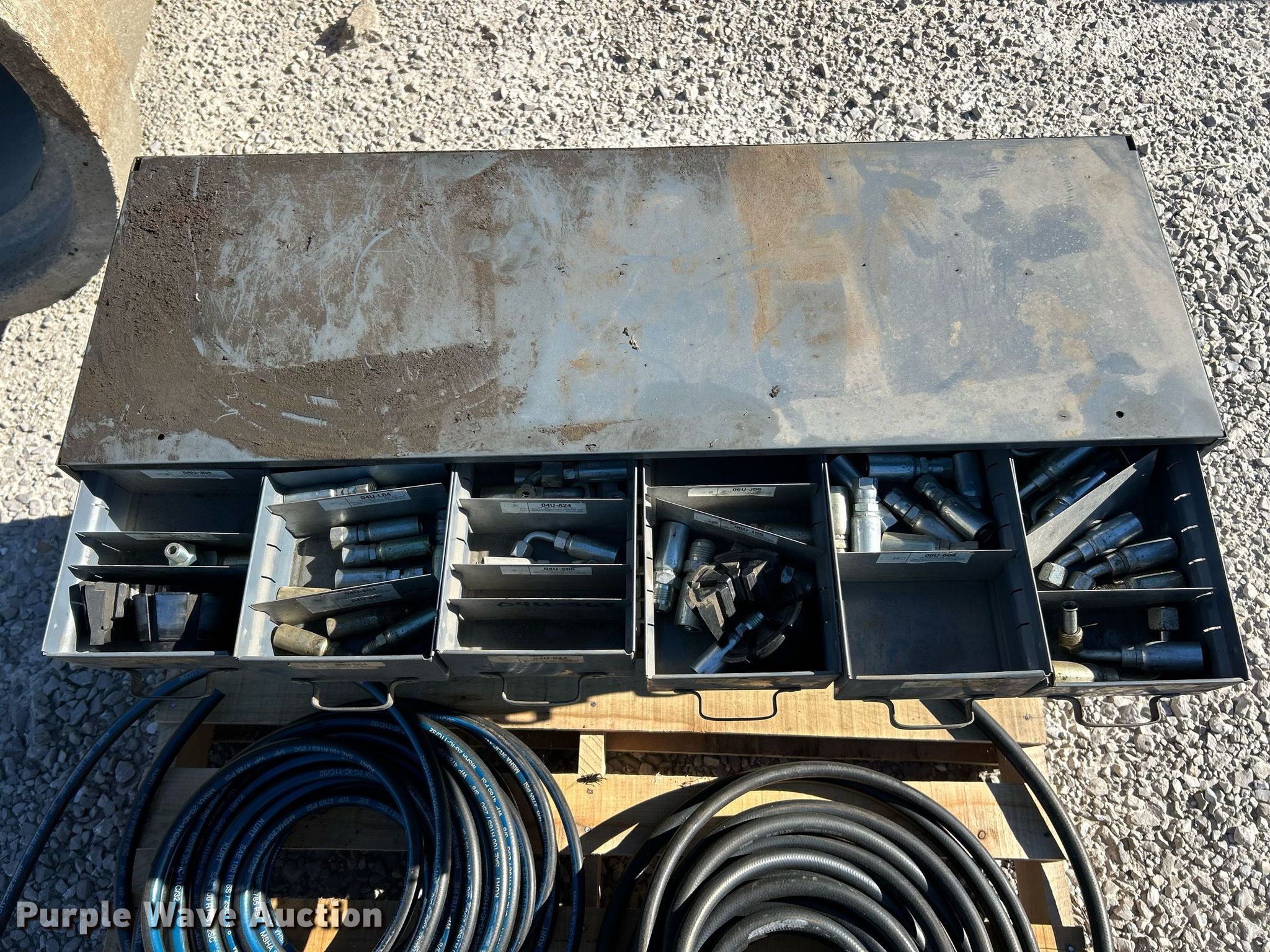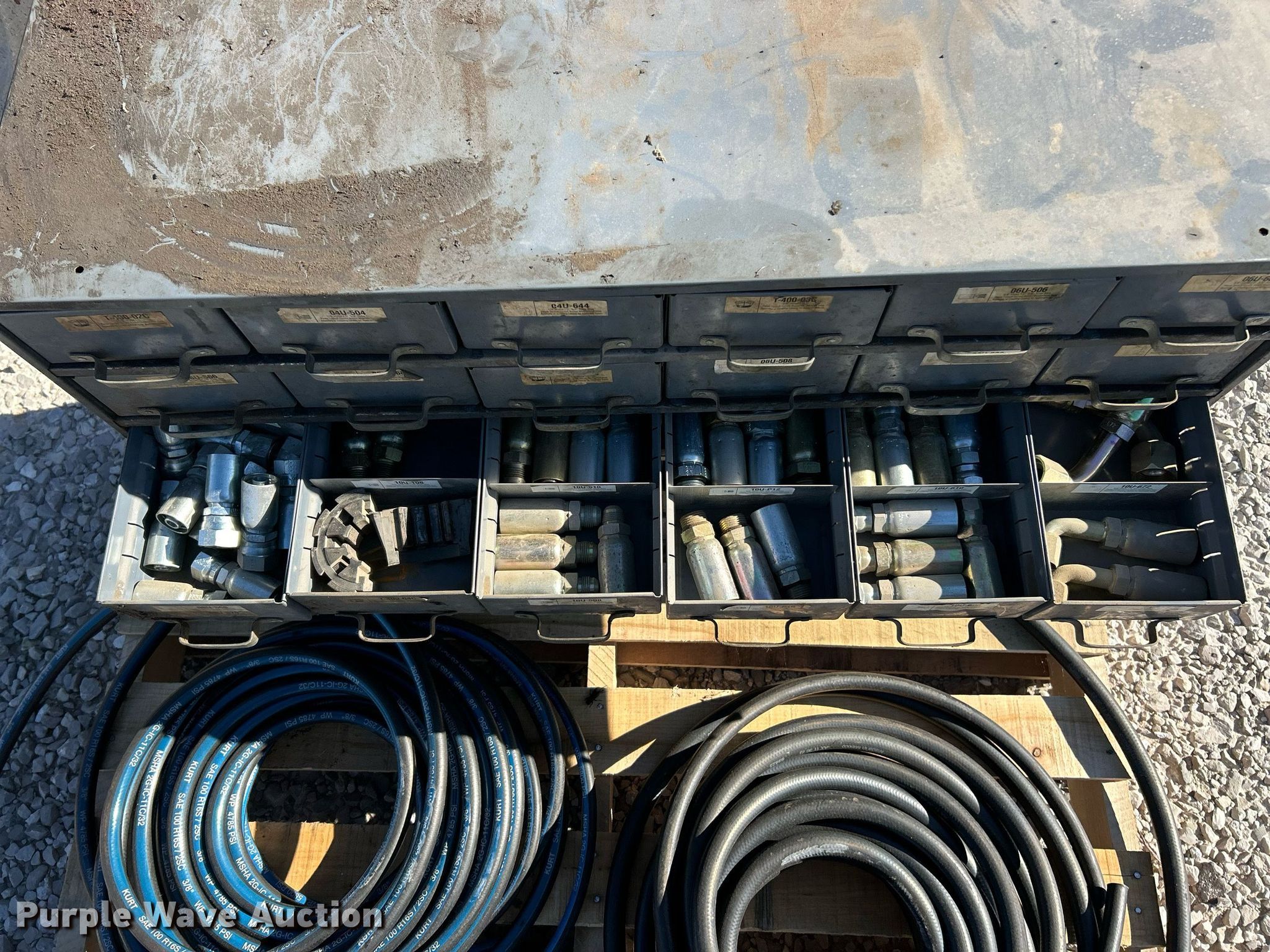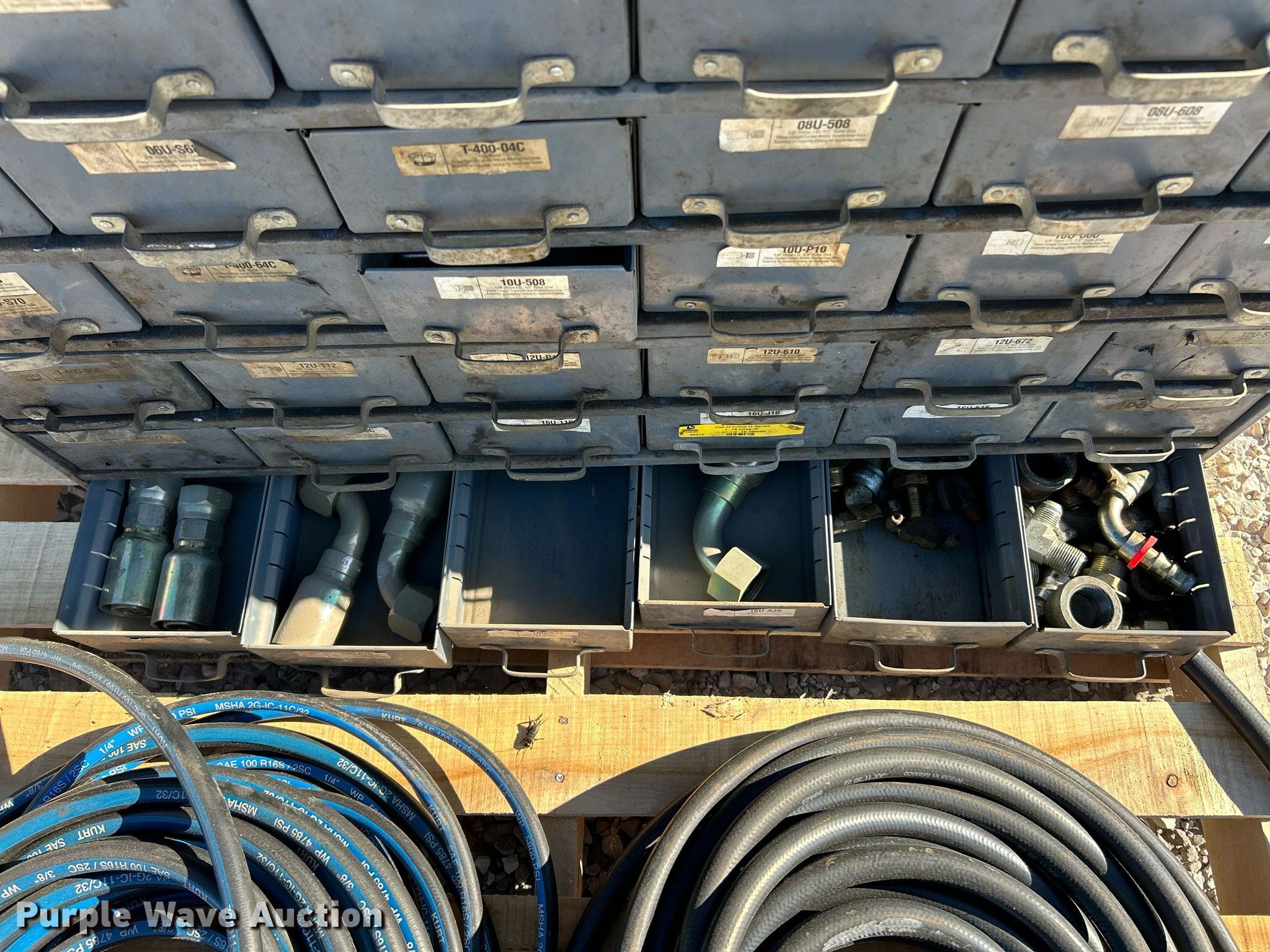 Purple Wave is selling a used Tools in Illinois. This item is a Kurt hydraulic hoses and fittings with the following: Storage drawer organizer included
