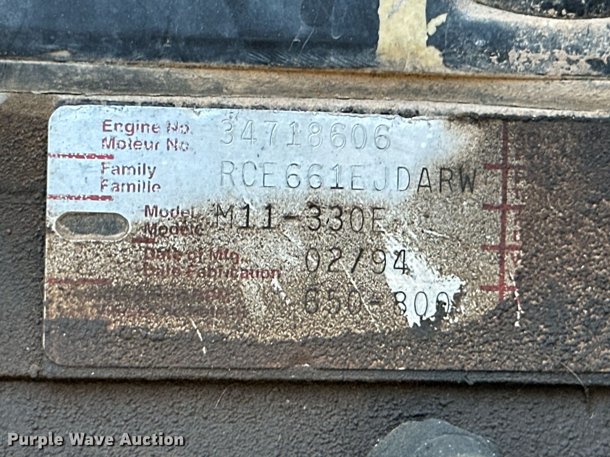 1994 Ford L9000 semi truck. Miles: 633,697 on odometer, VIN: 1FDYY95V3RVA43490. Engine Cummins M11, Displacement: 10.8L, Cylinders: 6, Fuel type: Diesel. Transmission Eaton Fuller, Manual, Speed: 10. Chassis Axles: Tandem, Differential lock: Inter-axel, Suspension: Spring, Brakes: Air. Interior AC, Heat, Air ride cab. Features Deck plate: Aluminum, Fifth wheel type: Air operated, Sliding, Fuel tank: Dual. Tires Size: 11R22.5. Texas title. Title distribution may be delayed up to 14 days from verification of funds. Taylor County Precinct 3. Buffalo Gap, TX 79508