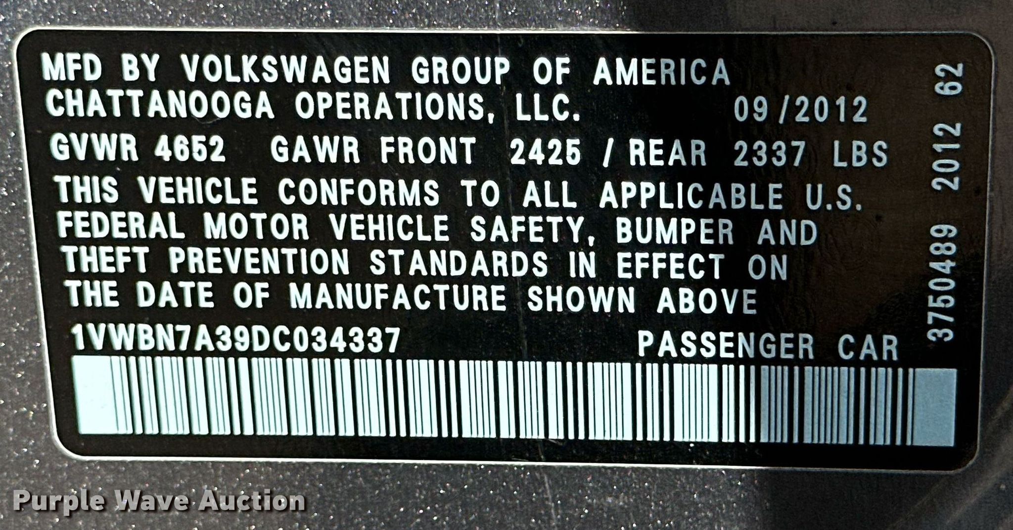 - VIN: 1VWBN7A39DC034337