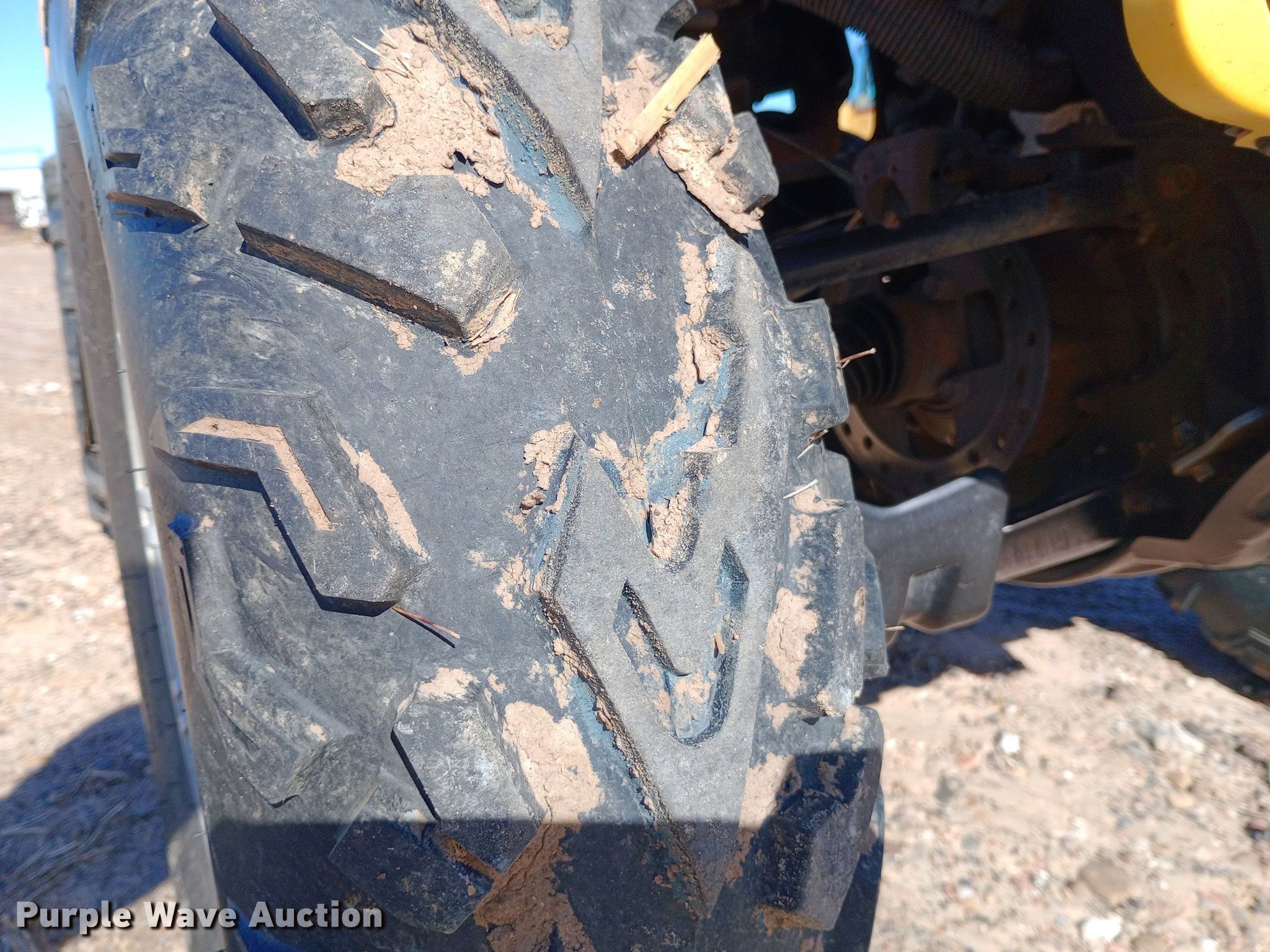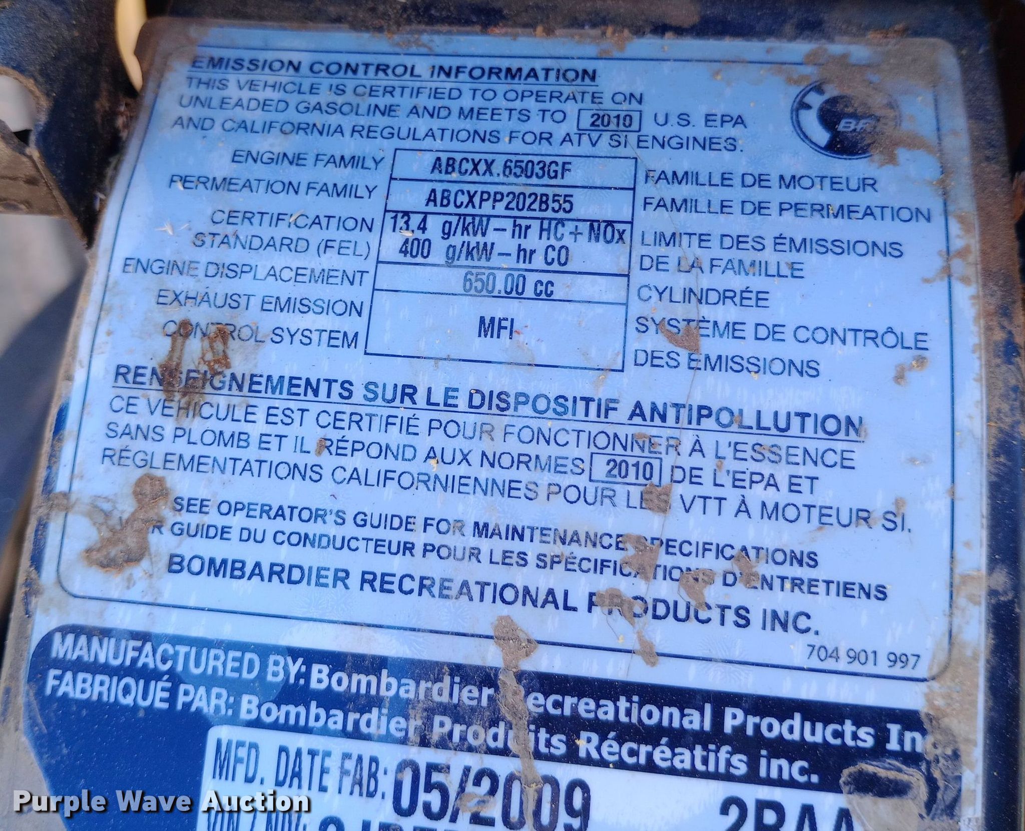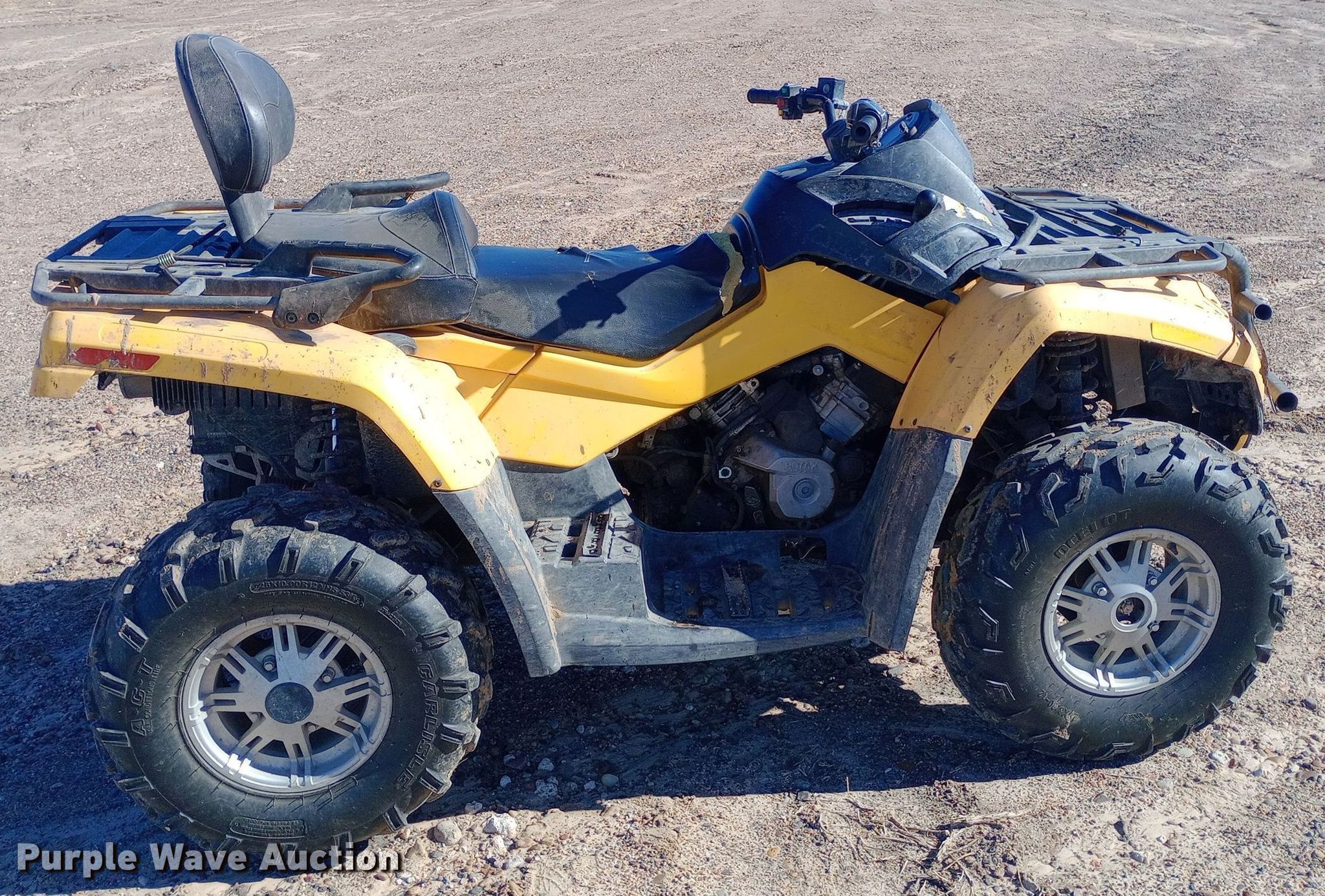 2010 Can-Am ATV. Miles: 6,262 on odometer, Hours: 710 on meter, VIN: 3JBEMCJ1XAJ000030. Engine Rotax, Displacement: 650 cc, Cylinders: 2, Fuel type: Gas, Electric start. Transmission Automatic. Chassis Four wheel drive/ All wheel drive. Features Grille guard. Tires Front: 26x8.00-12, Rear: 255/70R12. Notes Right rear CV axle damaged. Transfer of ownership documentation will be a bill of sale. Premier Alfalfa Inc. Ulysses, KS 67880