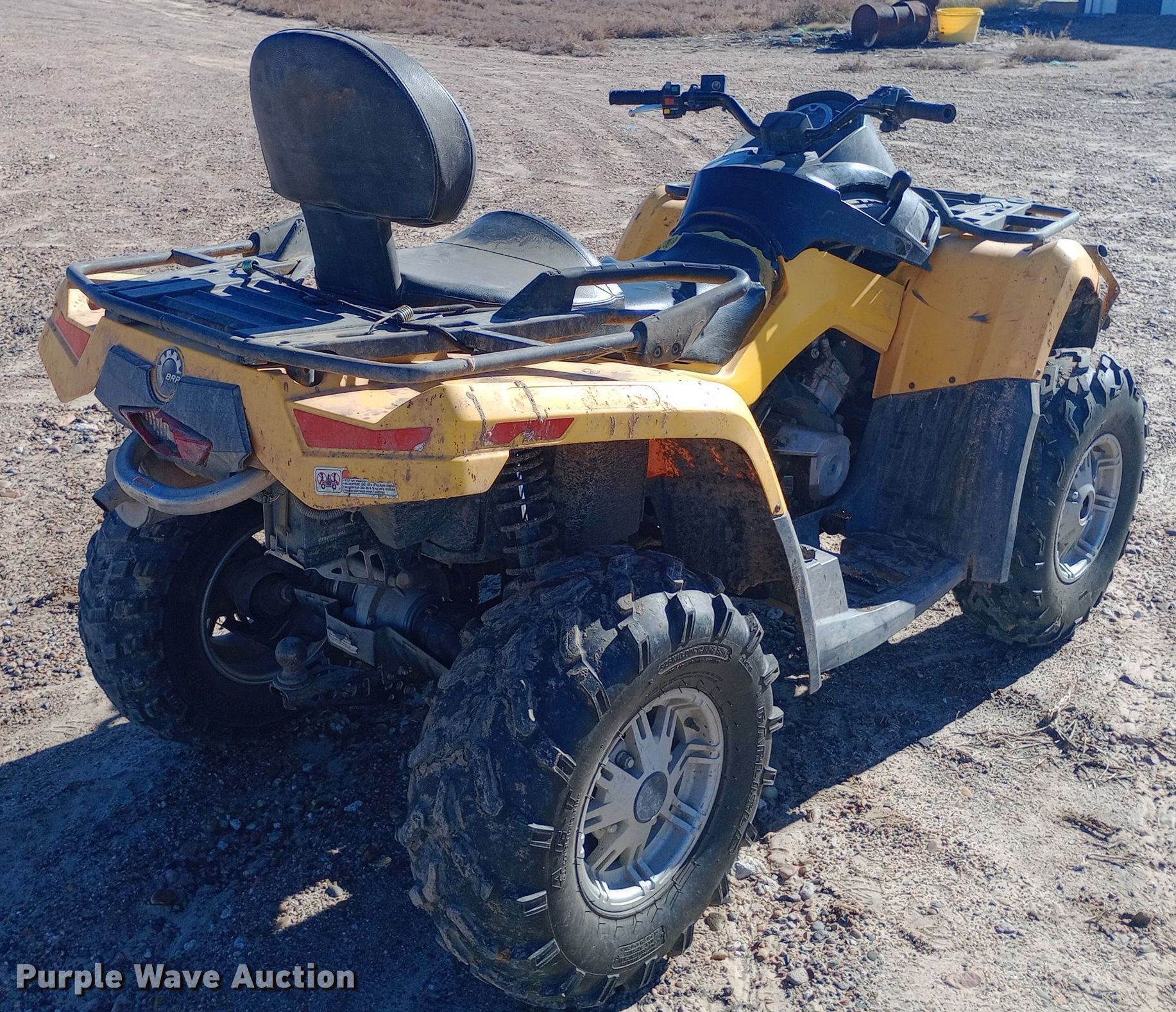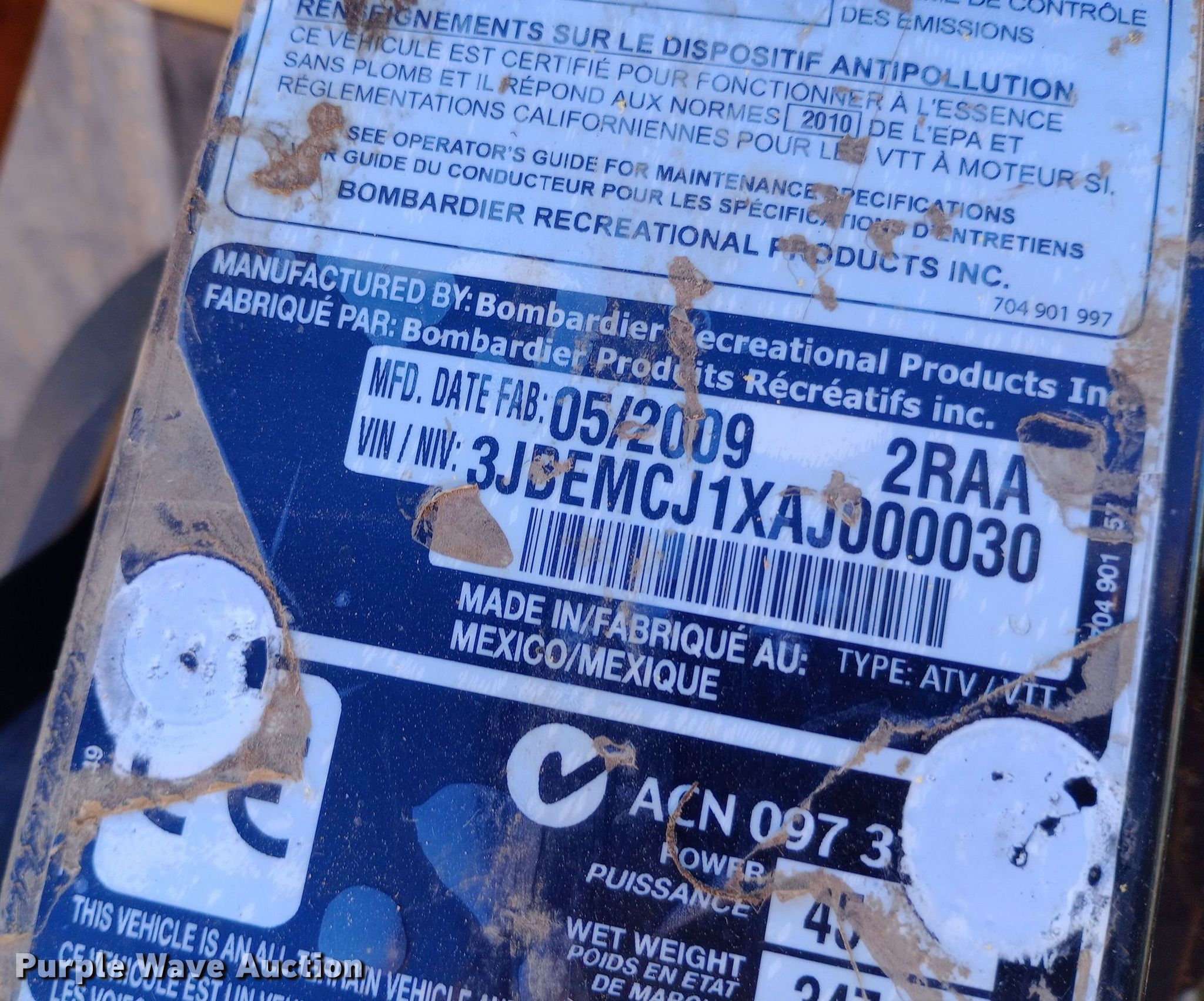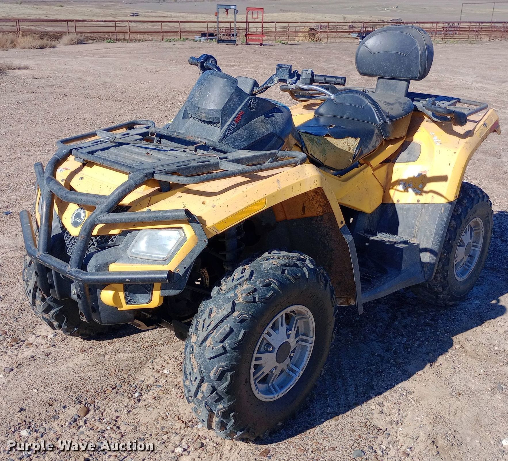 2010 Can-Am ATV. Miles: 6,262 on odometer, Hours: 710 on meter, VIN: 3JBEMCJ1XAJ000030. Engine Rotax, Displacement: 650 cc, Cylinders: 2, Fuel type: Gas, Electric start. Transmission Automatic. Chassis Four wheel drive/ All wheel drive. Features Grille guard. Tires Front: 26x8.00-12, Rear: 255/70R12. Notes Right rear CV axle damaged. Transfer of ownership documentation will be a bill of sale. Premier Alfalfa Inc. Ulysses, KS 67880